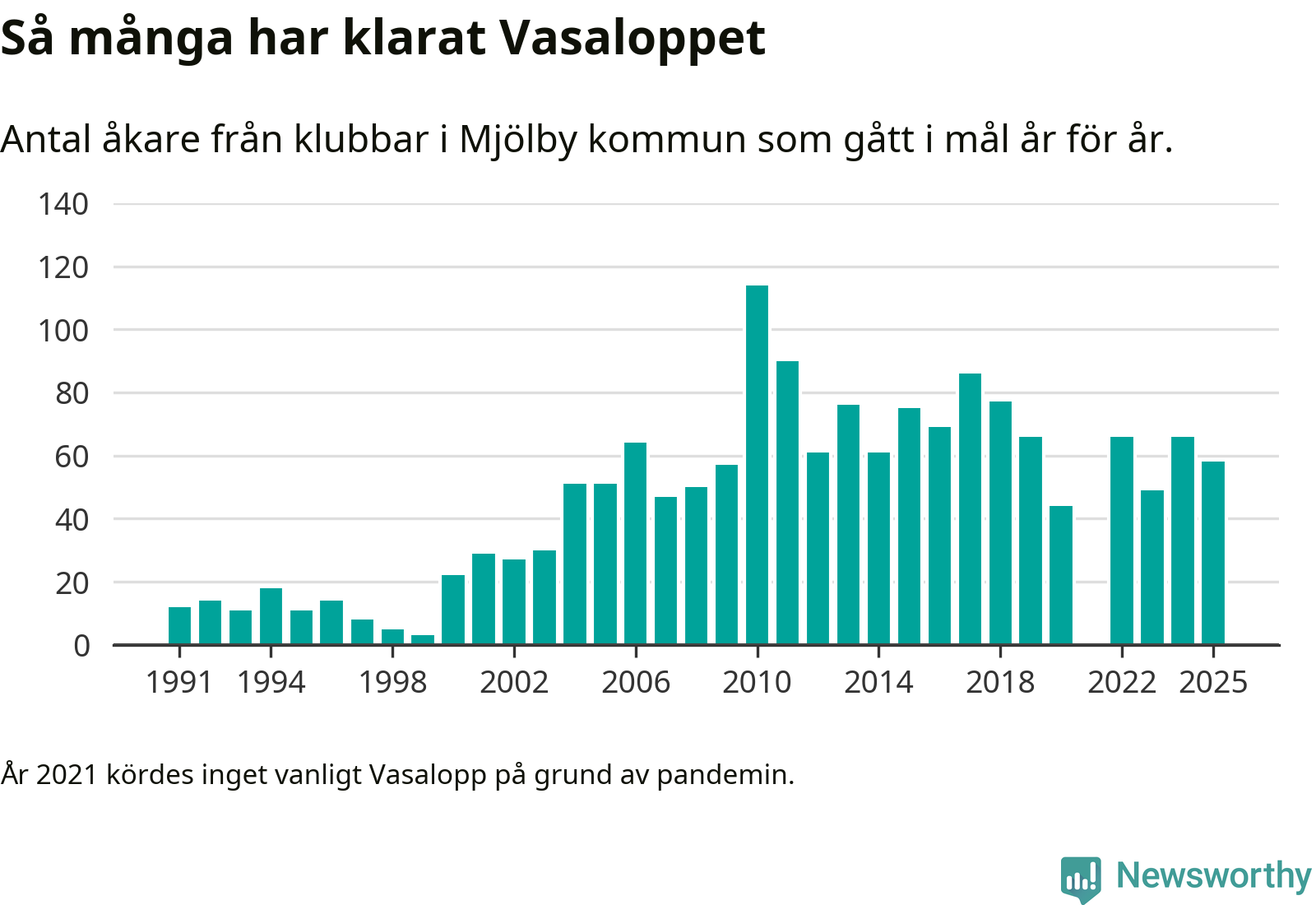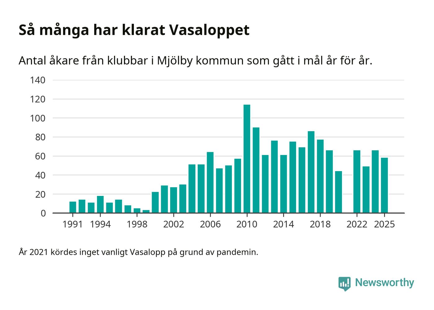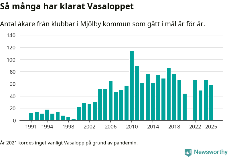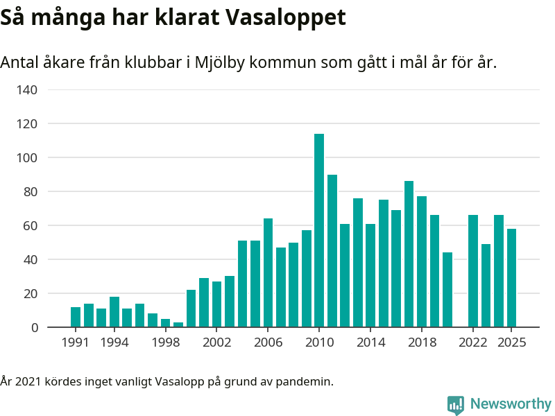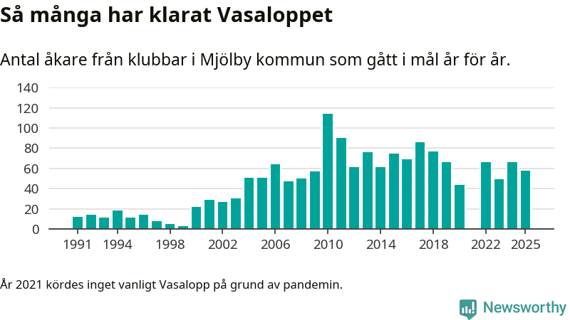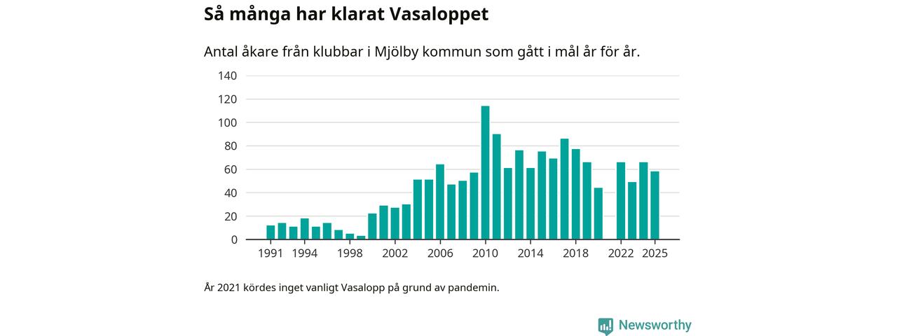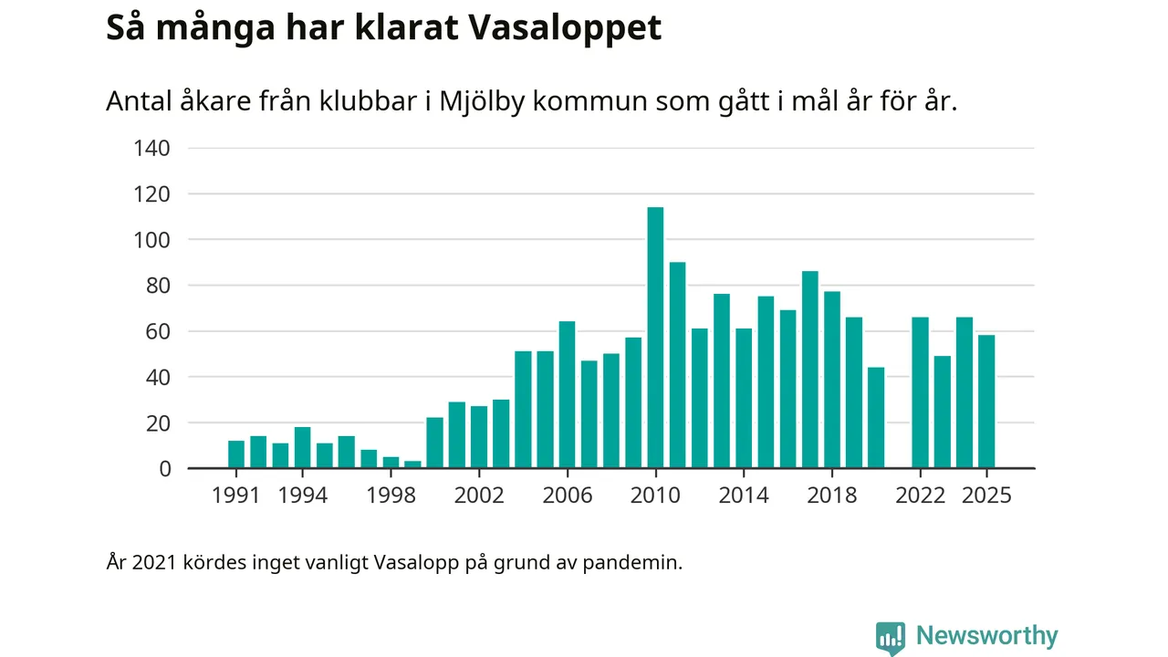 På söndag går starten för det 102:a Vasaloppet. Newsworthy har samlat in och sammanställt samtliga Vasaloppsresultat sedan 1991. Det ger en unik bild av hur skidåkare från klubbar i Mjölby kommun har klarat sig genom åren.