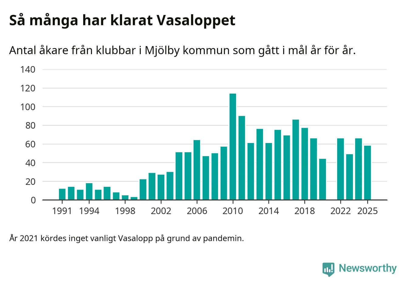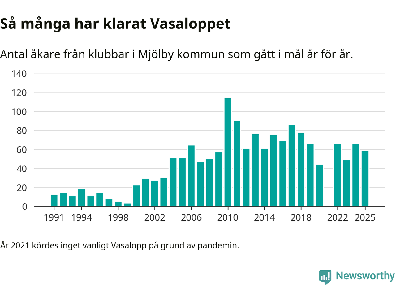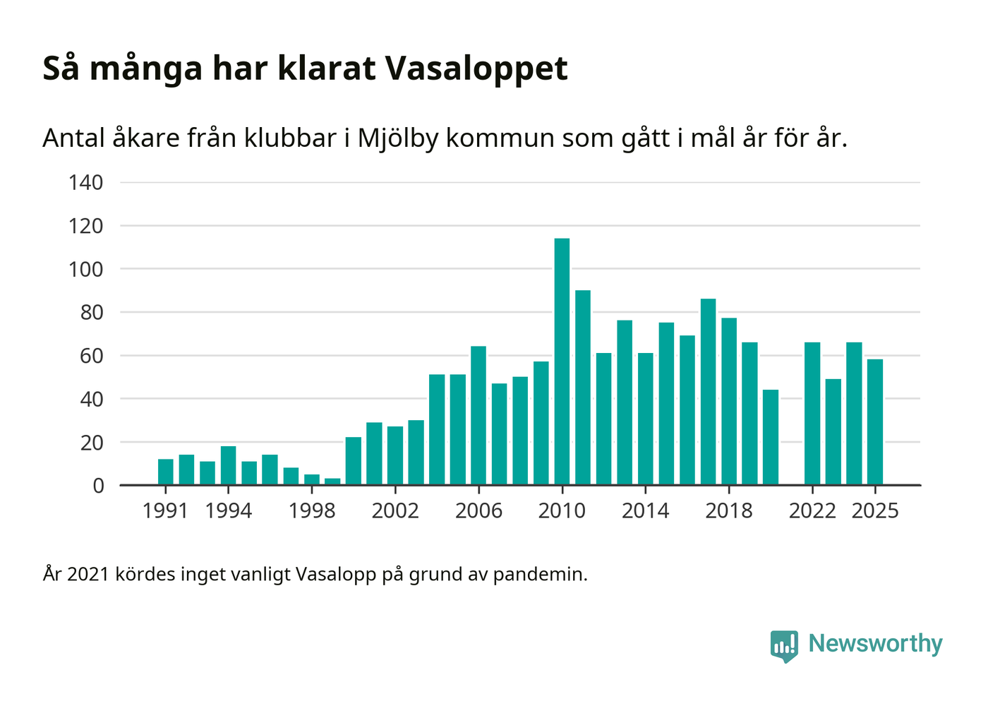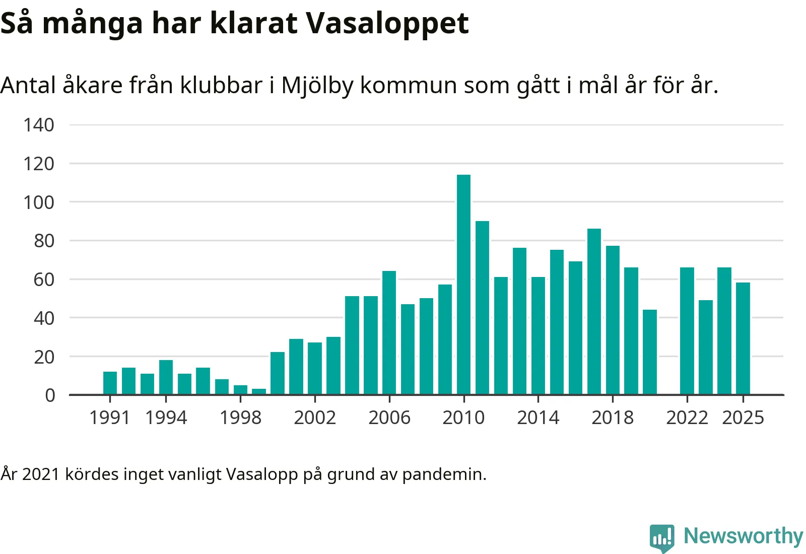 På söndag går starten för det 102:a Vasaloppet. Newsworthy har samlat in och sammanställt samtliga Vasaloppsresultat sedan 1991. Det ger en unik bild av hur skidåkare från klubbar i Mjölby kommun har klarat sig genom åren.