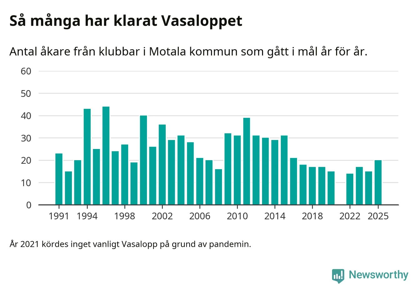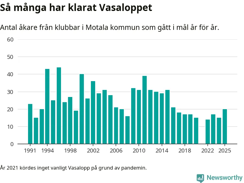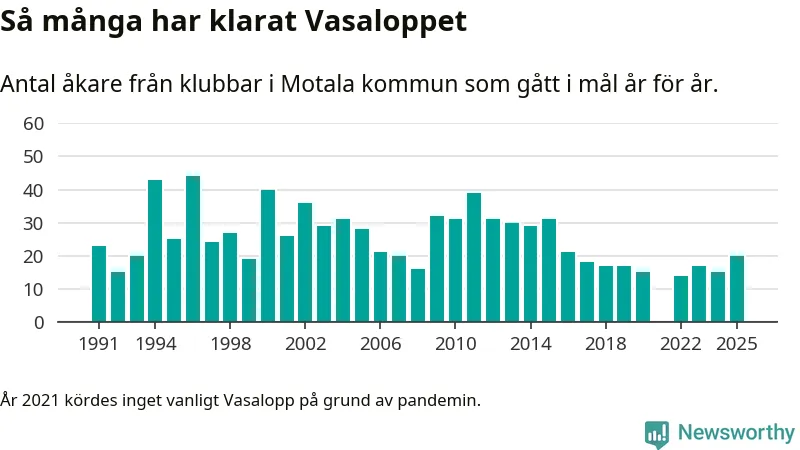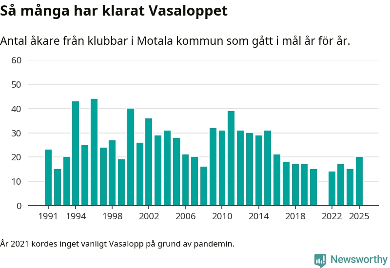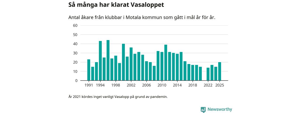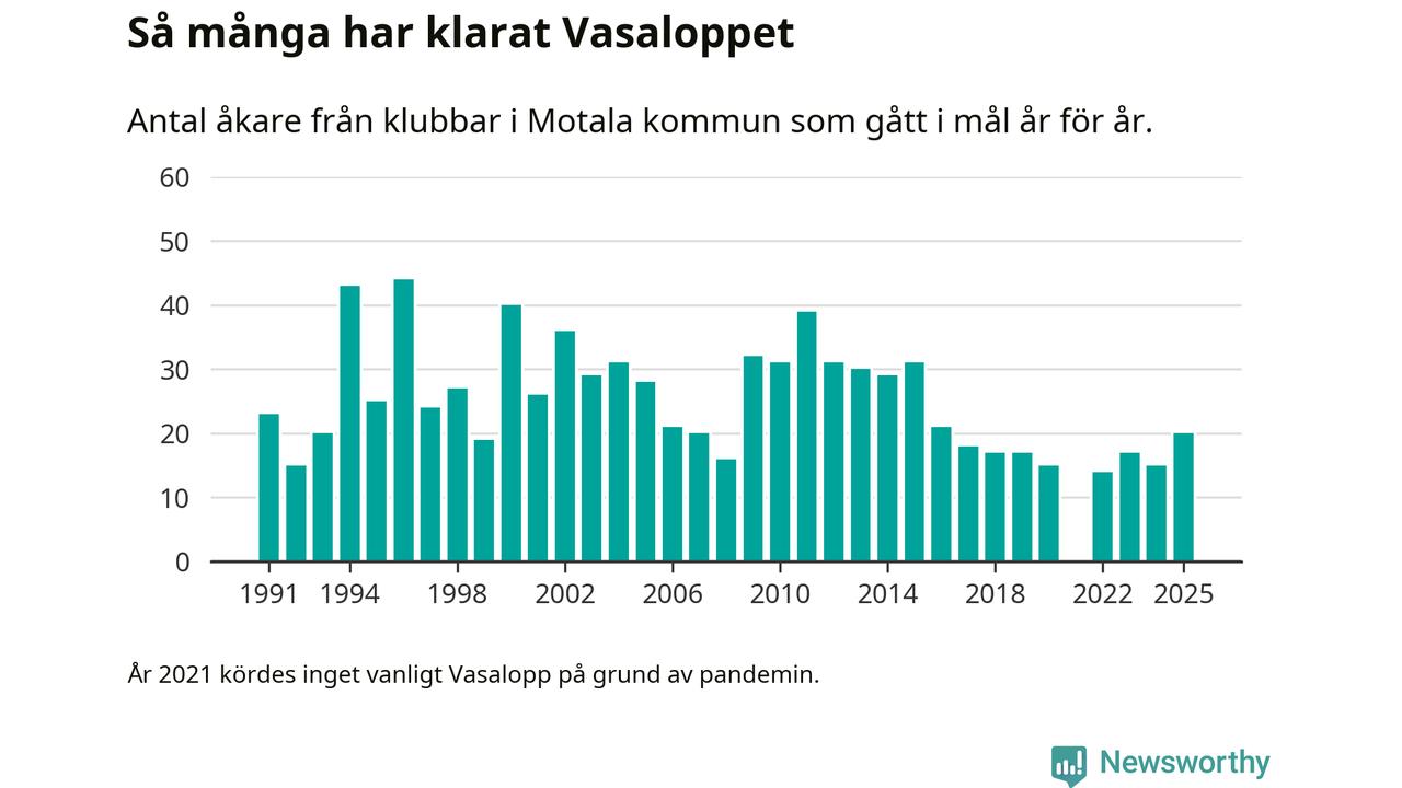 På söndag går starten för det 102:a Vasaloppet. Newsworthy har samlat in och sammanställt samtliga Vasaloppsresultat sedan 1991. Det ger en unik bild av hur skidåkare från klubbar i Motala kommun har klarat sig genom åren.