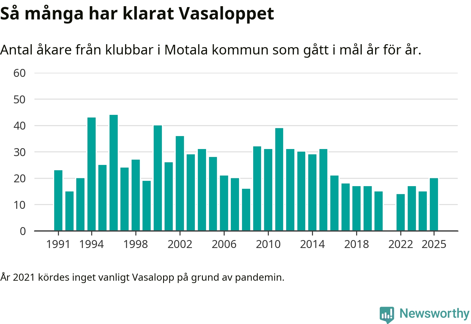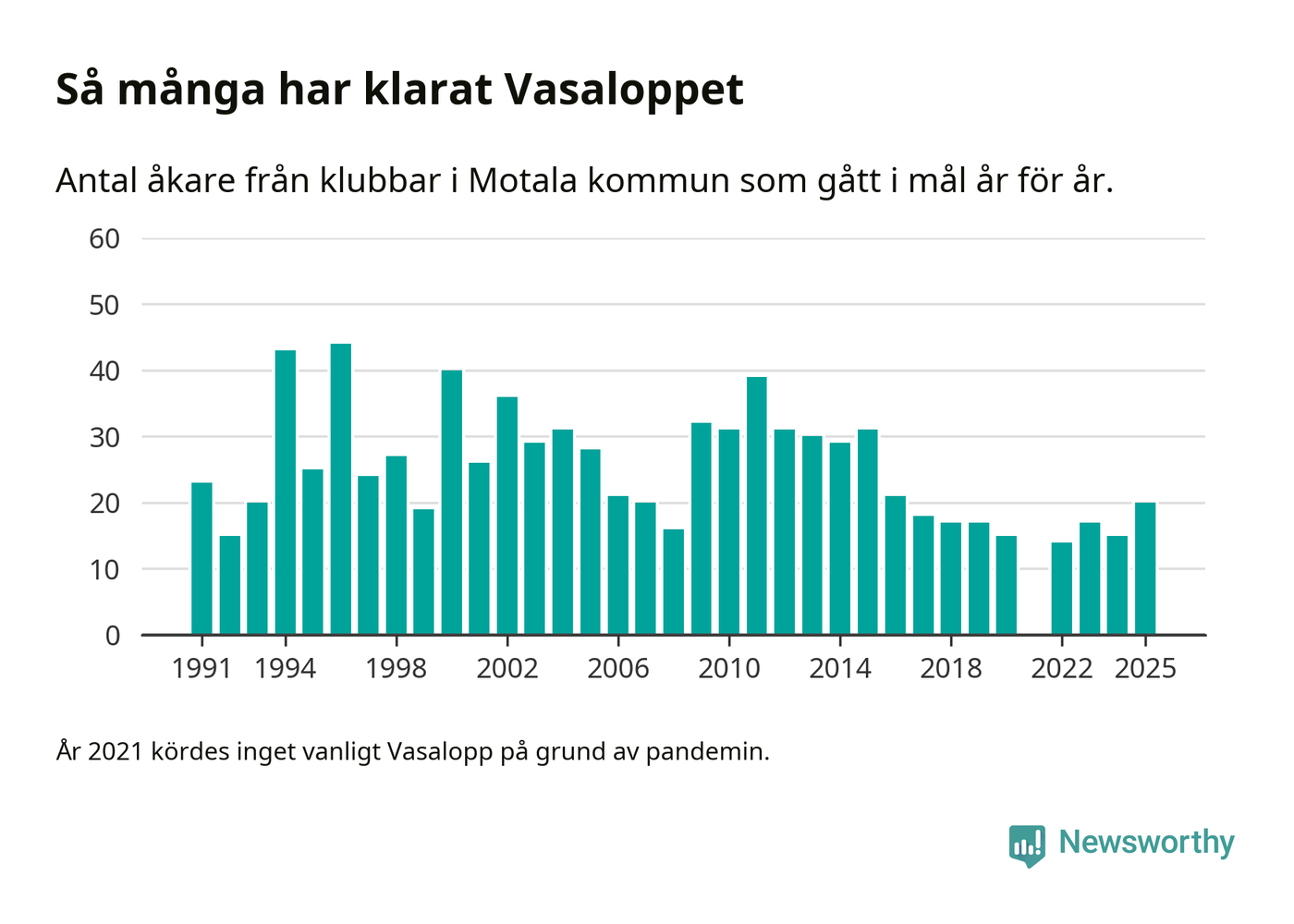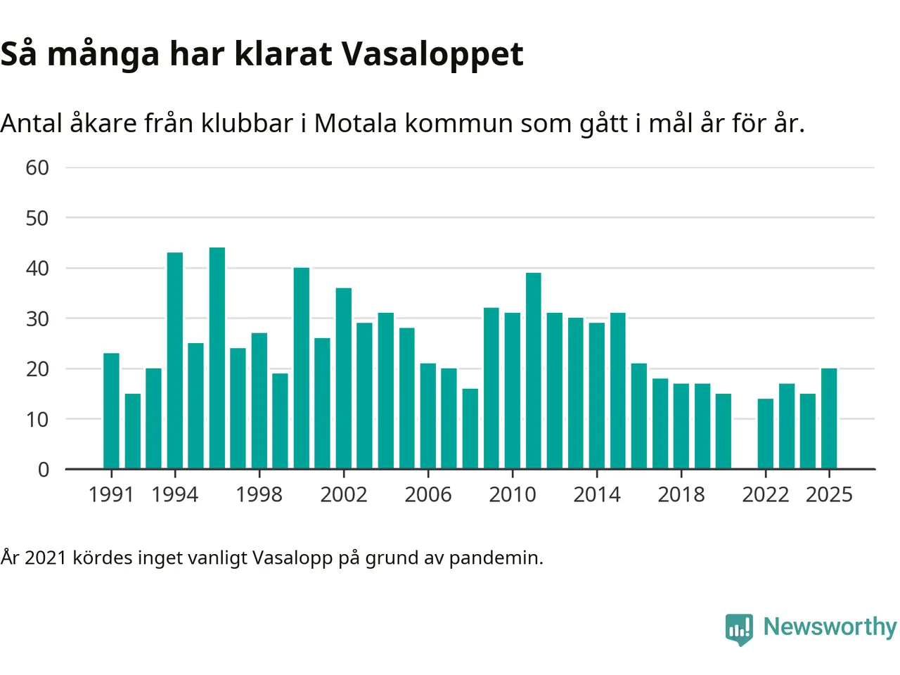 På söndag går starten för det 102:a Vasaloppet. Newsworthy har samlat in och sammanställt samtliga Vasaloppsresultat sedan 1991. Det ger en unik bild av hur skidåkare från klubbar i Motala kommun har klarat sig genom åren.