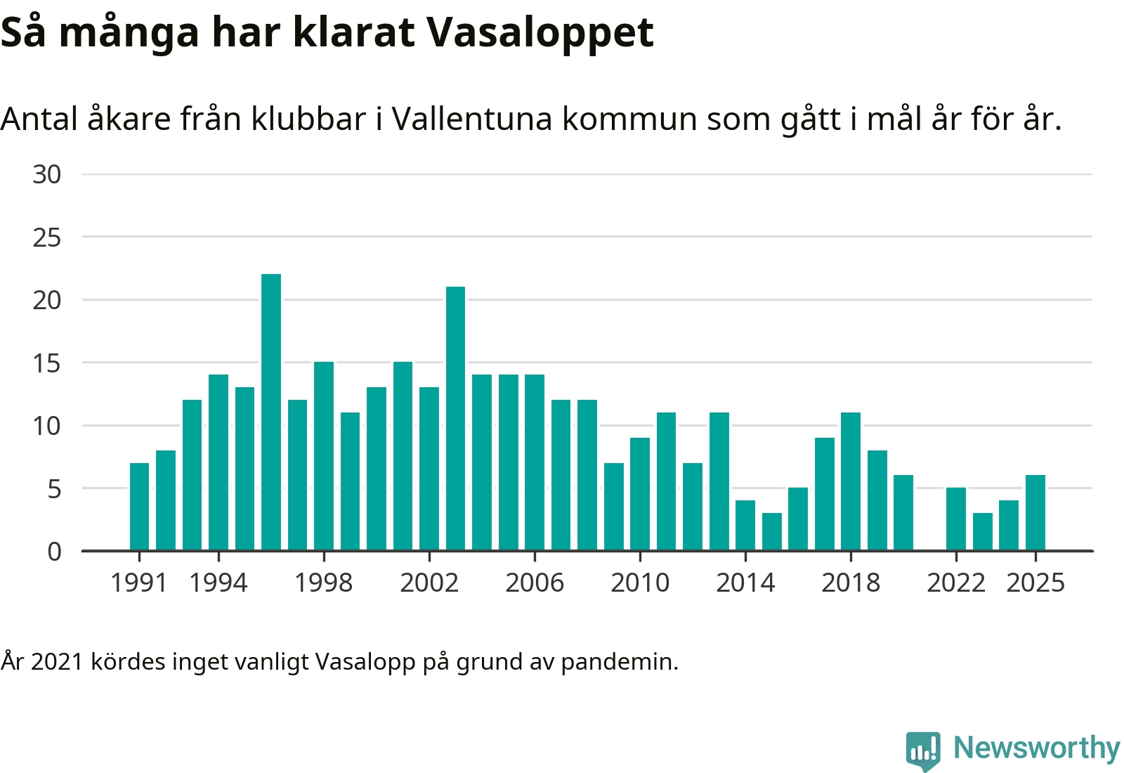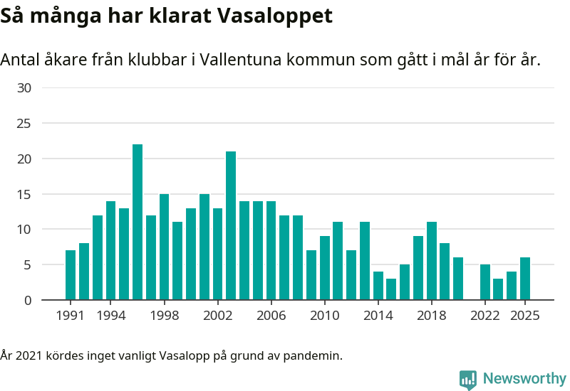 På söndag går starten för det 102:a Vasaloppet. Newsworthy har samlat in och sammanställt samtliga Vasaloppsresultat sedan 1991. Det ger en unik bild av hur skidåkare från klubbar i Vallentuna kommun har klarat sig genom åren.