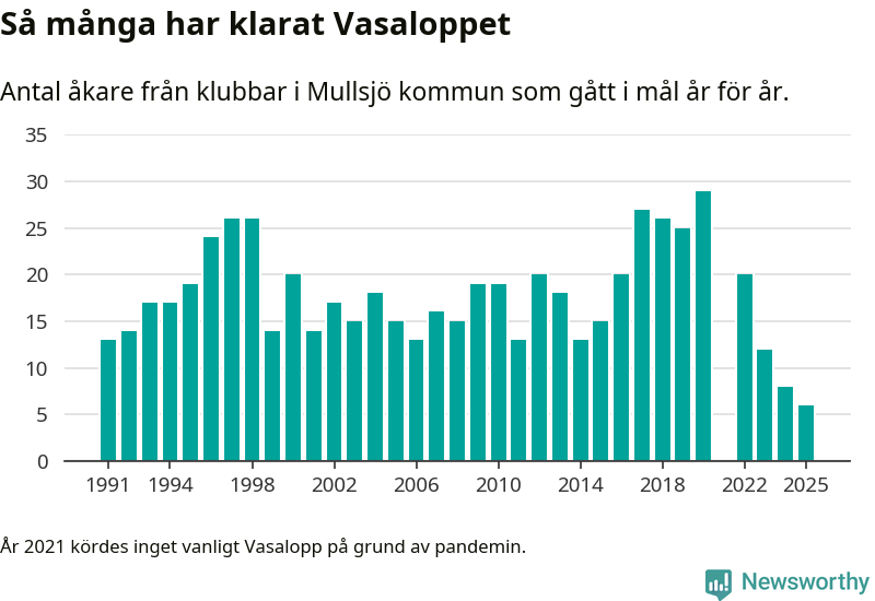 På söndag går starten för det 102:a Vasaloppet. Newsworthy har samlat in och sammanställt samtliga Vasaloppsresultat sedan 1991. Det ger en unik bild av hur skidåkare från klubbar i Mullsjö kommun har klarat sig genom åren.