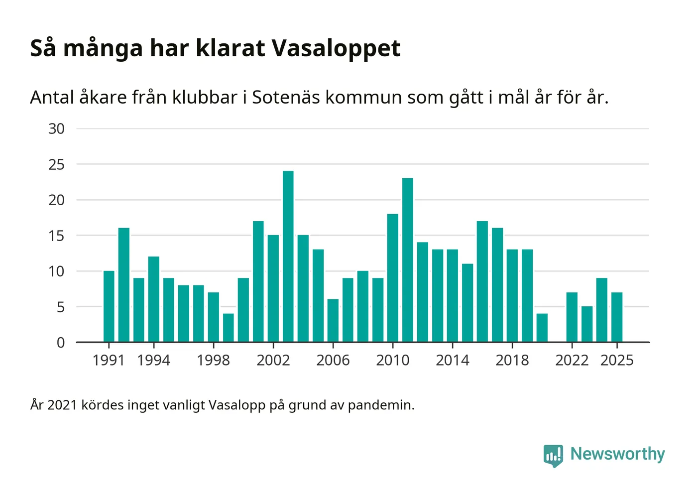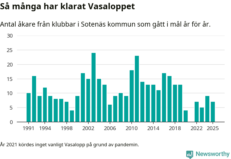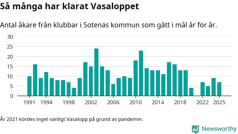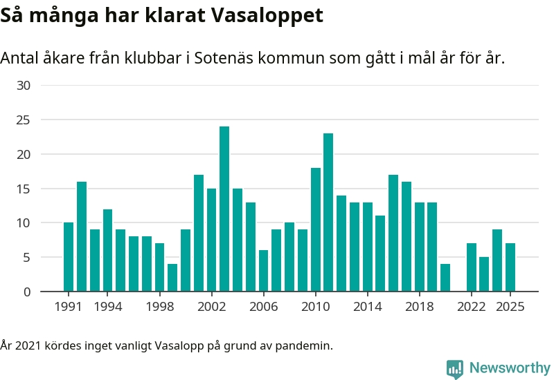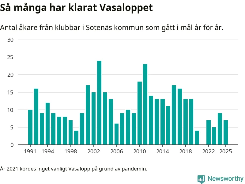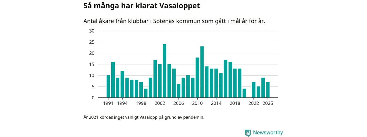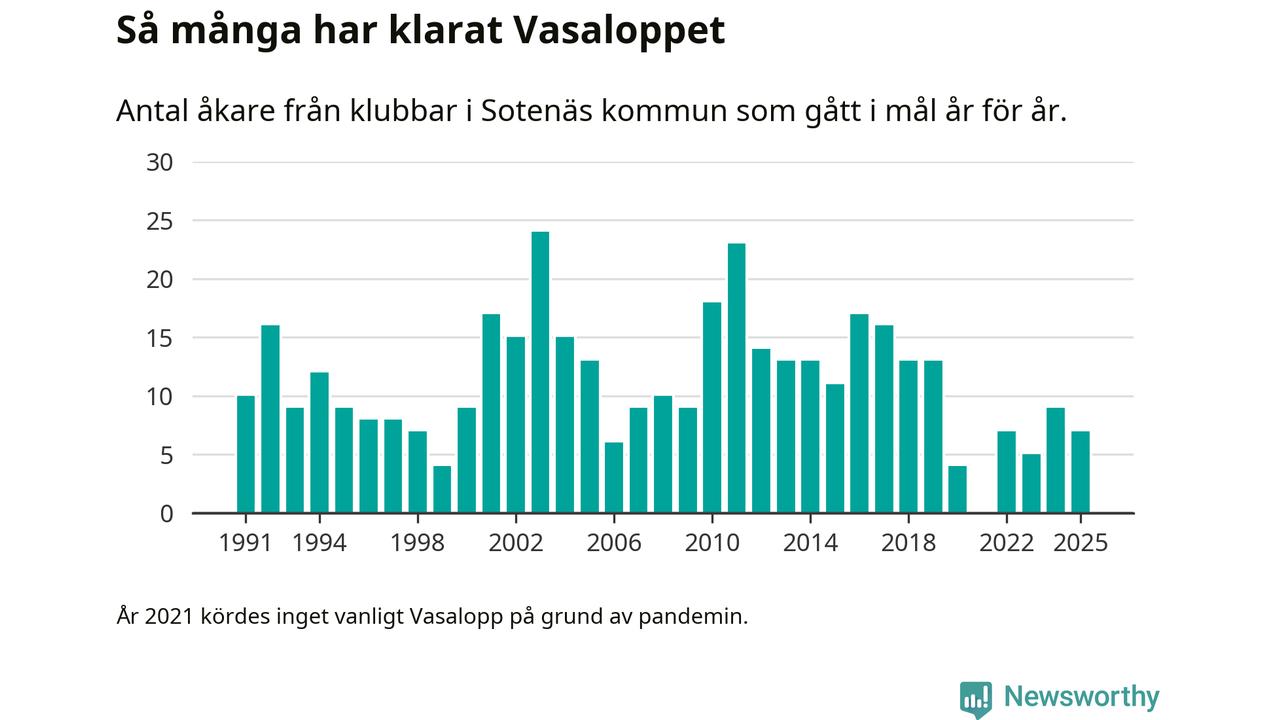 På söndag går starten för det 102:a Vasaloppet. Newsworthy har samlat in och sammanställt samtliga Vasaloppsresultat sedan 1991. Det ger en unik bild av hur skidåkare från klubbar i Sotenäs kommun har klarat sig genom åren.