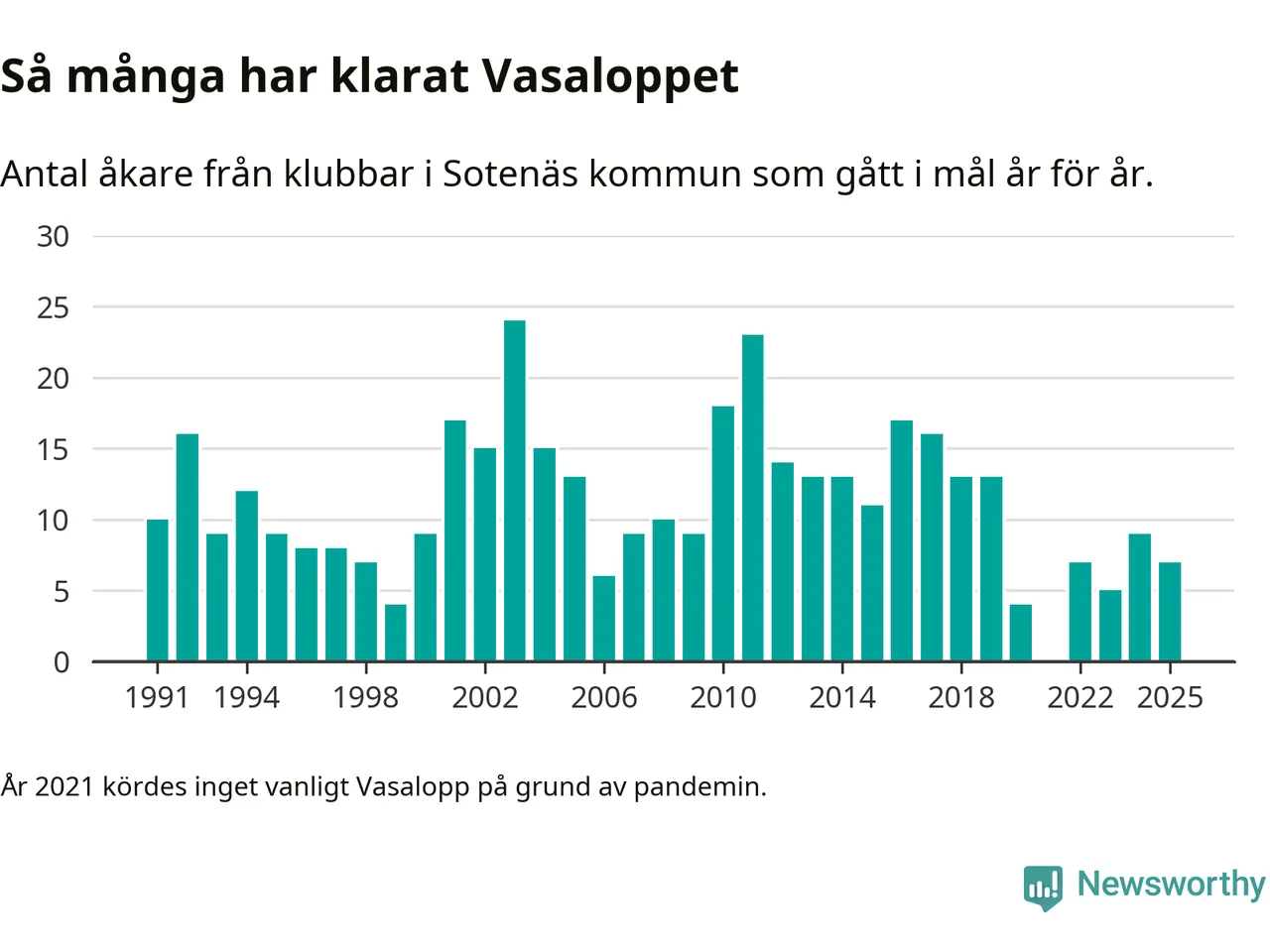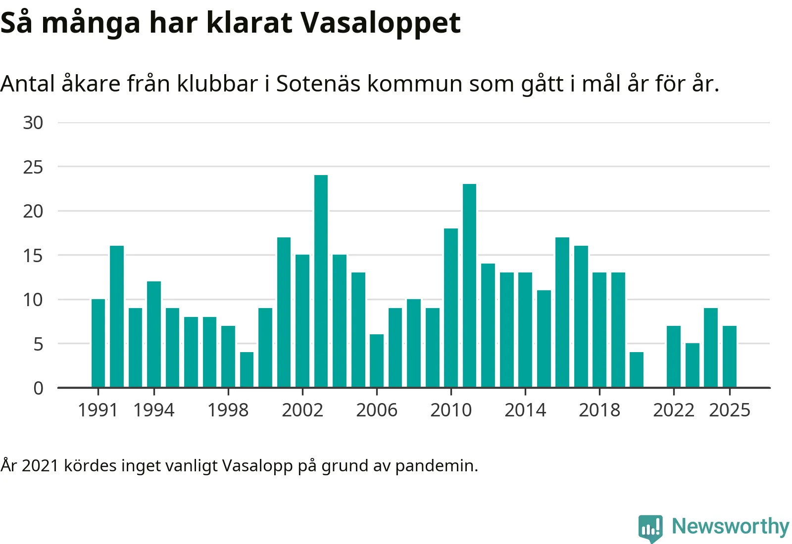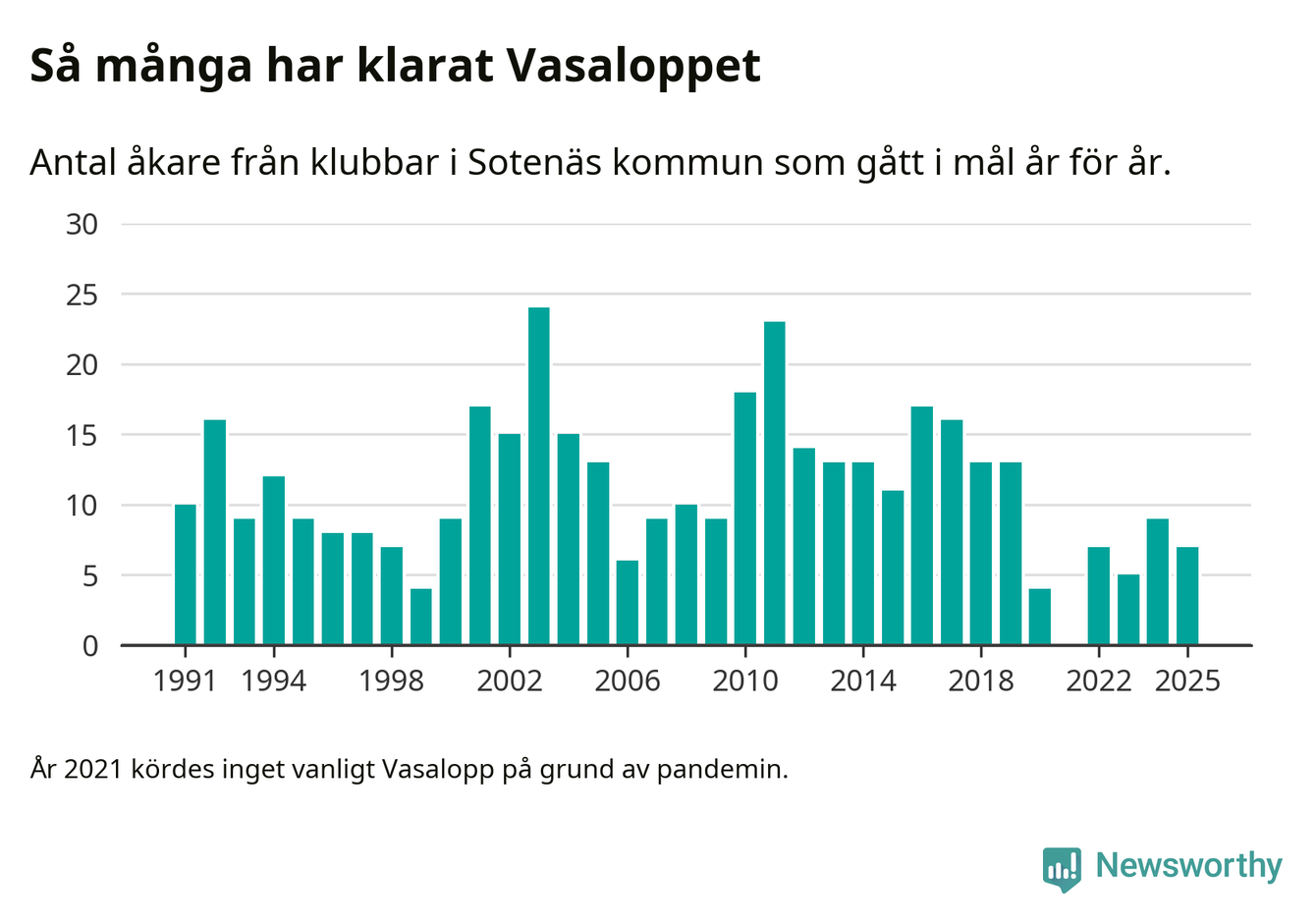På söndag går starten för det 102:a Vasaloppet. Newsworthy har samlat in och sammanställt samtliga Vasaloppsresultat sedan 1991. Det ger en unik bild av hur skidåkare från klubbar i Sotenäs kommun har klarat sig genom åren.