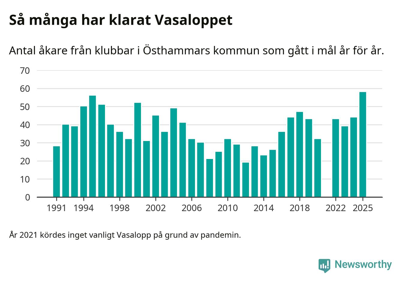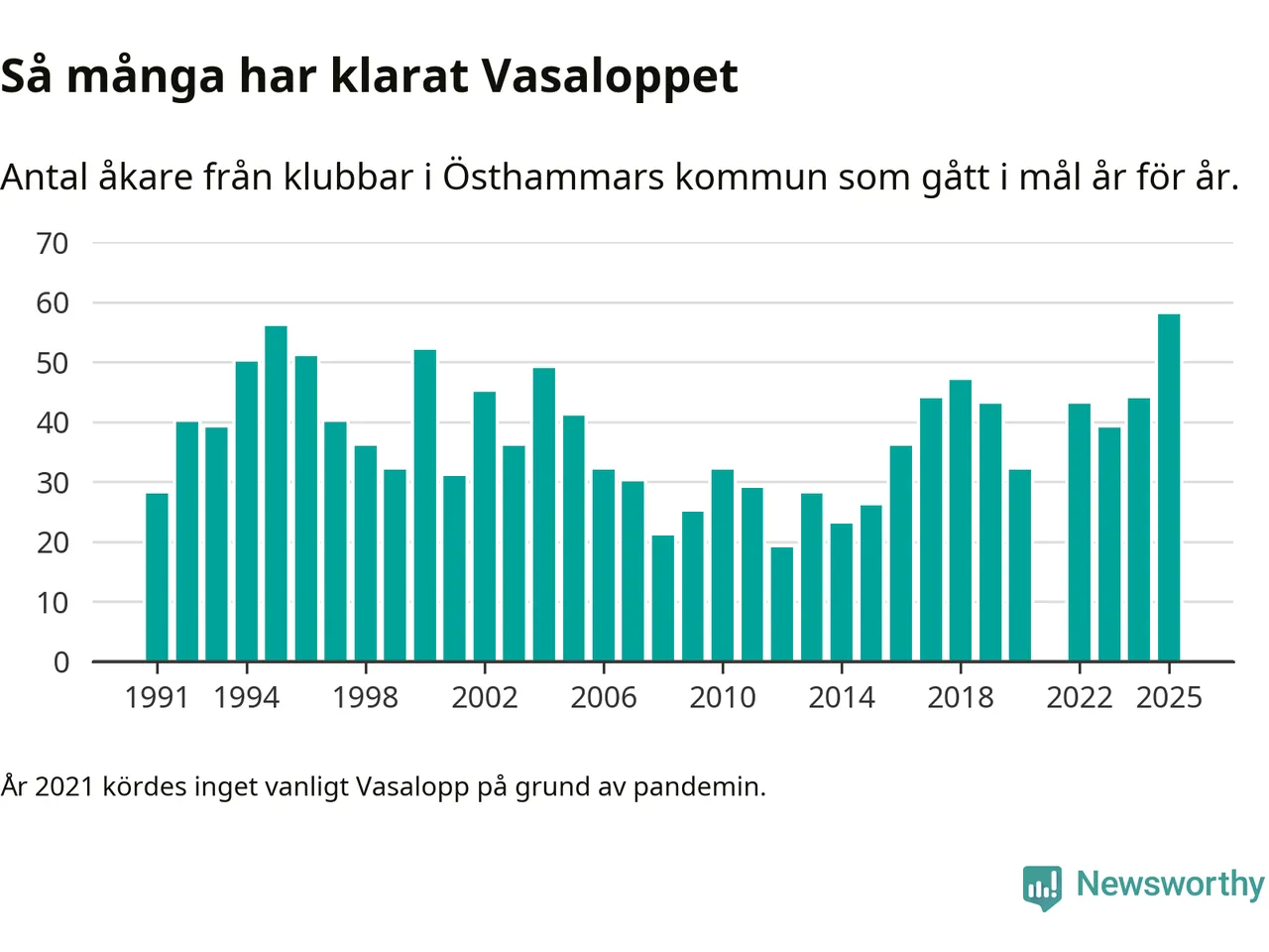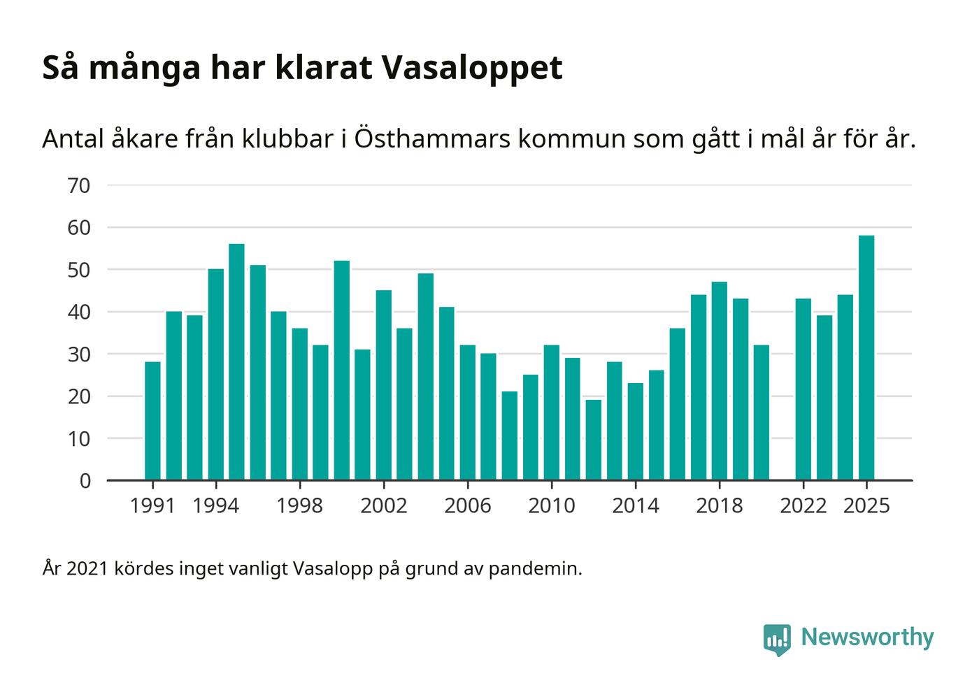 På söndag går starten för det 102:a Vasaloppet. Newsworthy har samlat in och sammanställt samtliga Vasaloppsresultat sedan 1991. Det ger en unik bild av hur skidåkare från klubbar i Östhammars kommun har klarat sig genom åren.