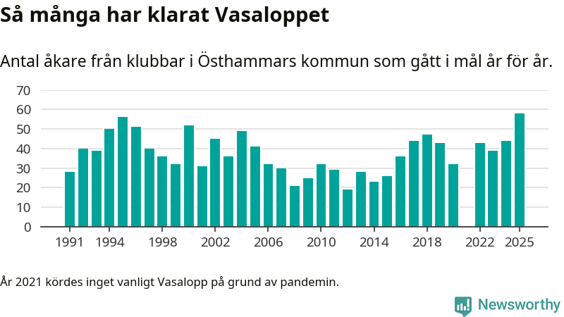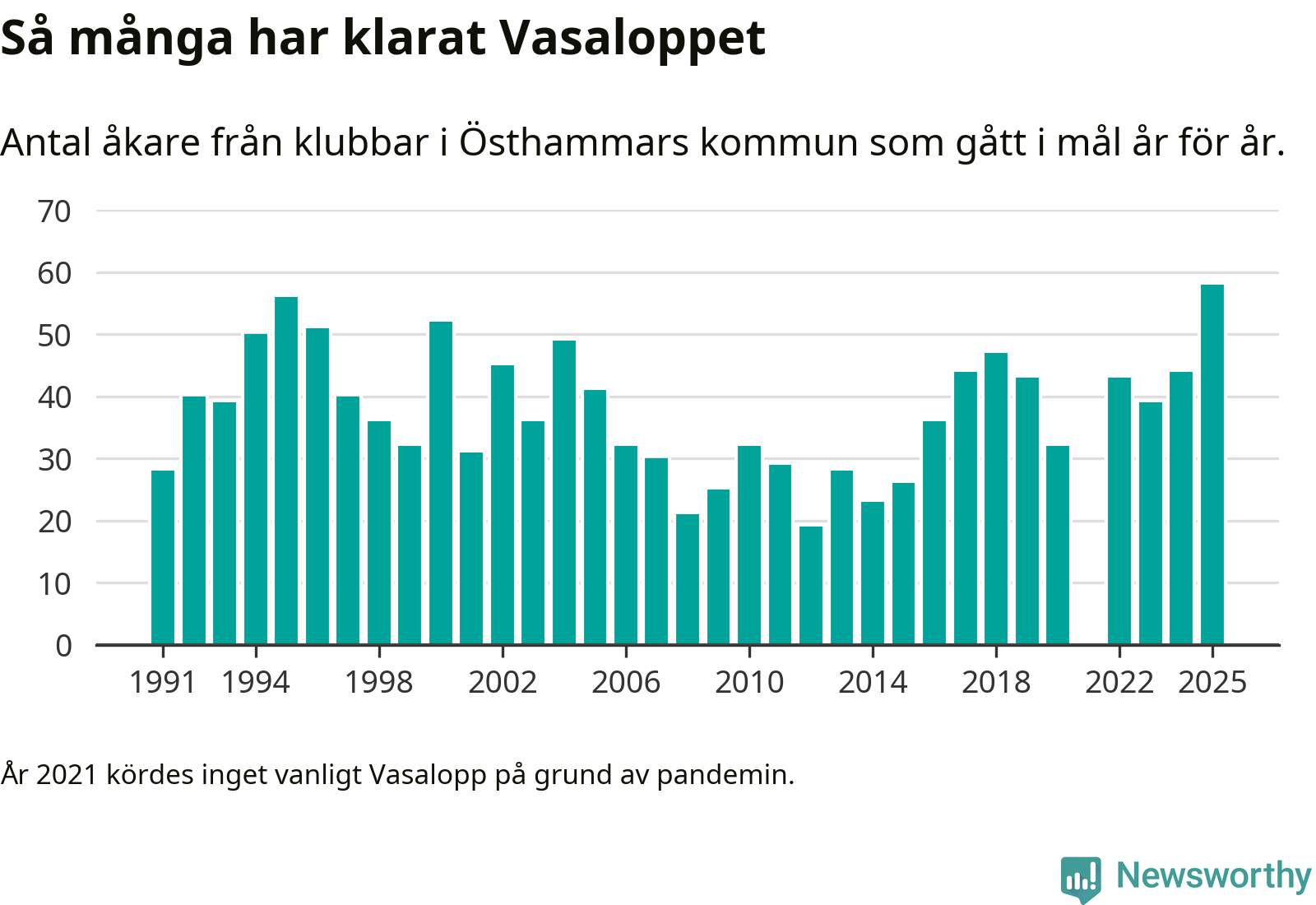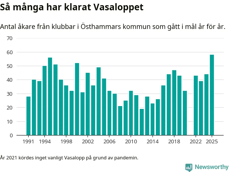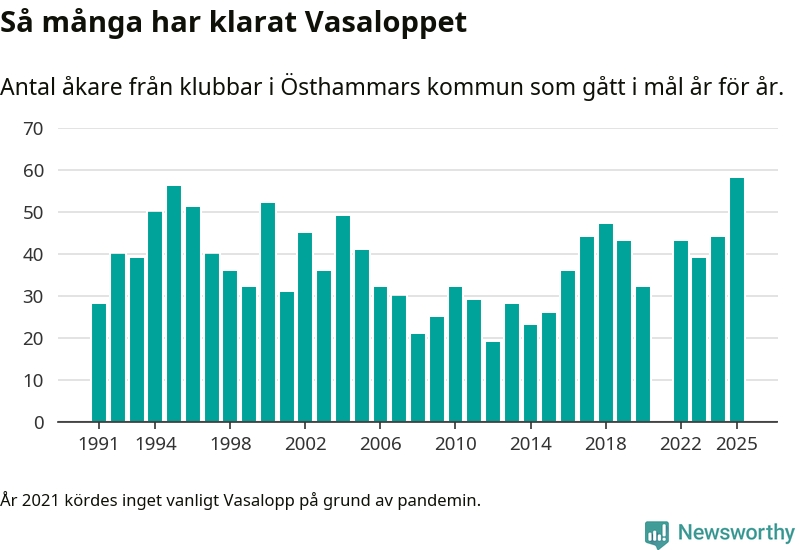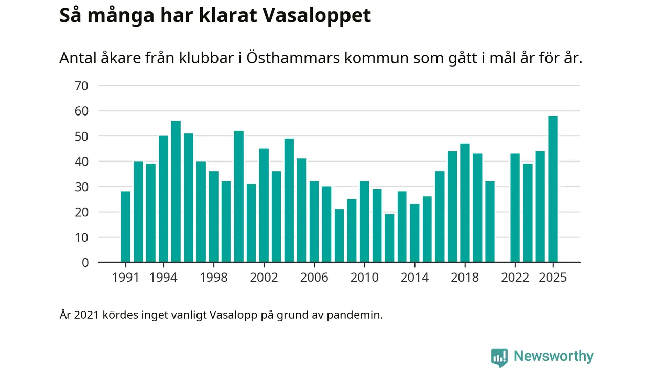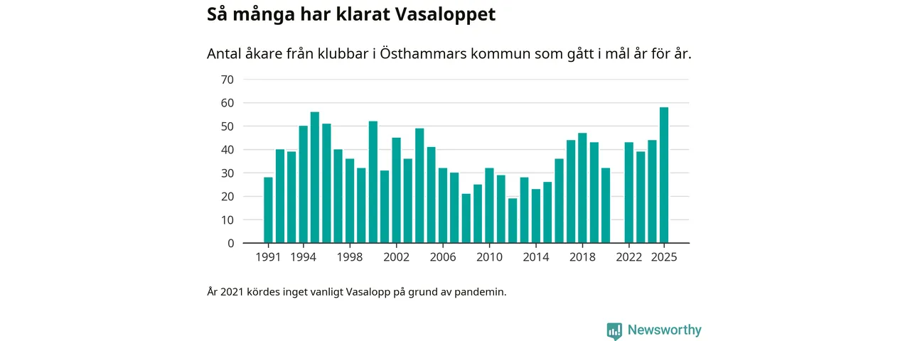 På söndag går starten för det 102:a Vasaloppet. Newsworthy har samlat in och sammanställt samtliga Vasaloppsresultat sedan 1991. Det ger en unik bild av hur skidåkare från klubbar i Östhammars kommun har klarat sig genom åren.