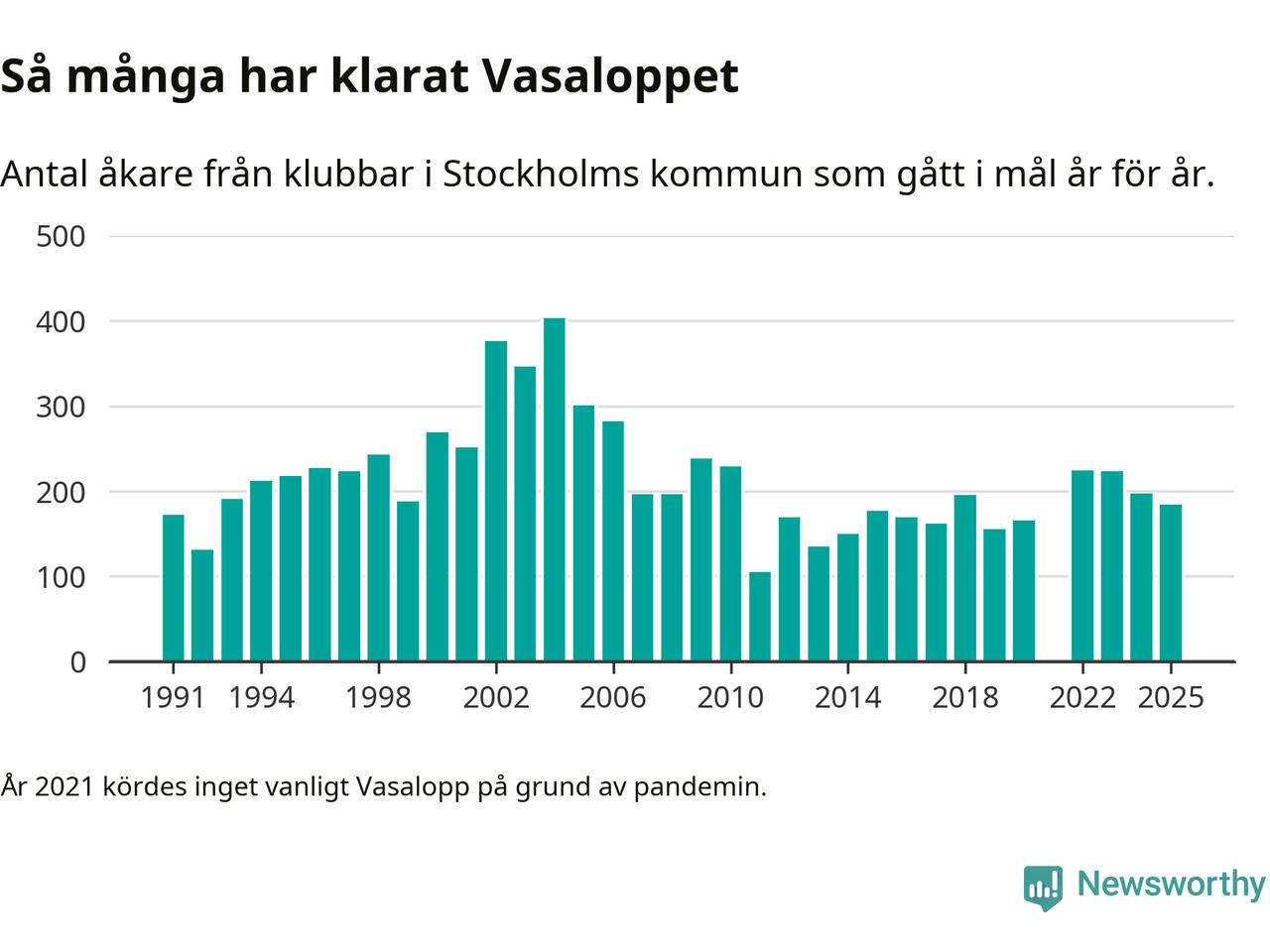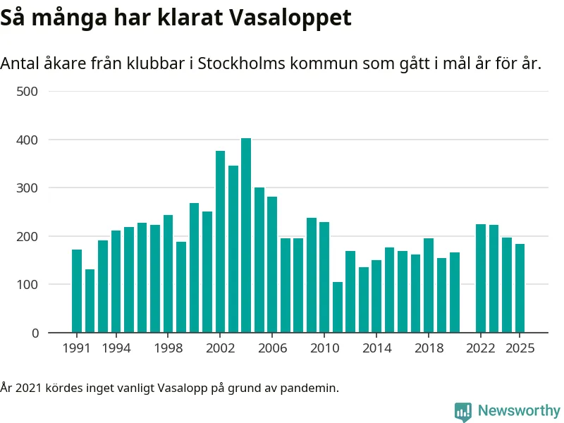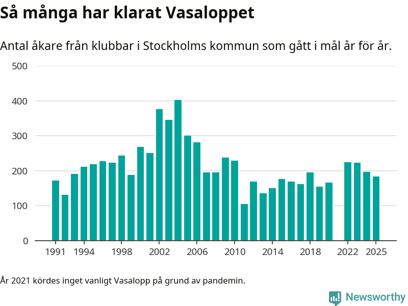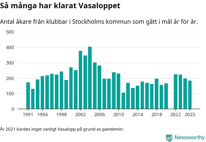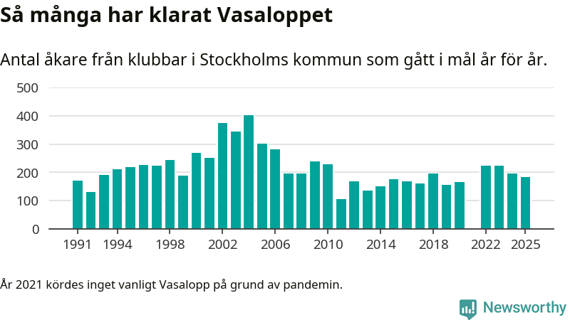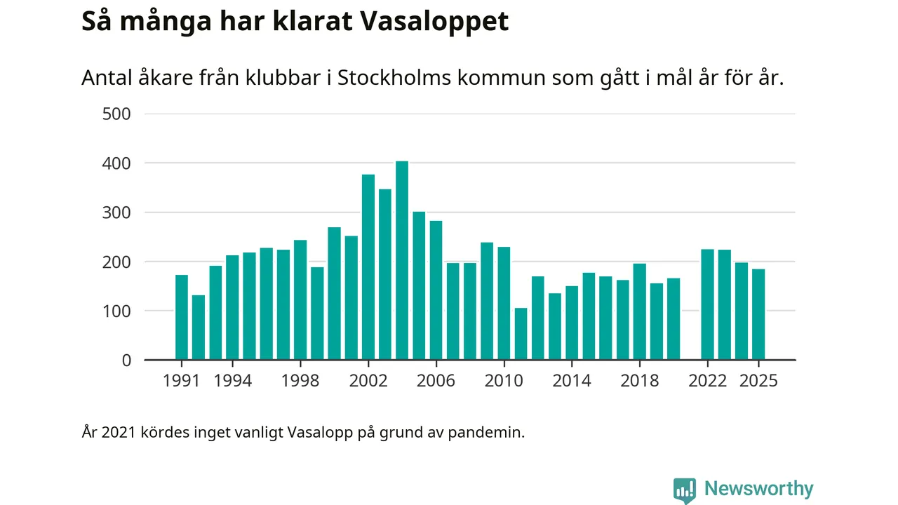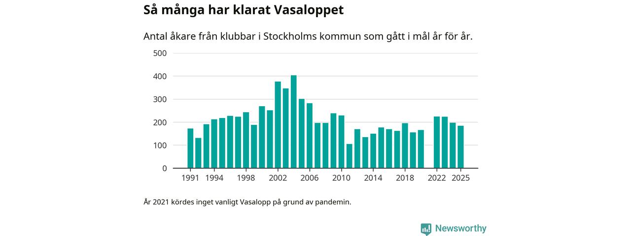 På söndag går starten för det 102:a Vasaloppet. Newsworthy har samlat in och sammanställt samtliga Vasaloppsresultat sedan 1991. Det ger en unik bild av hur skidåkare från klubbar i Stockholms kommun har klarat sig genom åren.