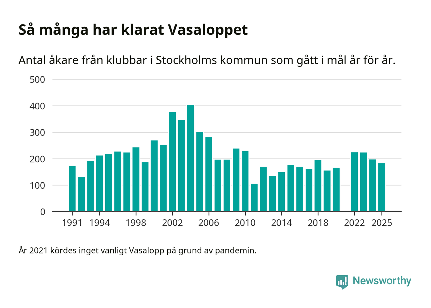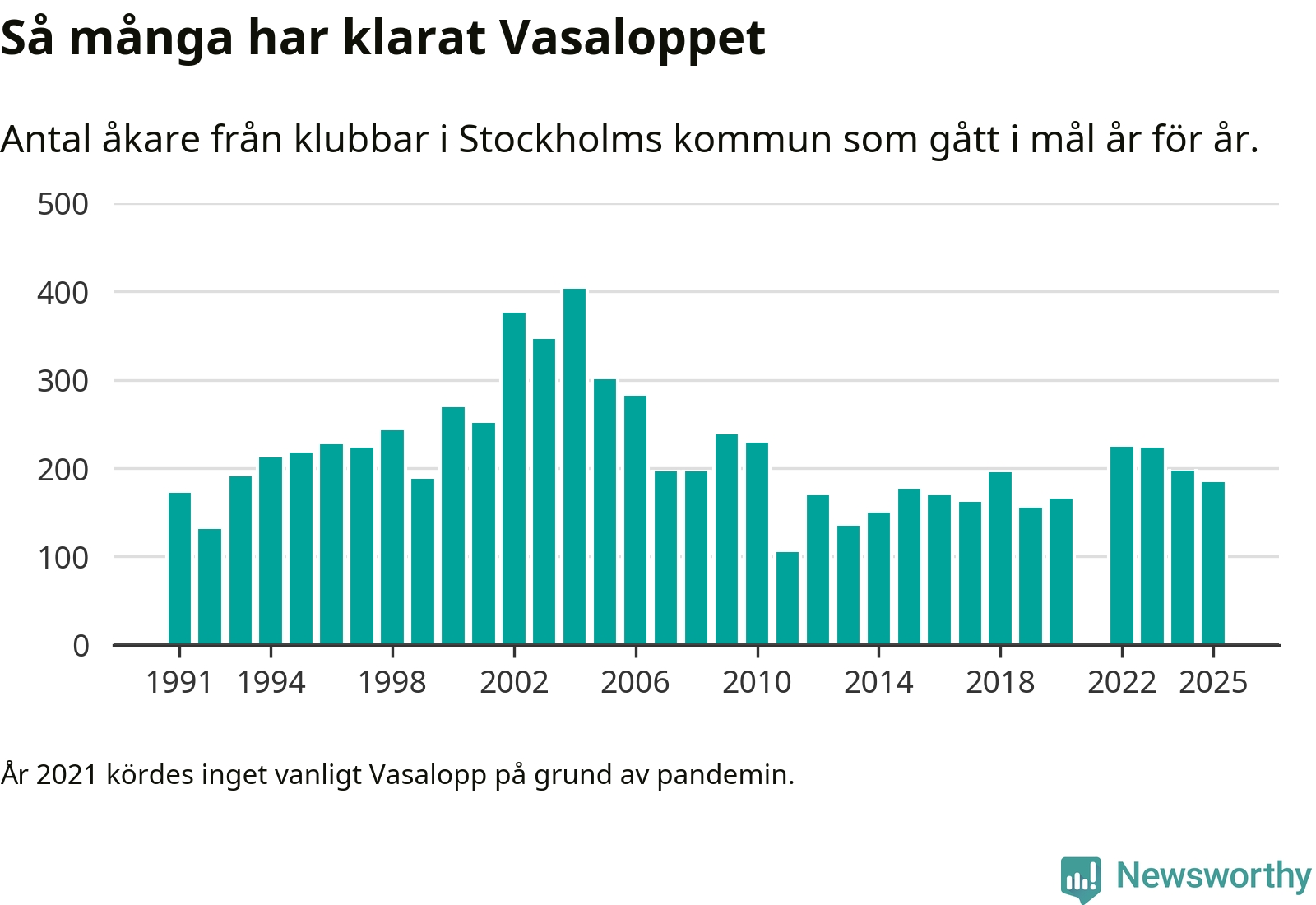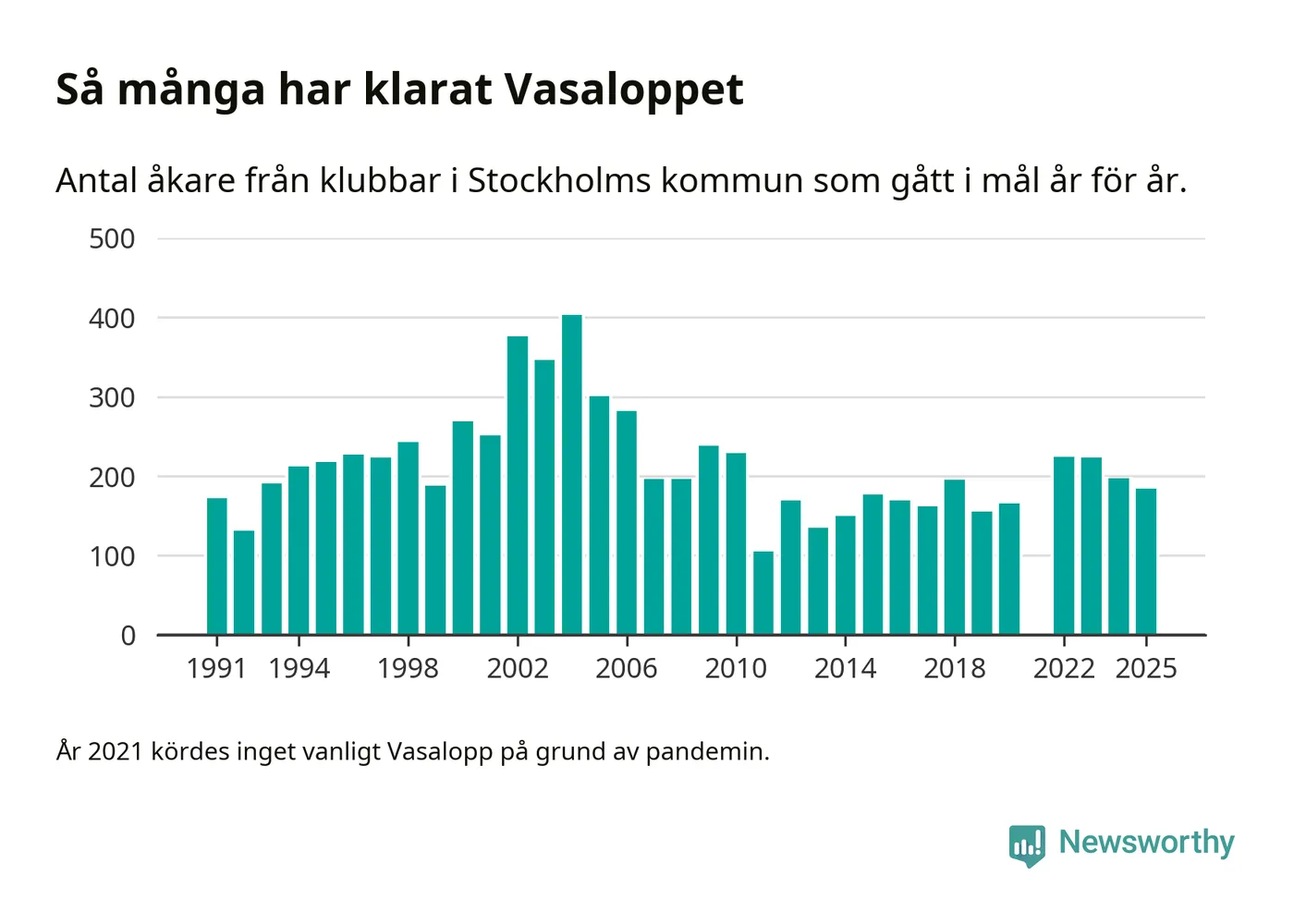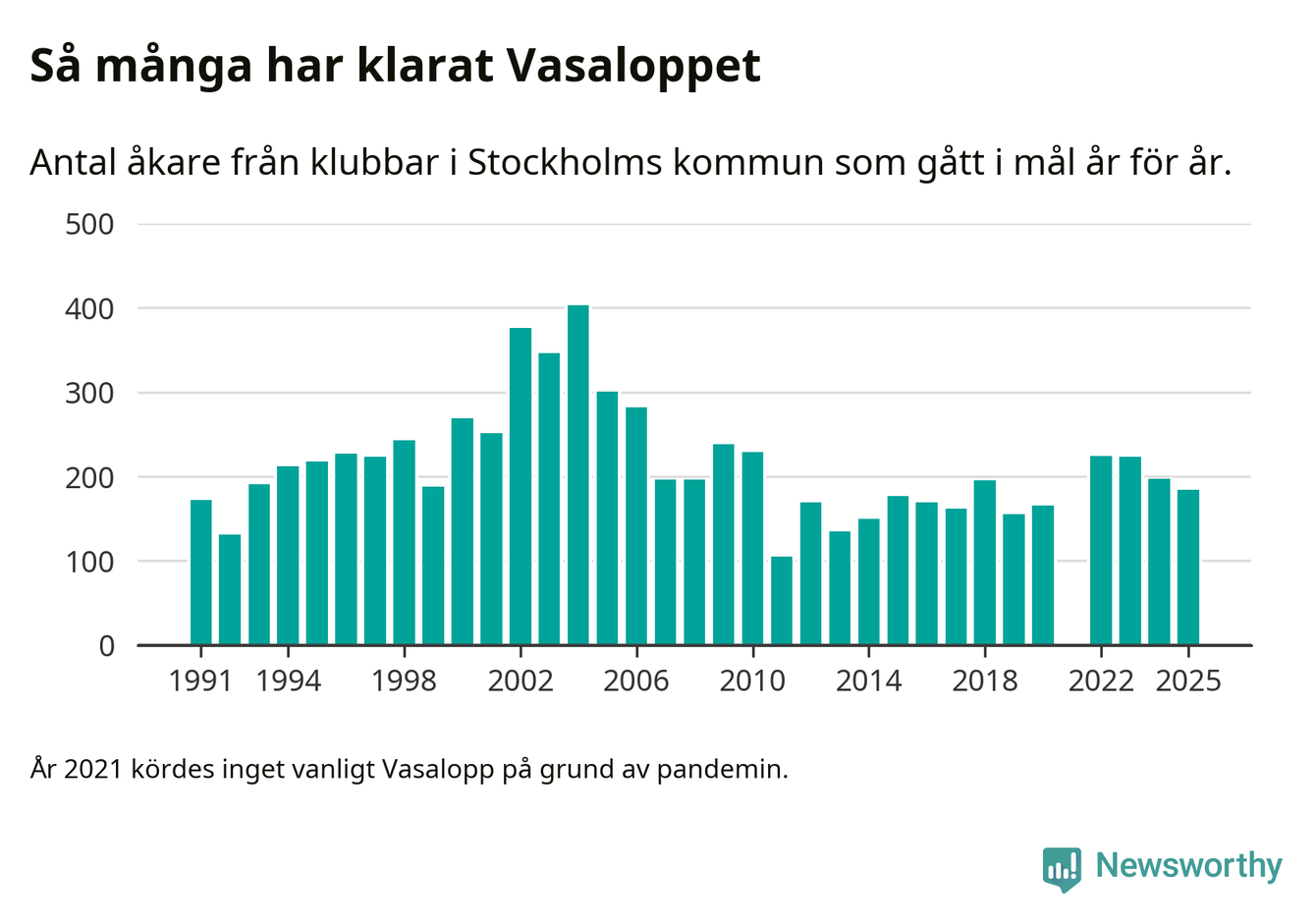 På söndag går starten för det 102:a Vasaloppet. Newsworthy har samlat in och sammanställt samtliga Vasaloppsresultat sedan 1991. Det ger en unik bild av hur skidåkare från klubbar i Stockholms kommun har klarat sig genom åren.