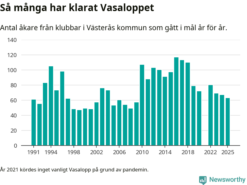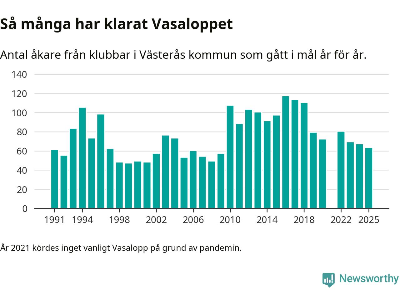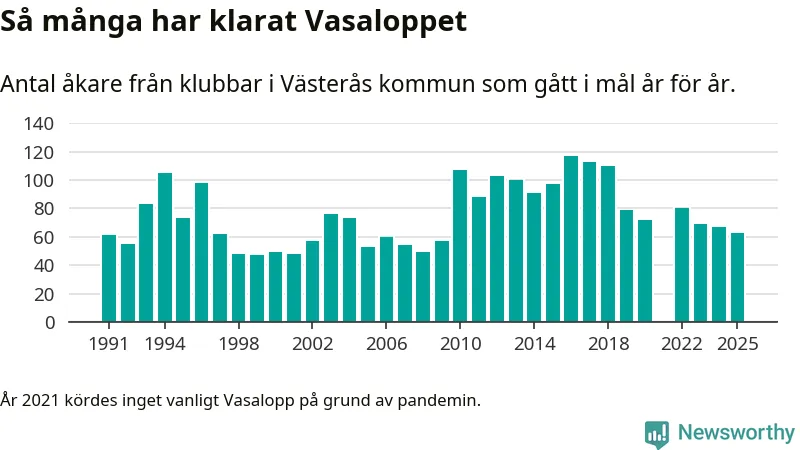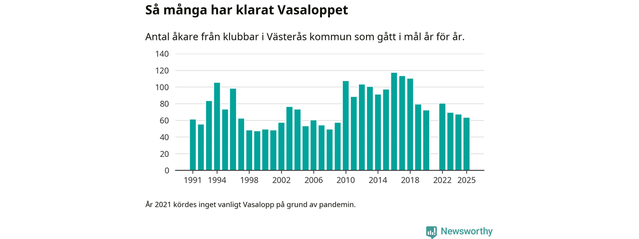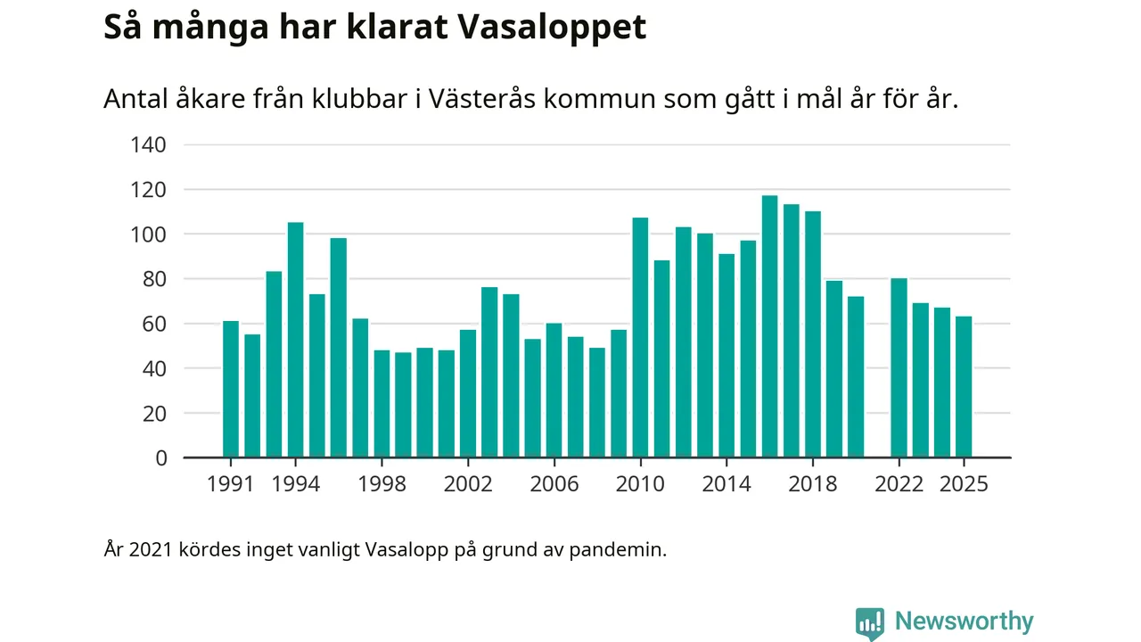 På söndag går starten för det 102:a Vasaloppet. Newsworthy har samlat in och sammanställt samtliga Vasaloppsresultat sedan 1991. Det ger en unik bild av hur skidåkare från klubbar i Västerås kommun har klarat sig genom åren.
