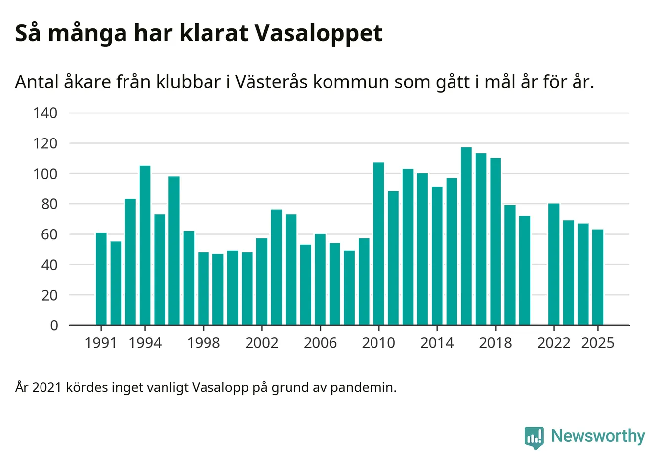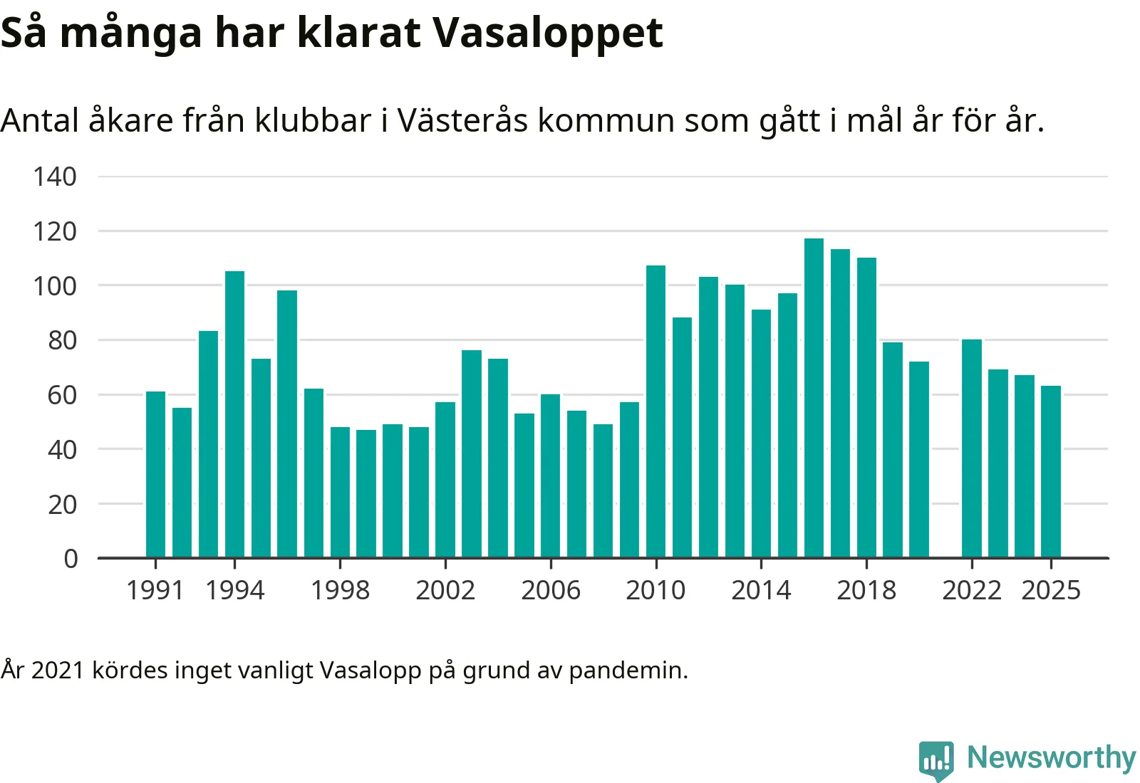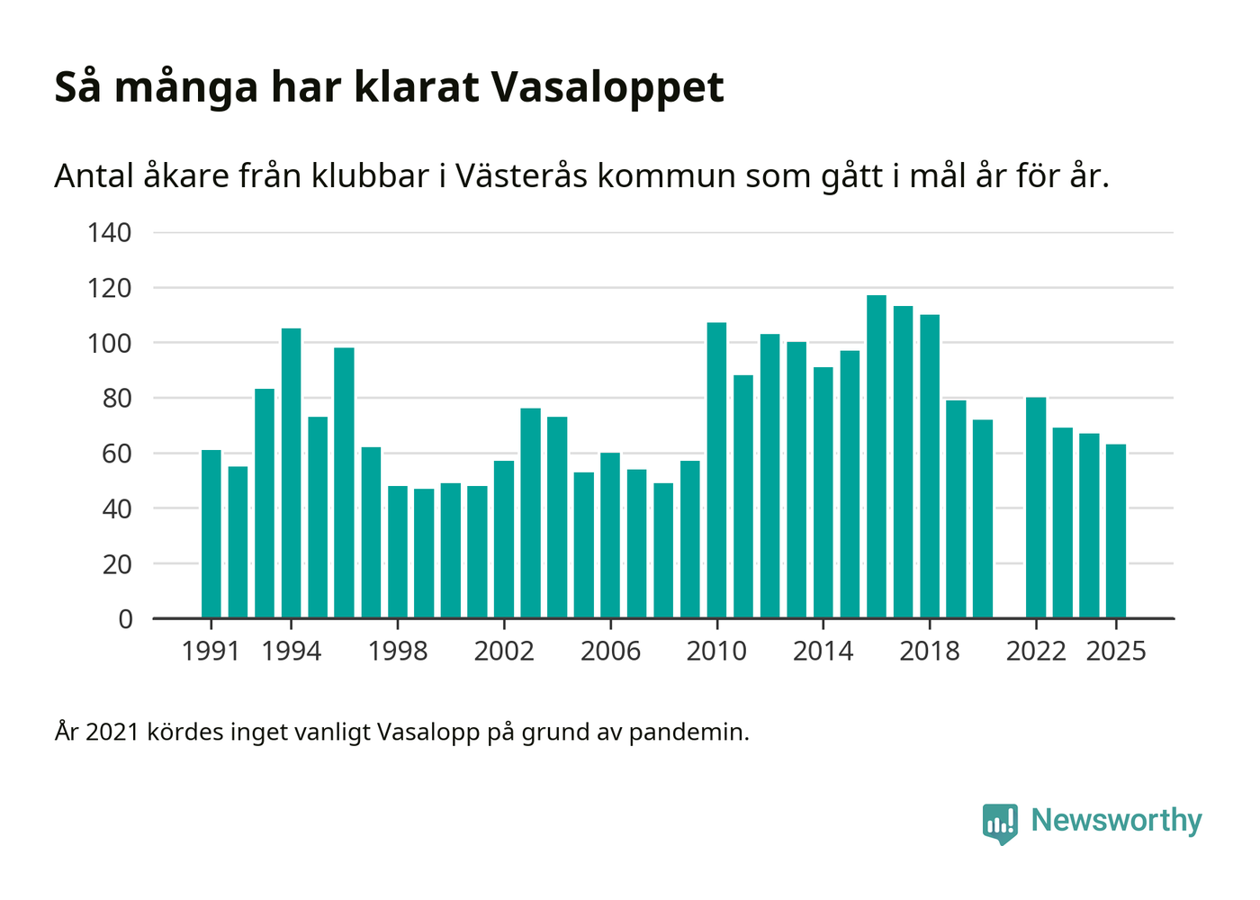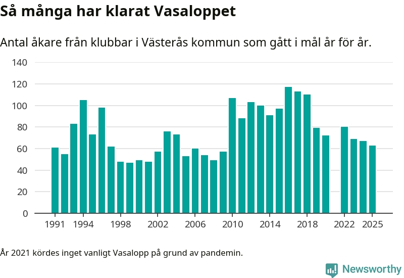 På söndag går starten för det 102:a Vasaloppet. Newsworthy har samlat in och sammanställt samtliga Vasaloppsresultat sedan 1991. Det ger en unik bild av hur skidåkare från klubbar i Västerås kommun har klarat sig genom åren.
