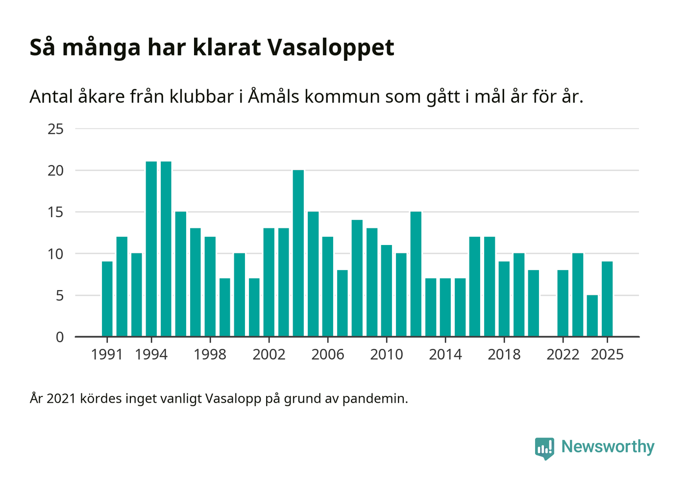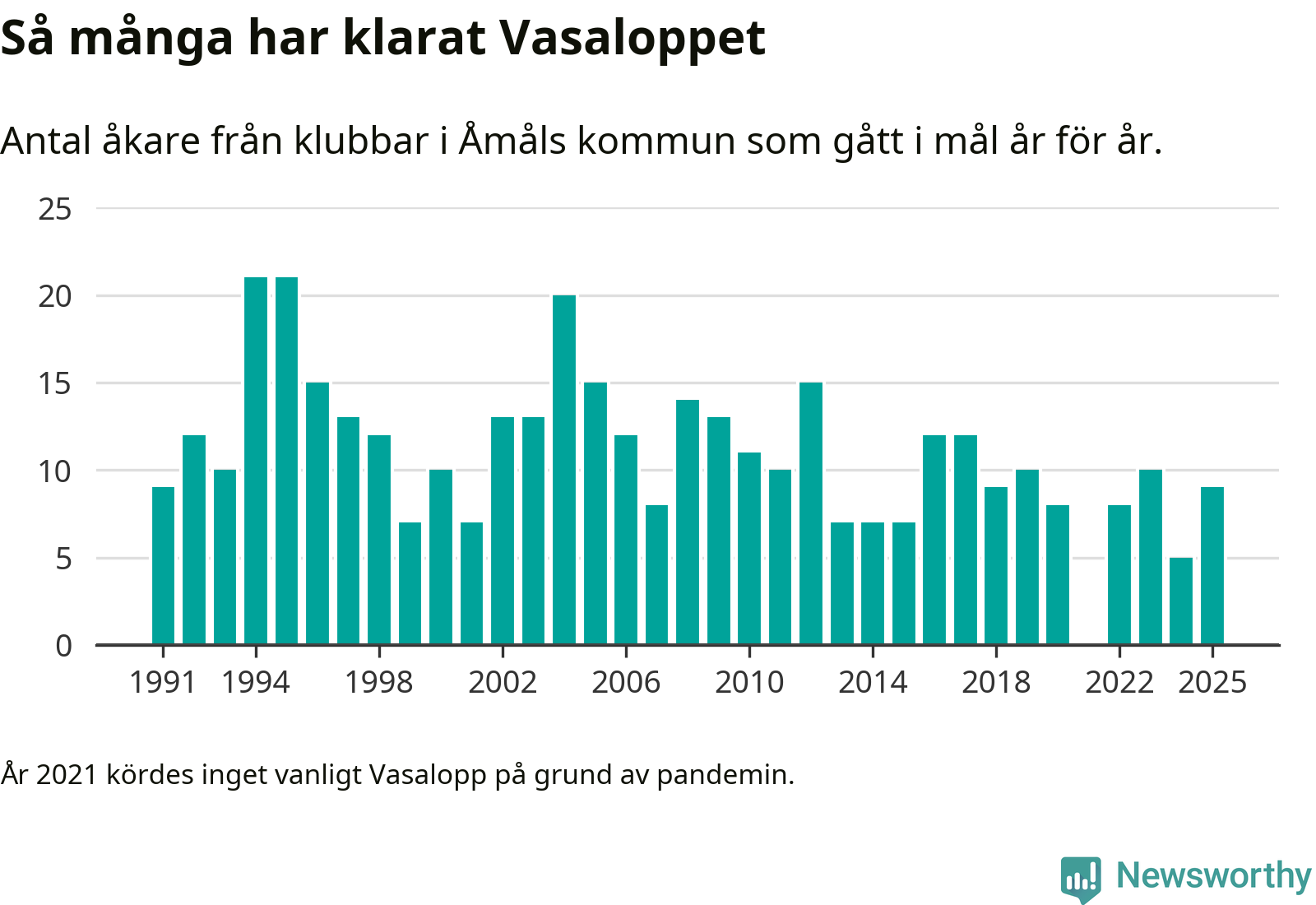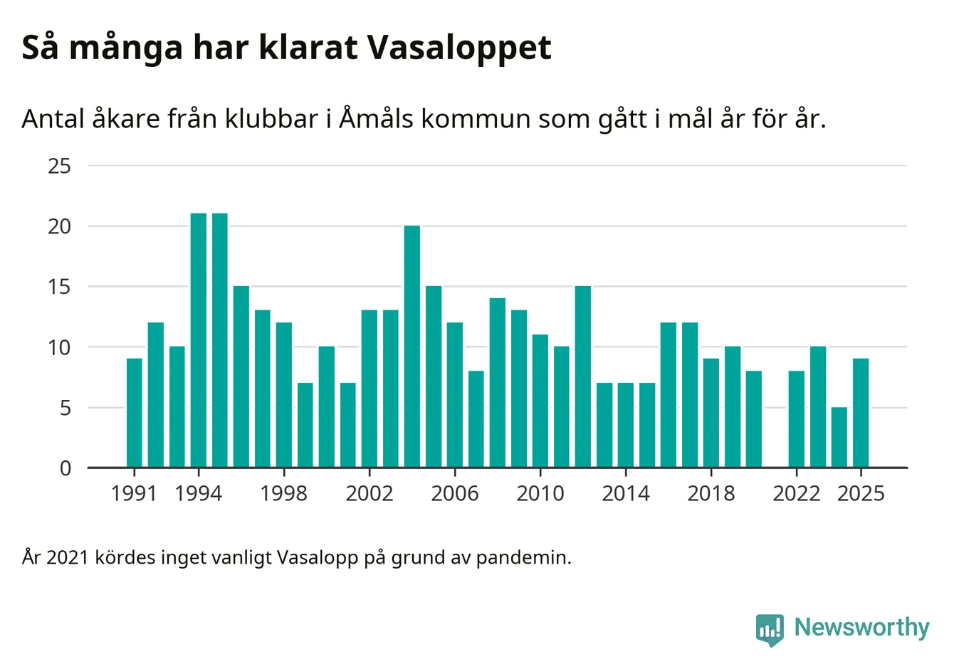 På söndag går starten för det 102:a Vasaloppet. Newsworthy har samlat in och sammanställt samtliga Vasaloppsresultat sedan 1991. Det ger en unik bild av hur skidåkare från klubbar i Åmåls kommun har klarat sig genom åren.