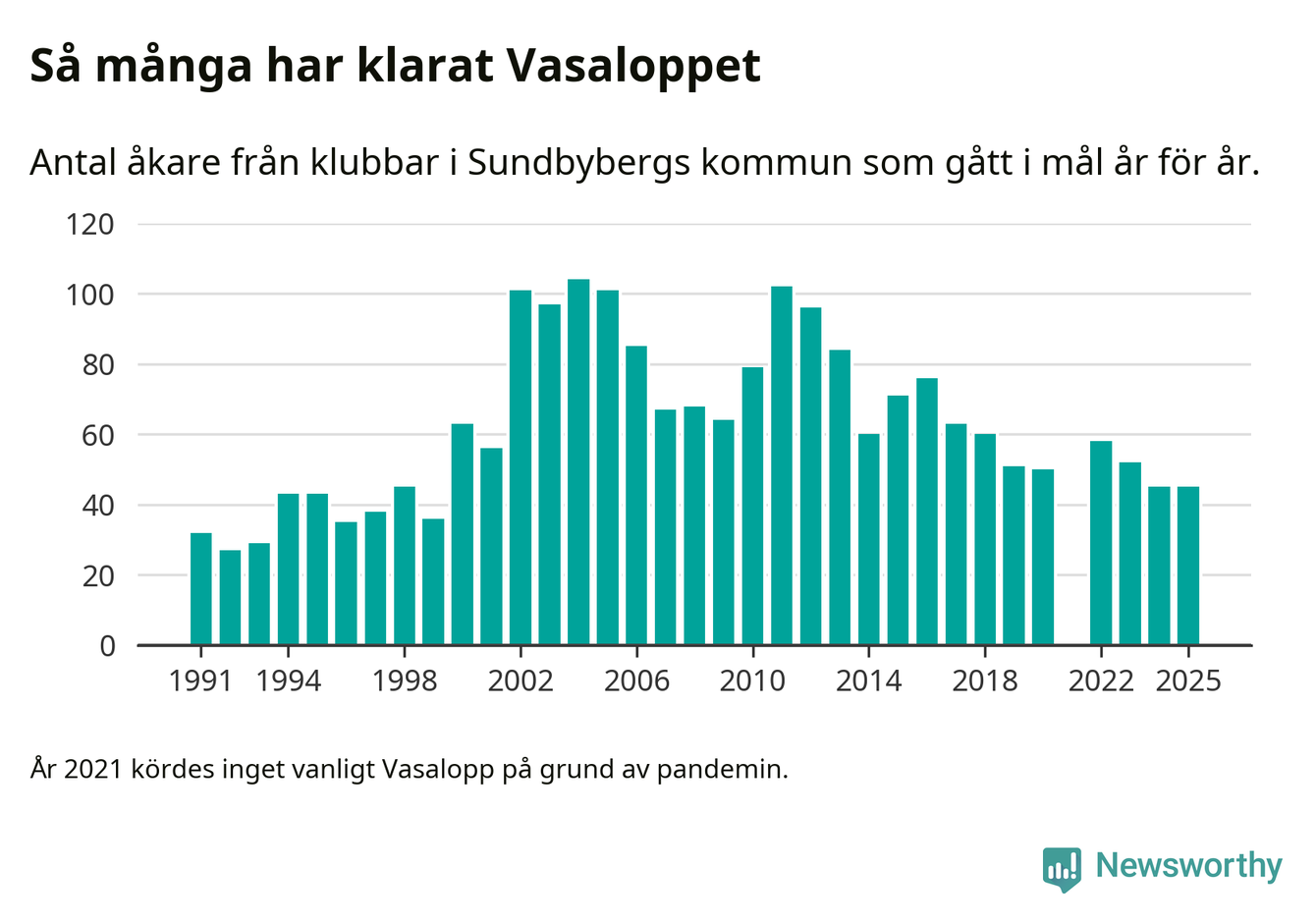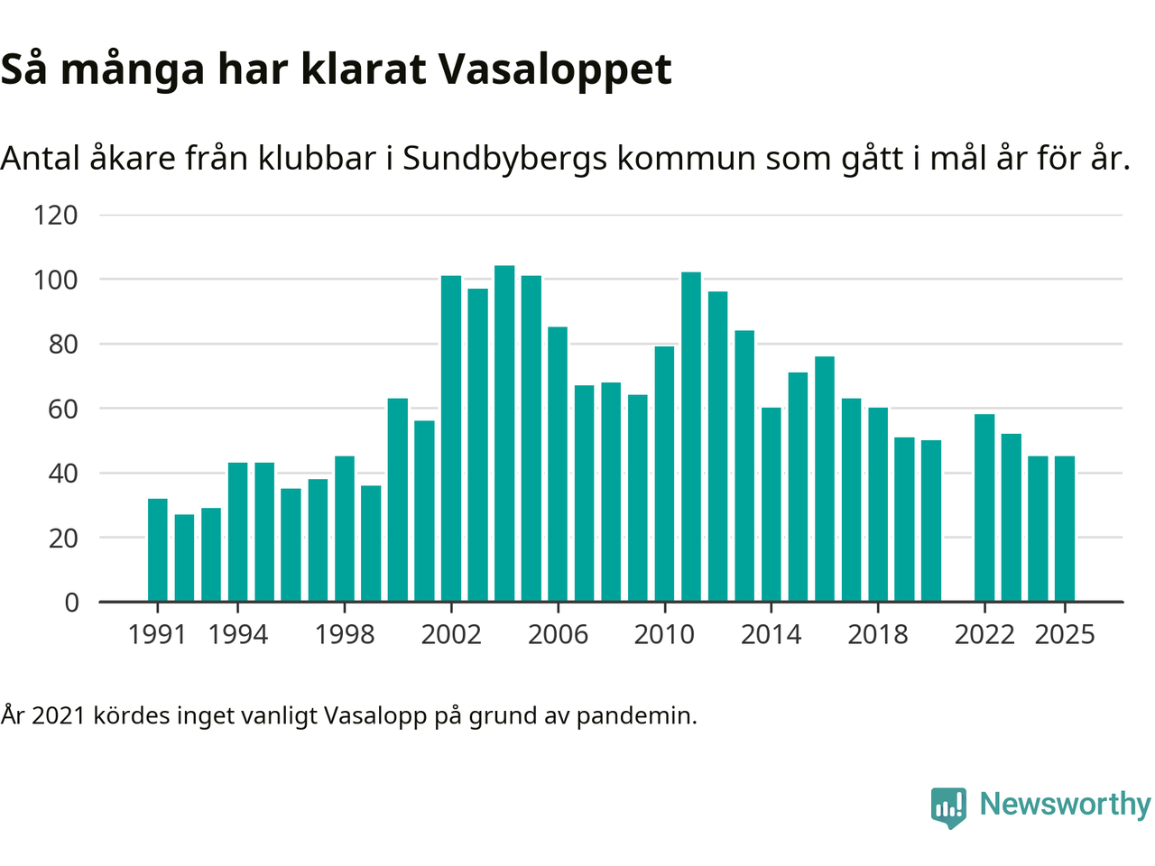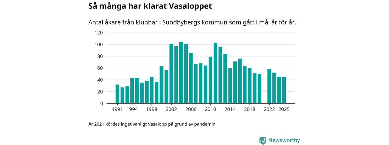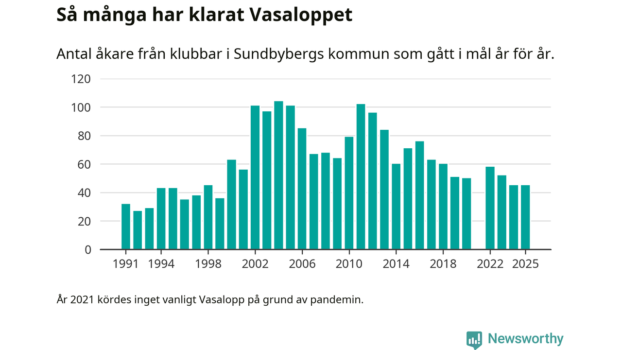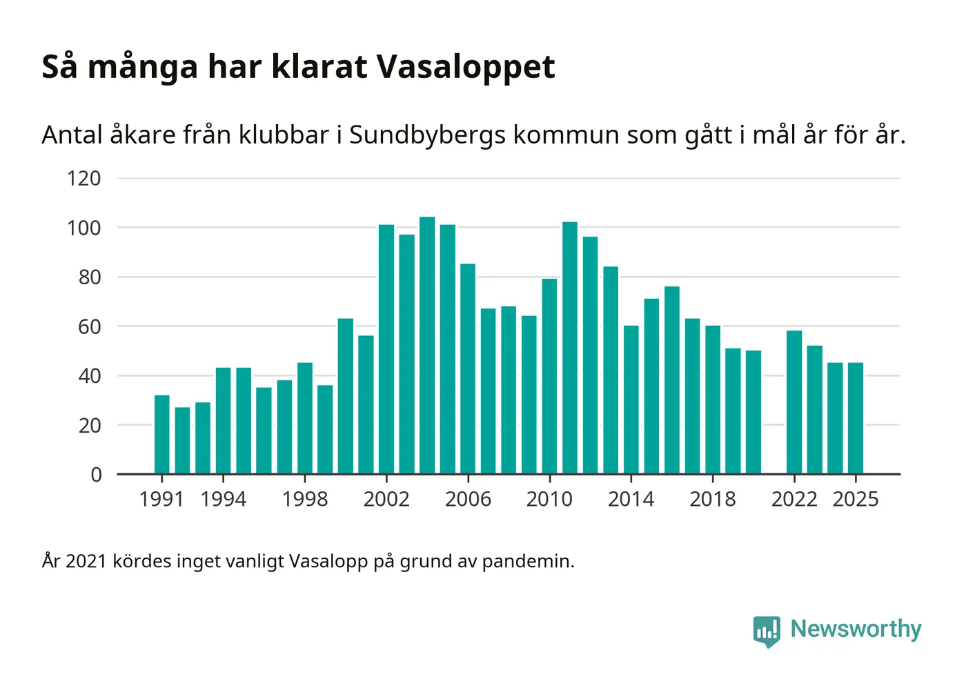 På söndag går starten för det 102:a Vasaloppet. Newsworthy har samlat in och sammanställt samtliga Vasaloppsresultat sedan 1991. Det ger en unik bild av hur skidåkare från klubbar i Sundbybergs kommun har klarat sig genom åren.