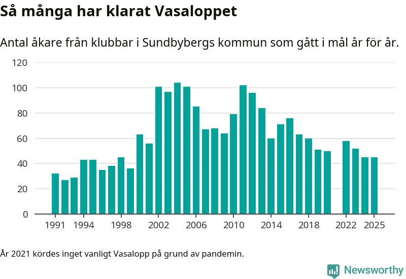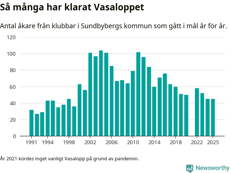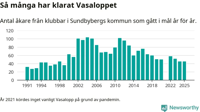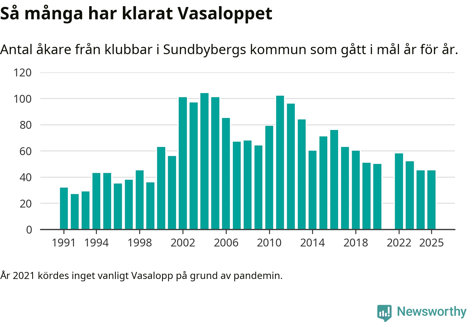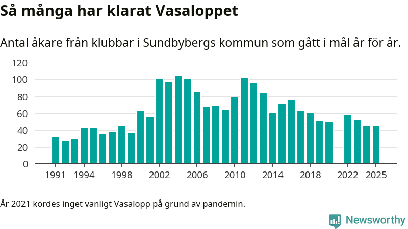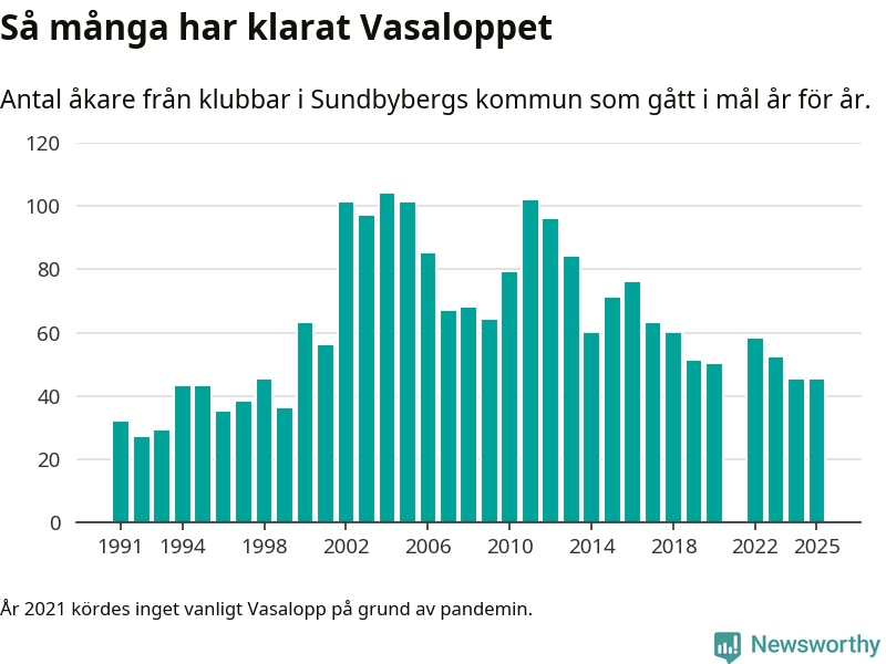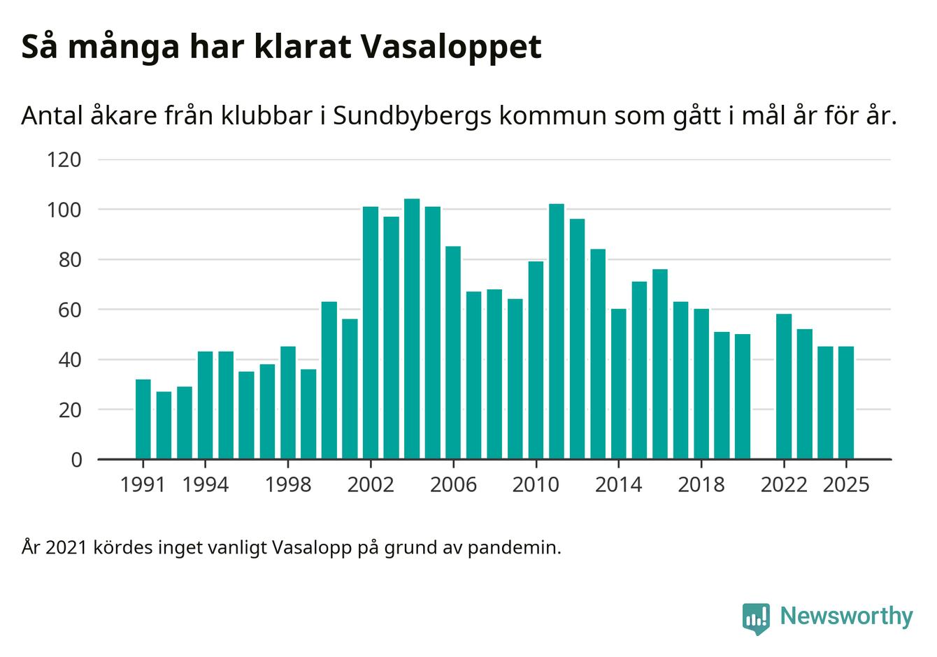 På söndag går starten för det 102:a Vasaloppet. Newsworthy har samlat in och sammanställt samtliga Vasaloppsresultat sedan 1991. Det ger en unik bild av hur skidåkare från klubbar i Sundbybergs kommun har klarat sig genom åren.