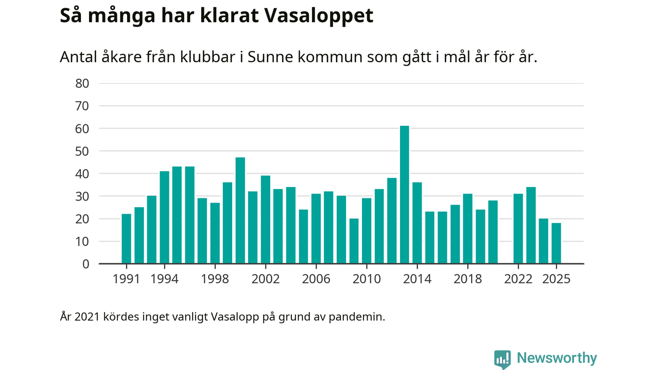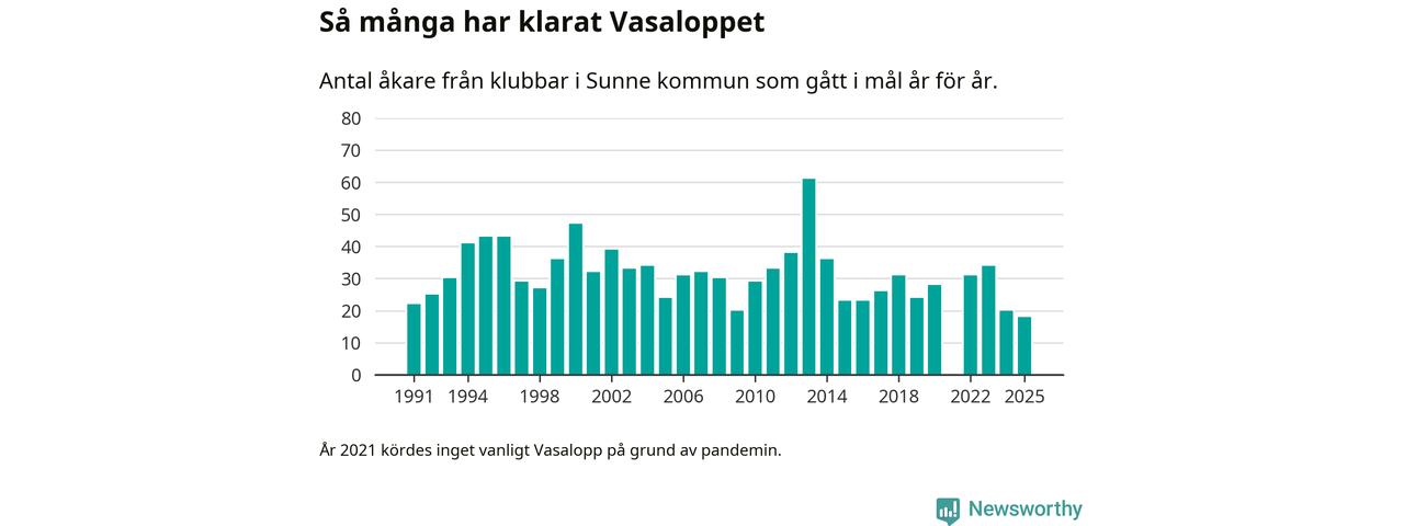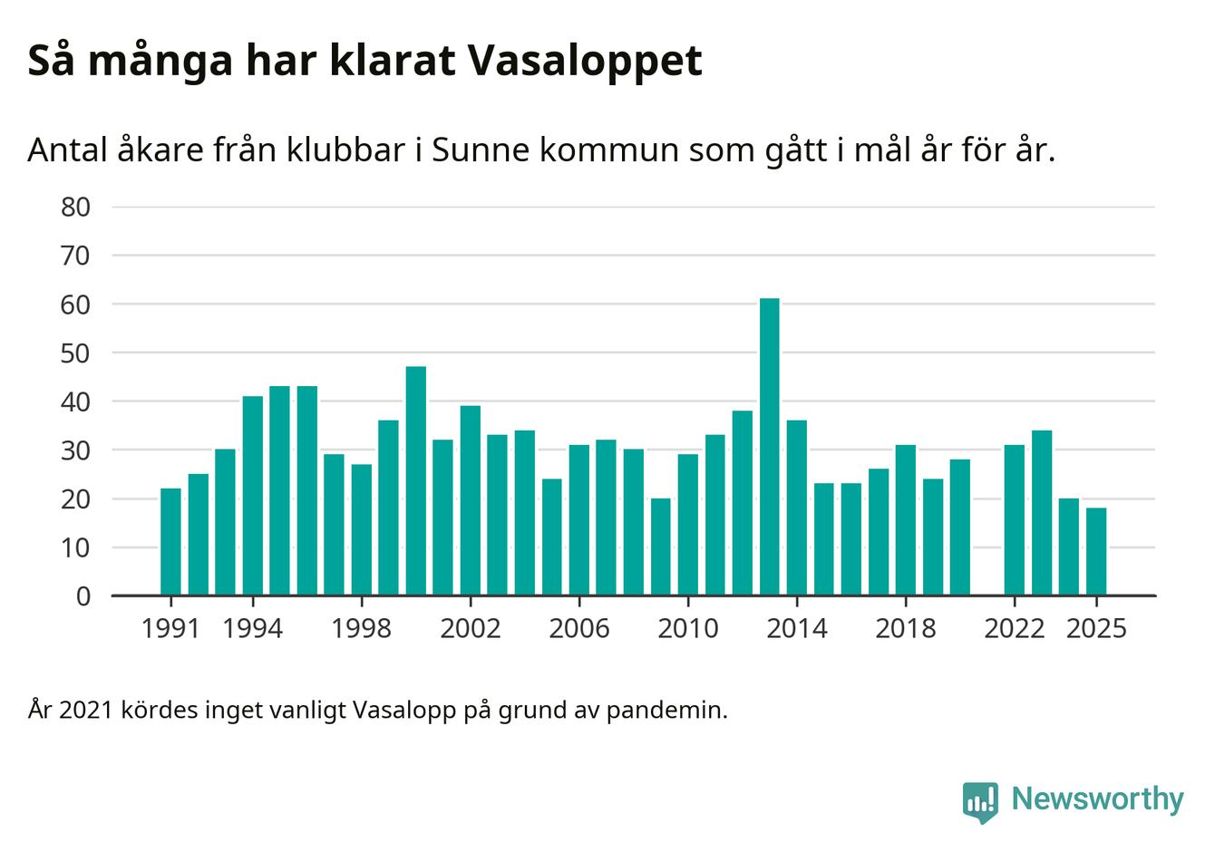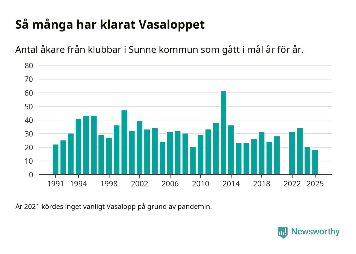 På söndag går starten för det 102:a Vasaloppet. Newsworthy har samlat in och sammanställt samtliga Vasaloppsresultat sedan 1991. Det ger en unik bild av hur skidåkare från klubbar i Sunne kommun har klarat sig genom åren.