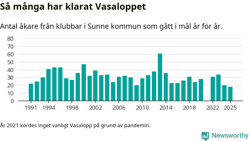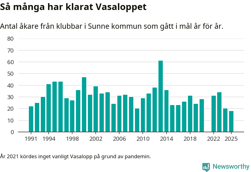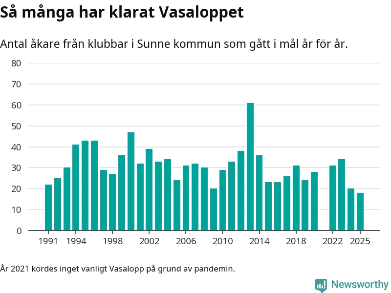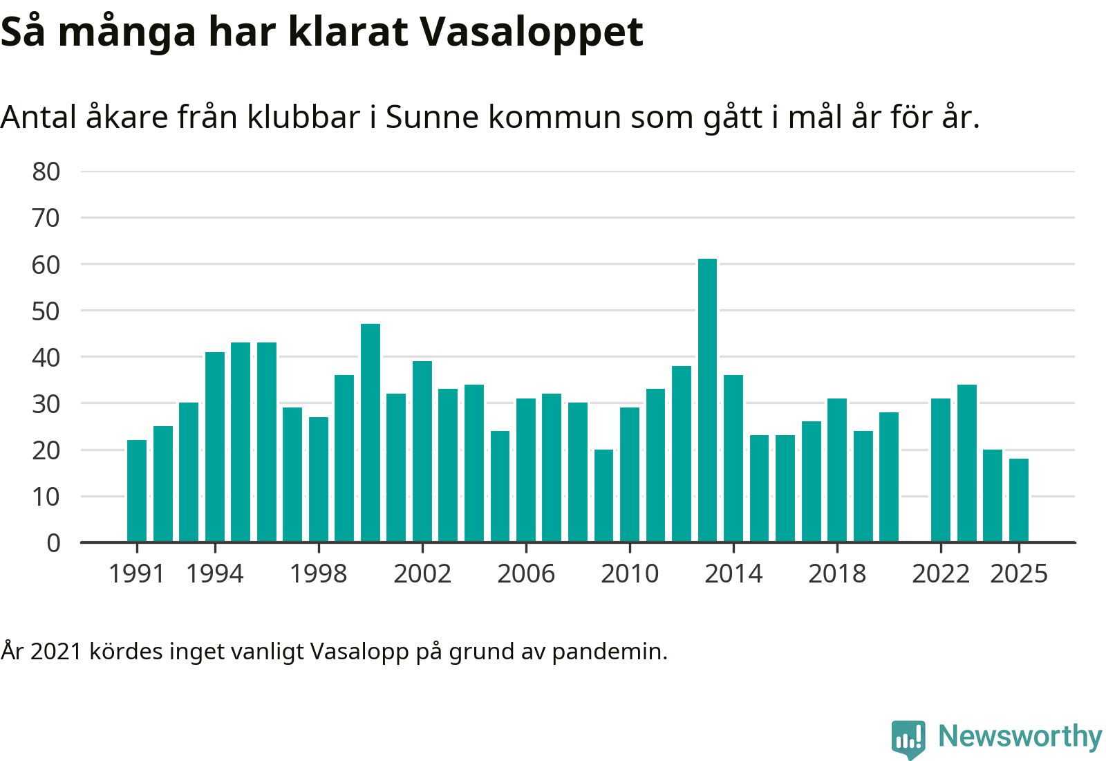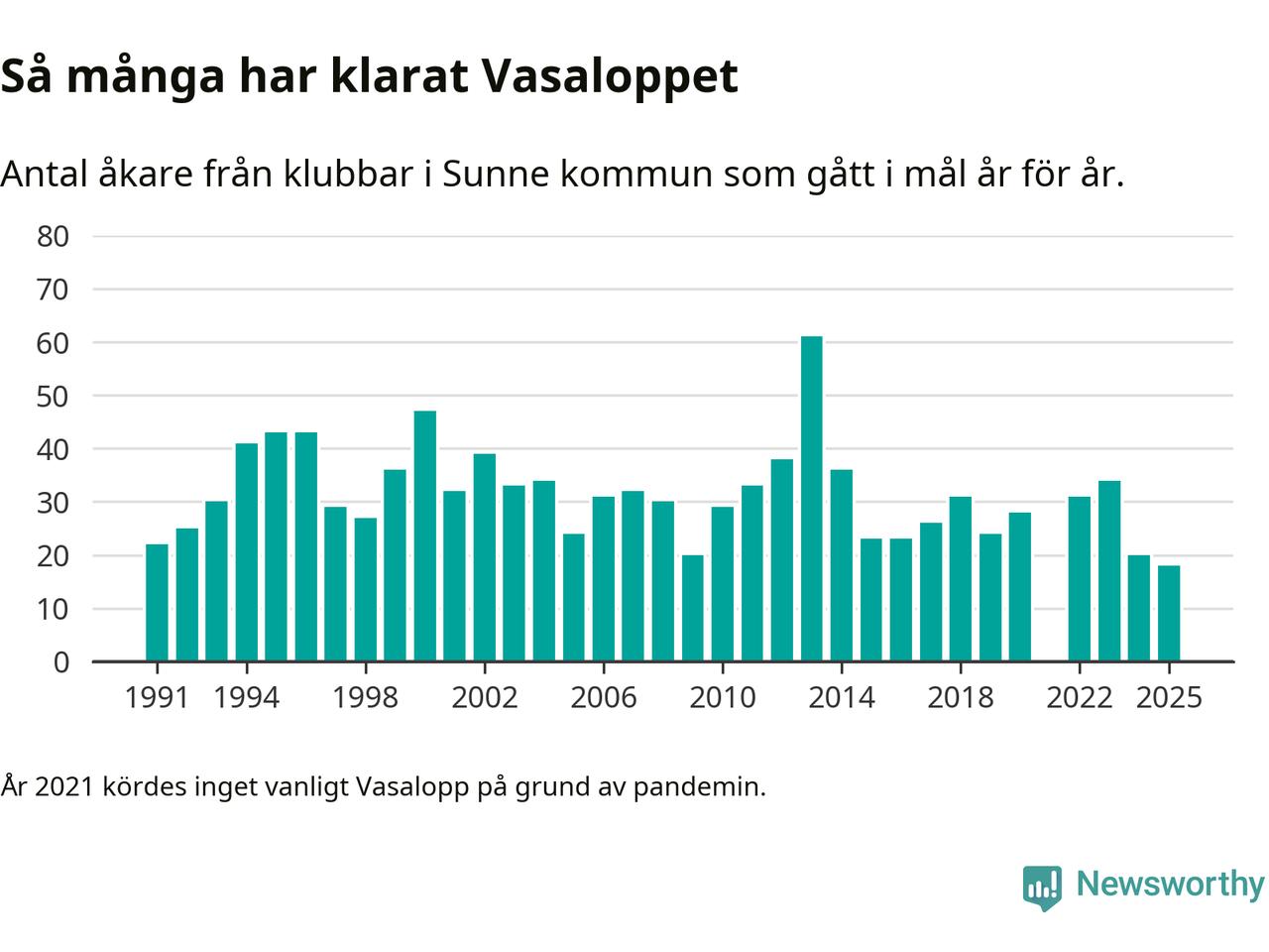 På söndag går starten för det 102:a Vasaloppet. Newsworthy har samlat in och sammanställt samtliga Vasaloppsresultat sedan 1991. Det ger en unik bild av hur skidåkare från klubbar i Sunne kommun har klarat sig genom åren.