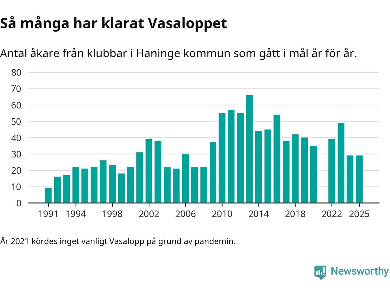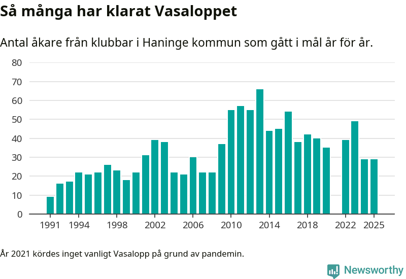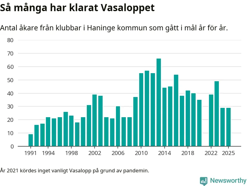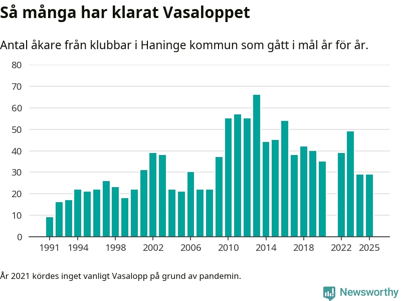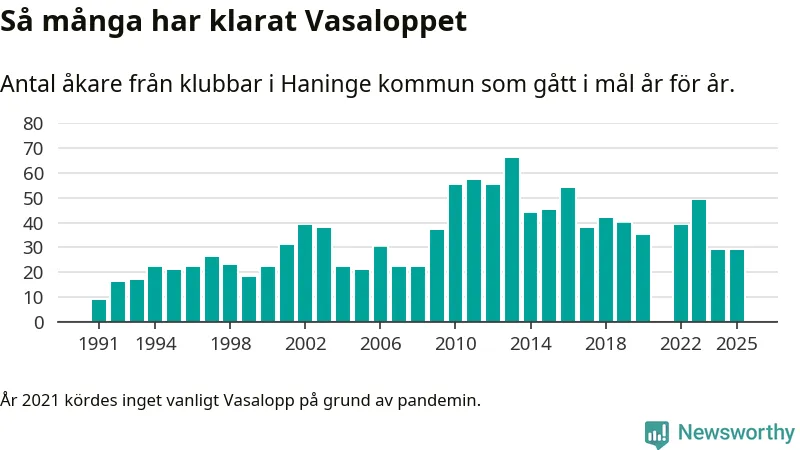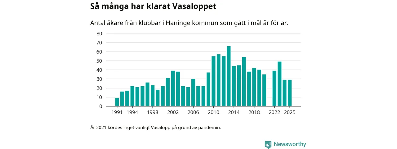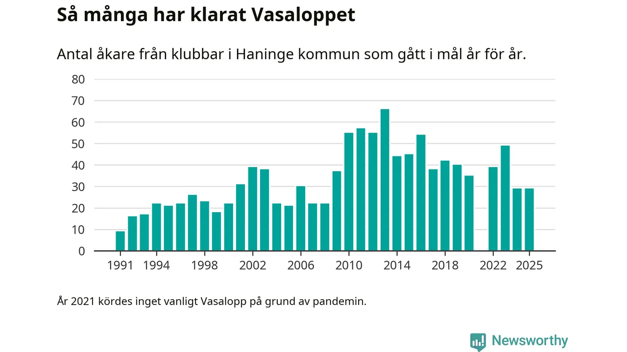 På söndag går starten för det 102:a Vasaloppet. Newsworthy har samlat in och sammanställt samtliga Vasaloppsresultat sedan 1991. Det ger en unik bild av hur skidåkare från klubbar i Haninge kommun har klarat sig genom åren.