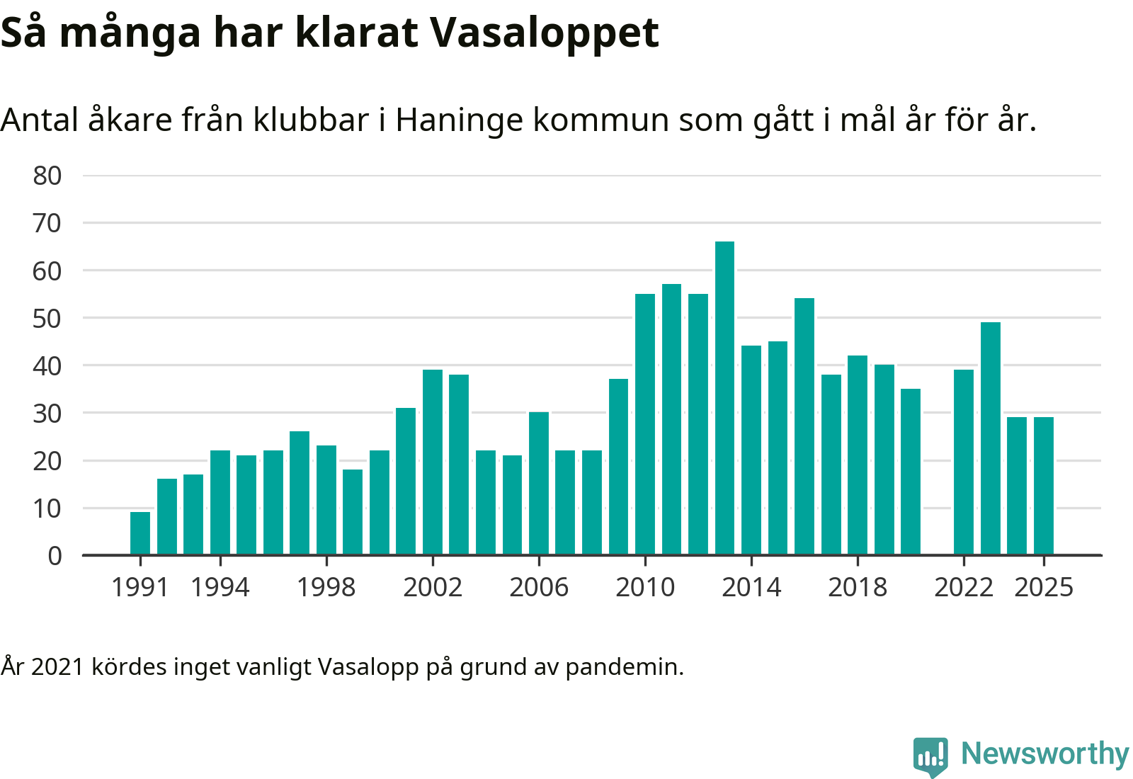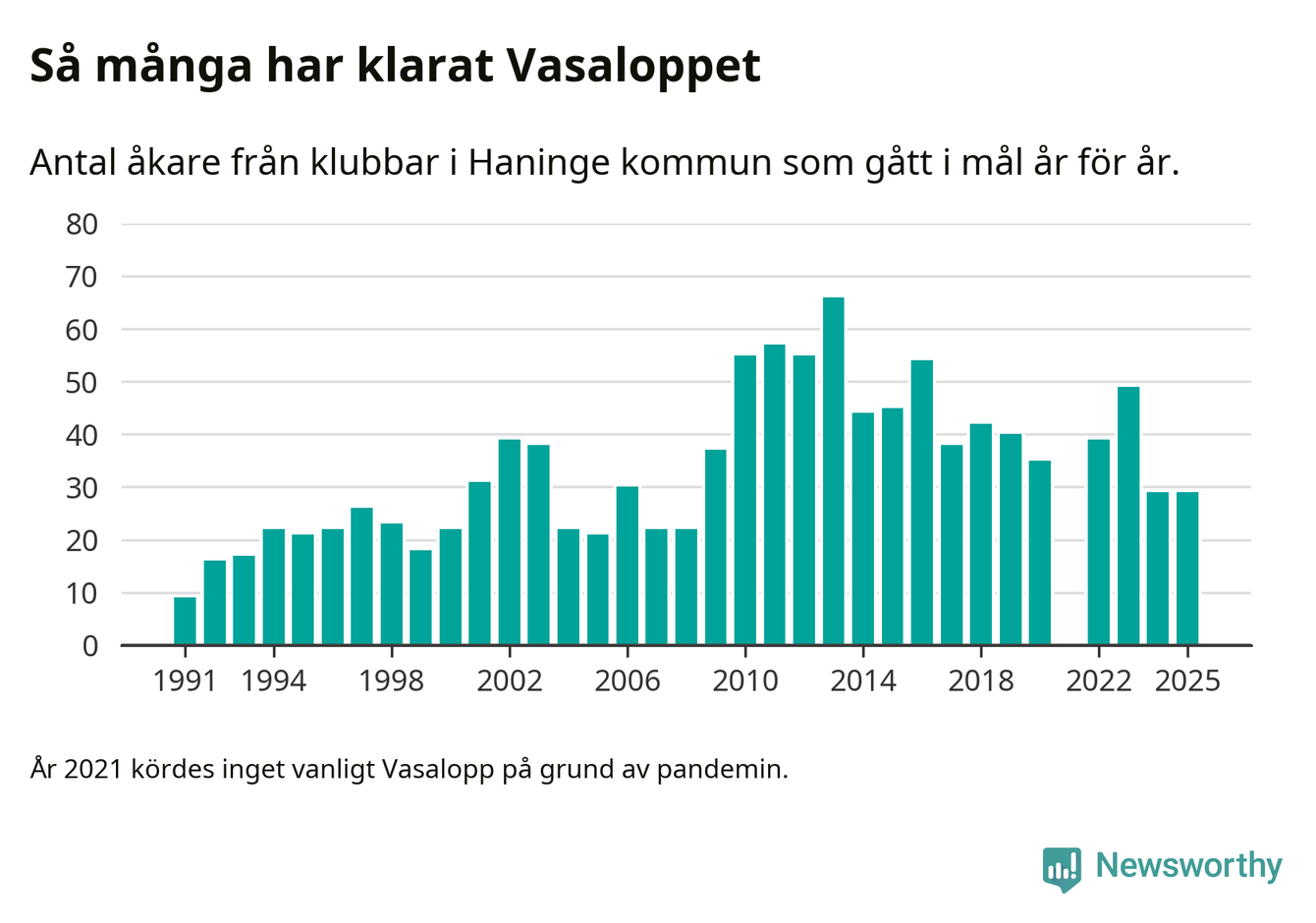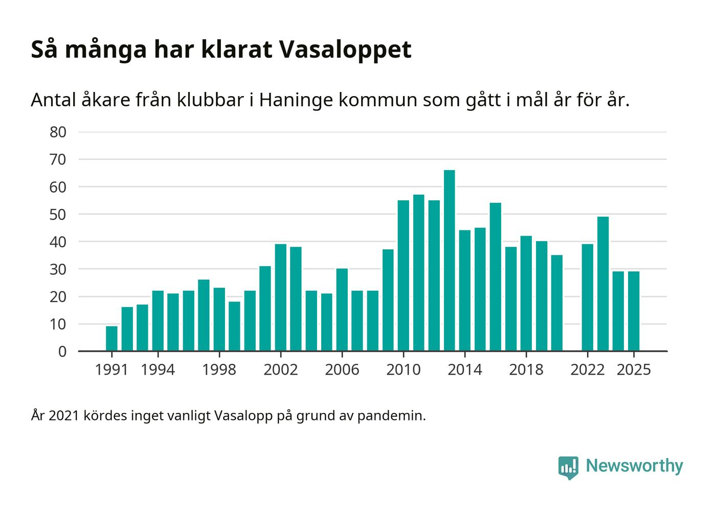 På söndag går starten för det 102:a Vasaloppet. Newsworthy har samlat in och sammanställt samtliga Vasaloppsresultat sedan 1991. Det ger en unik bild av hur skidåkare från klubbar i Haninge kommun har klarat sig genom åren.