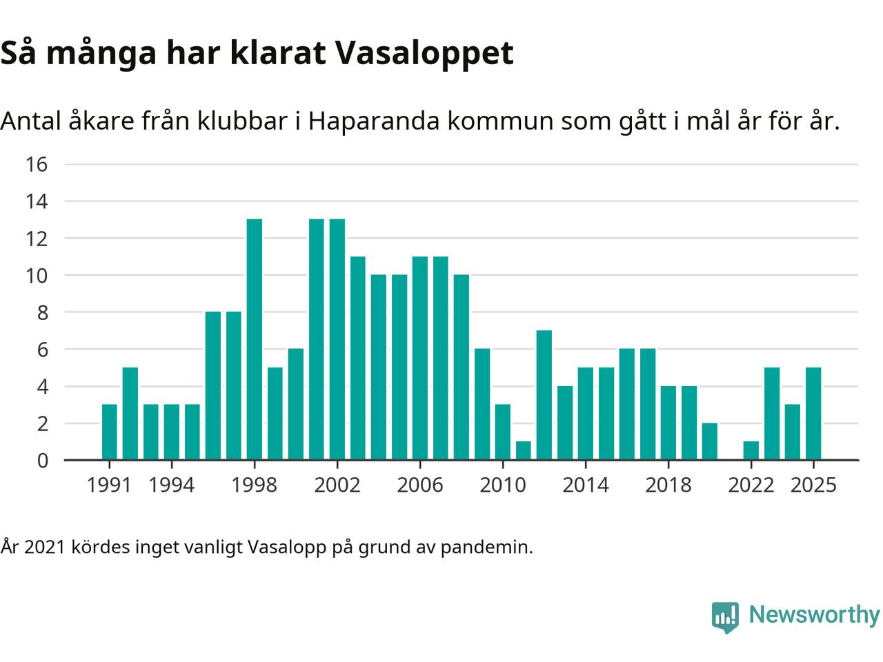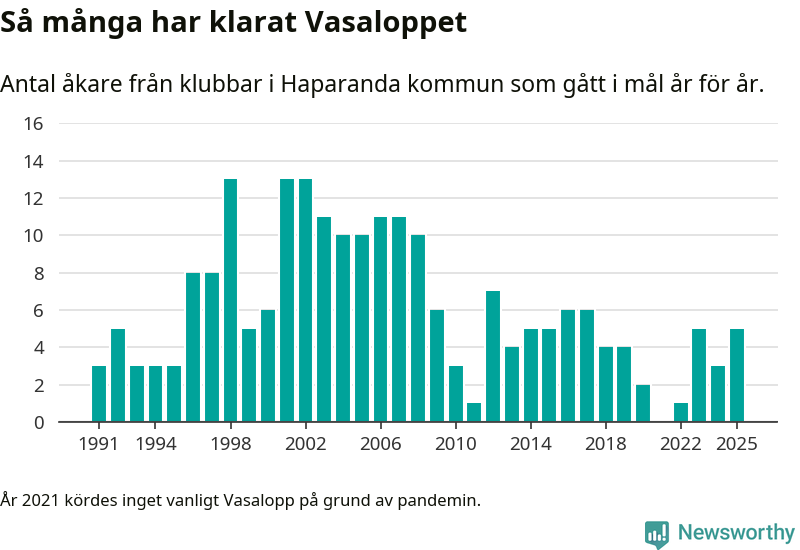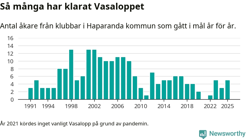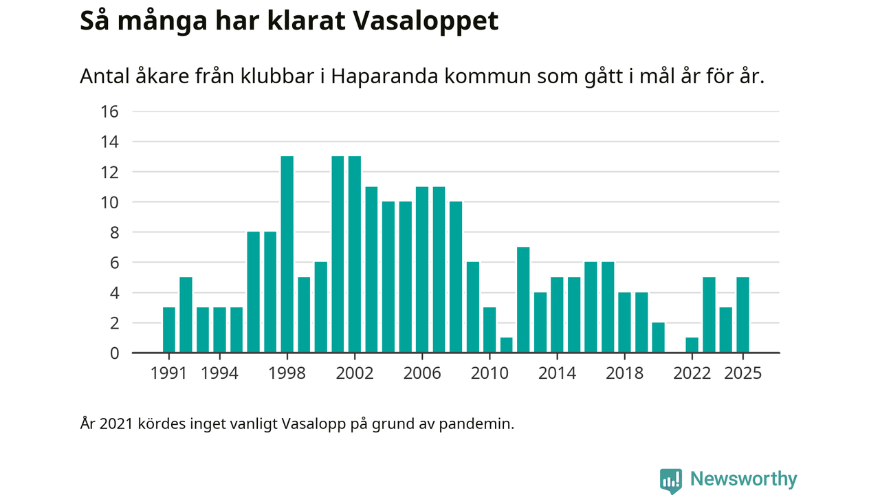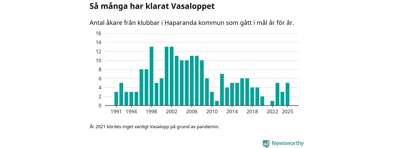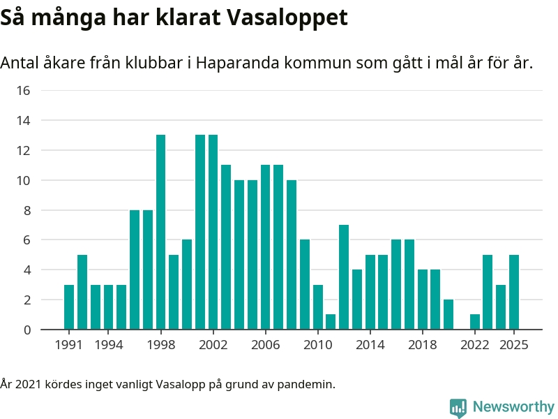 På söndag går starten för det 102:a Vasaloppet. Newsworthy har samlat in och sammanställt samtliga Vasaloppsresultat sedan 1991. Det ger en unik bild av hur skidåkare från klubbar i Haparanda kommun har klarat sig genom åren.
