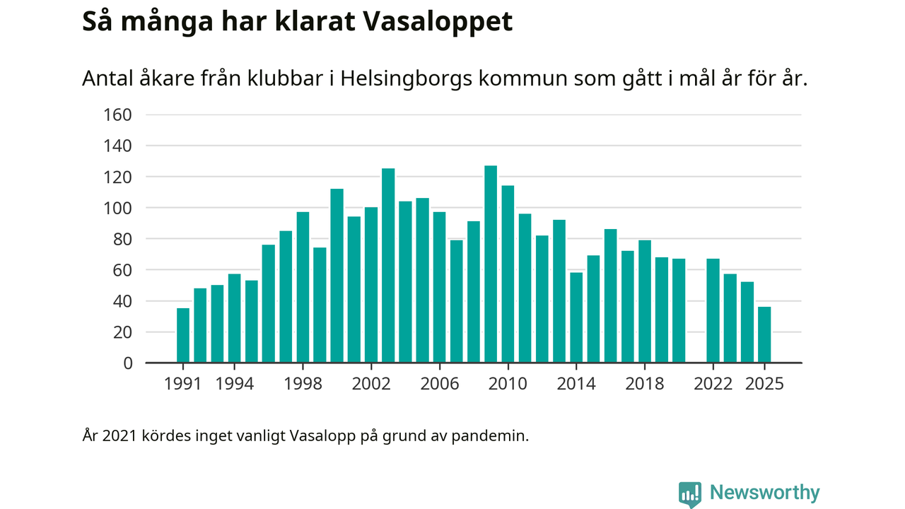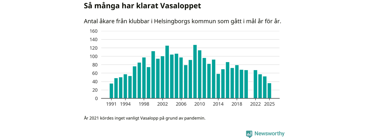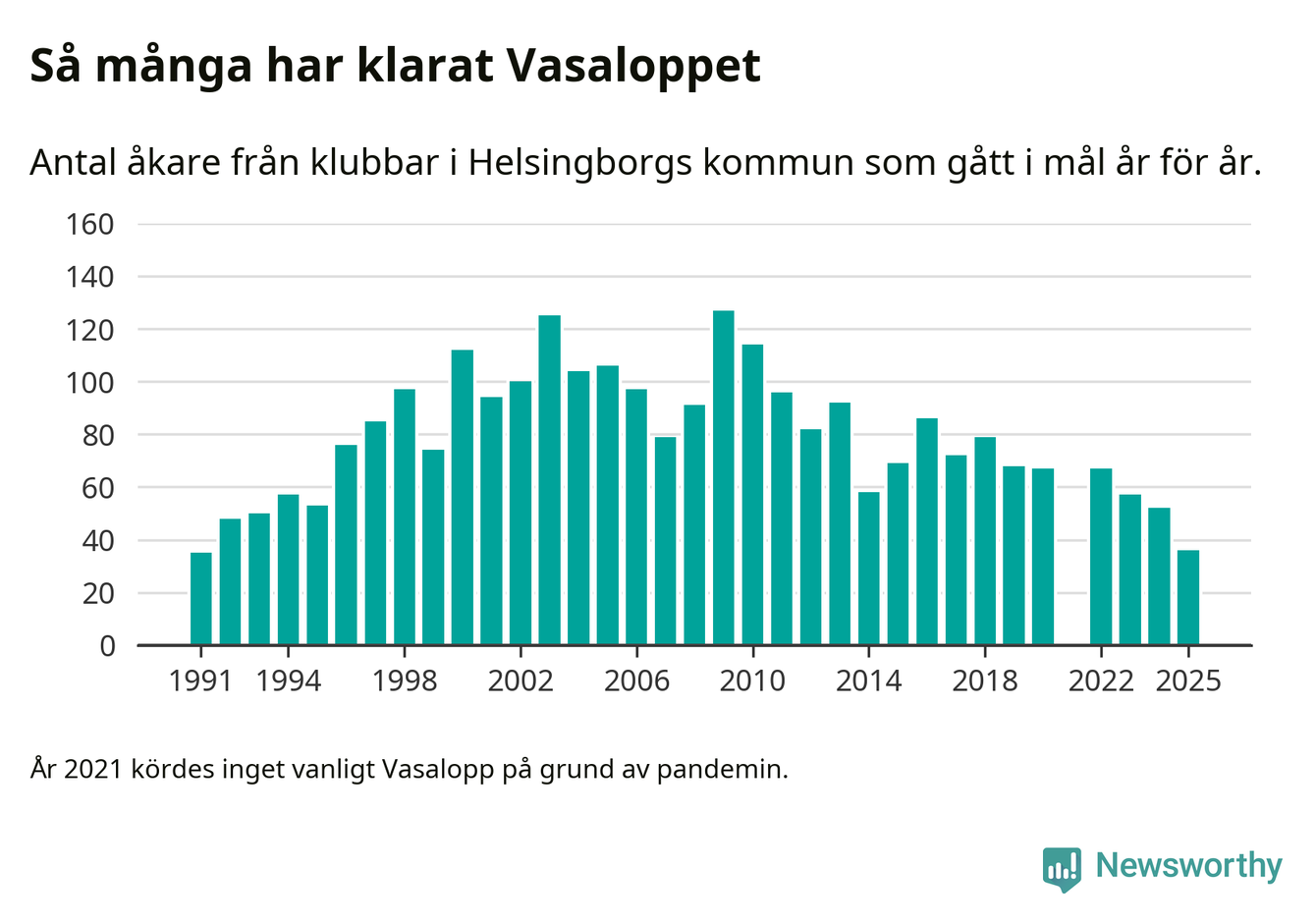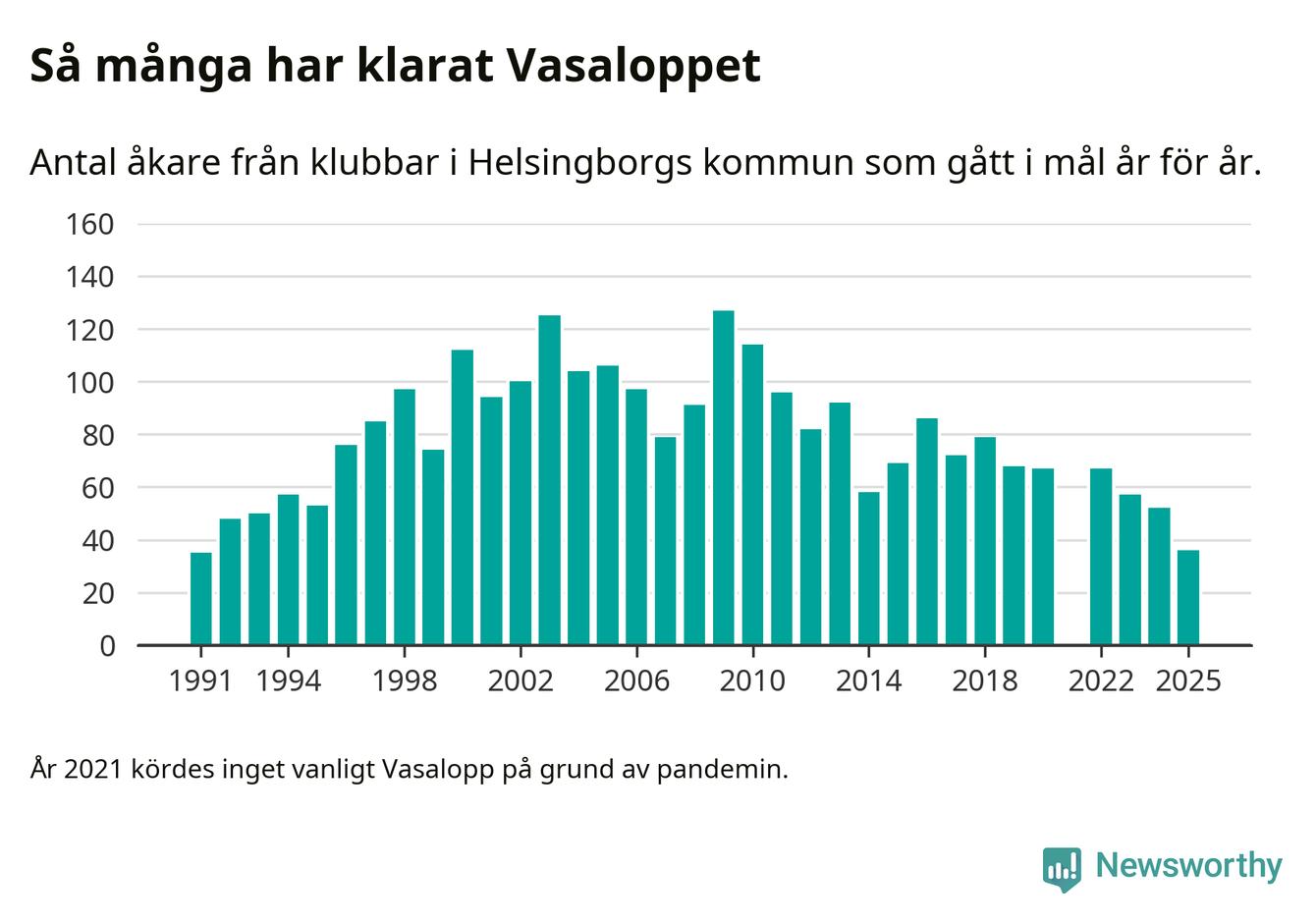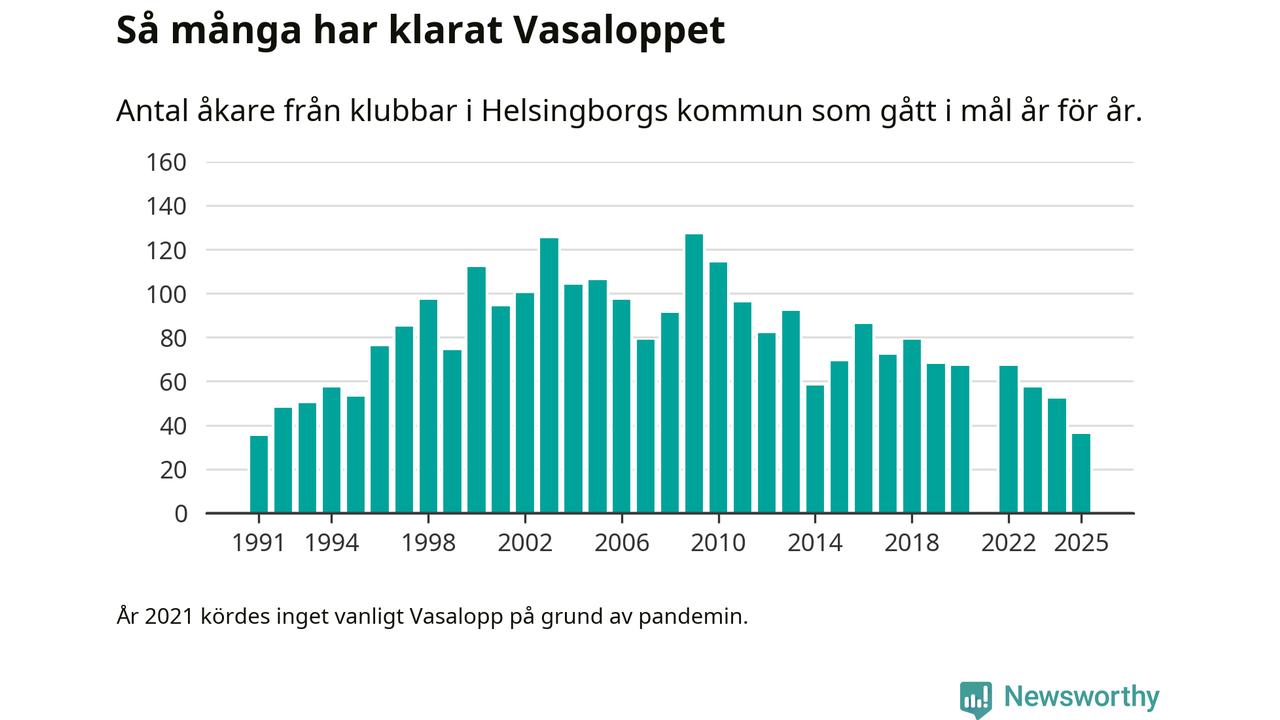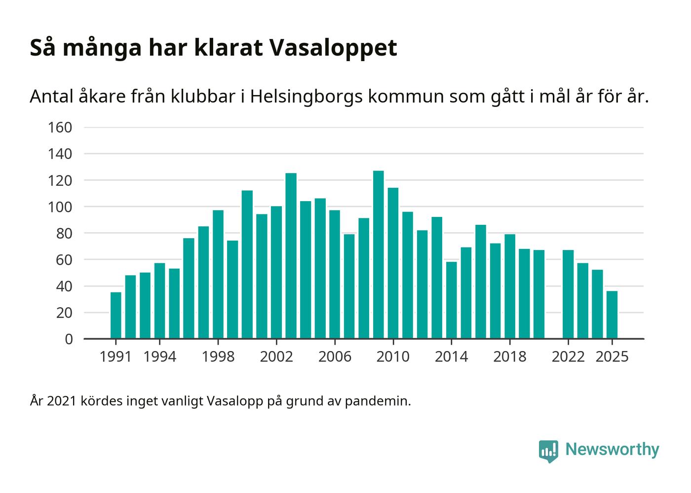 På söndag går starten för det 102:a Vasaloppet. Newsworthy har samlat in och sammanställt samtliga Vasaloppsresultat sedan 1991. Det ger en unik bild av hur skidåkare från klubbar i Helsingborgs kommun har klarat sig genom åren.