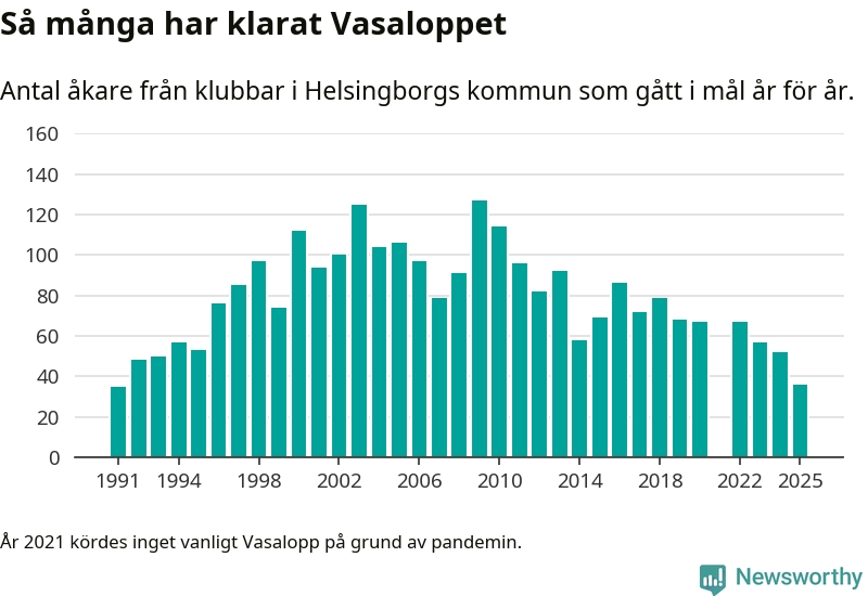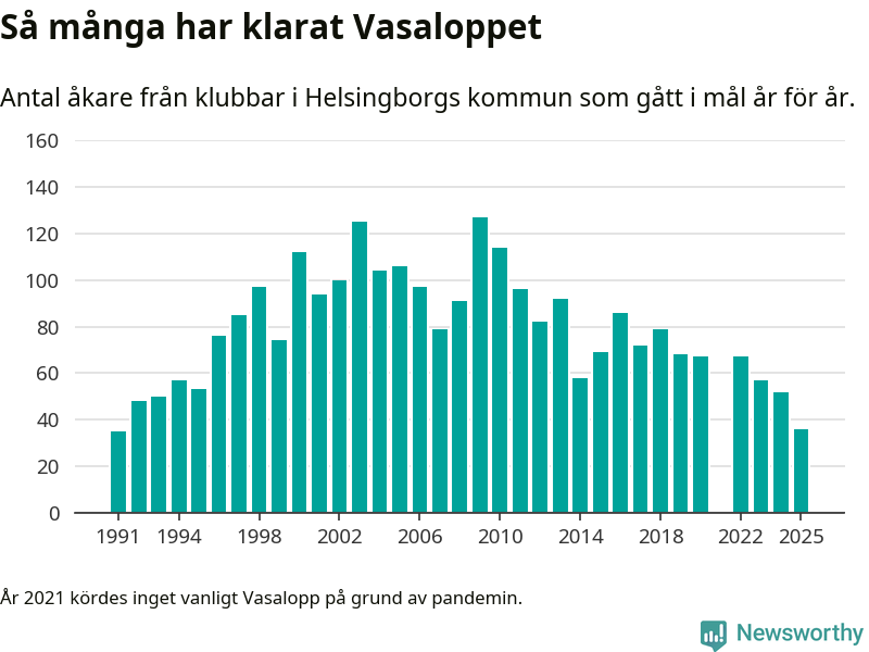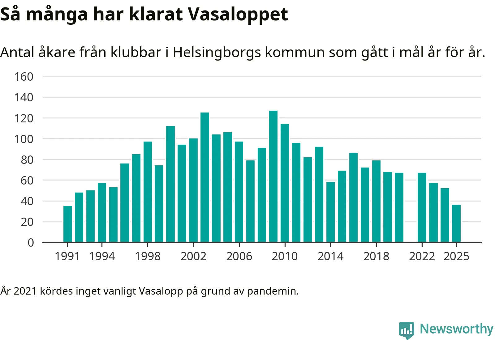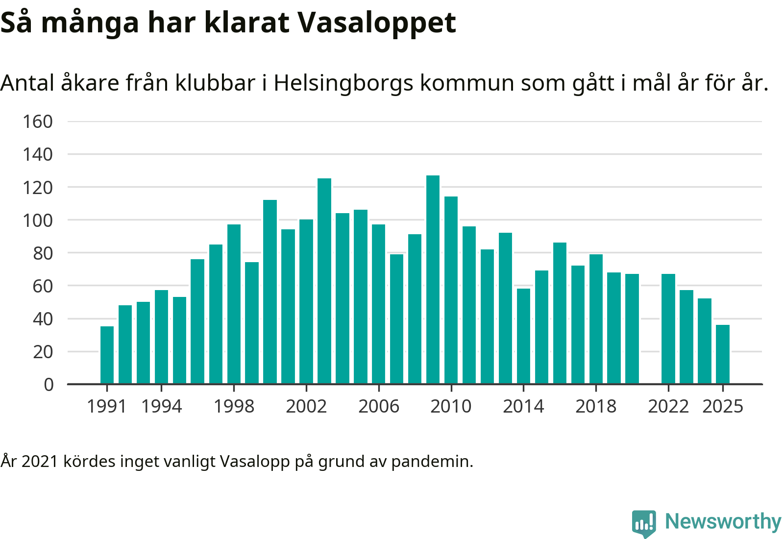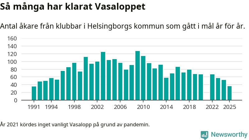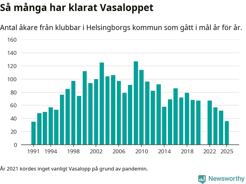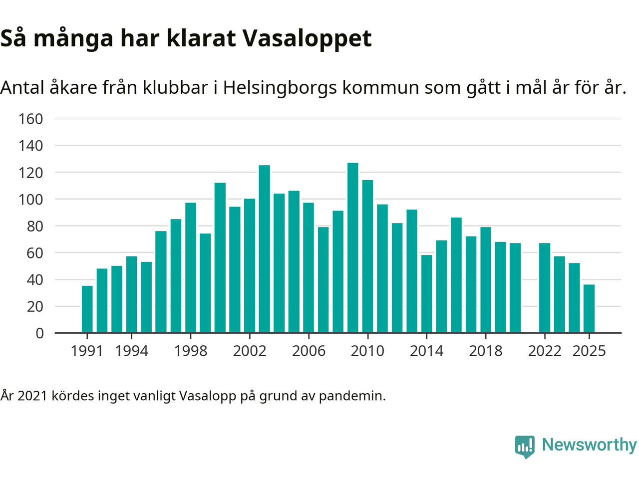 På söndag går starten för det 102:a Vasaloppet. Newsworthy har samlat in och sammanställt samtliga Vasaloppsresultat sedan 1991. Det ger en unik bild av hur skidåkare från klubbar i Helsingborgs kommun har klarat sig genom åren.