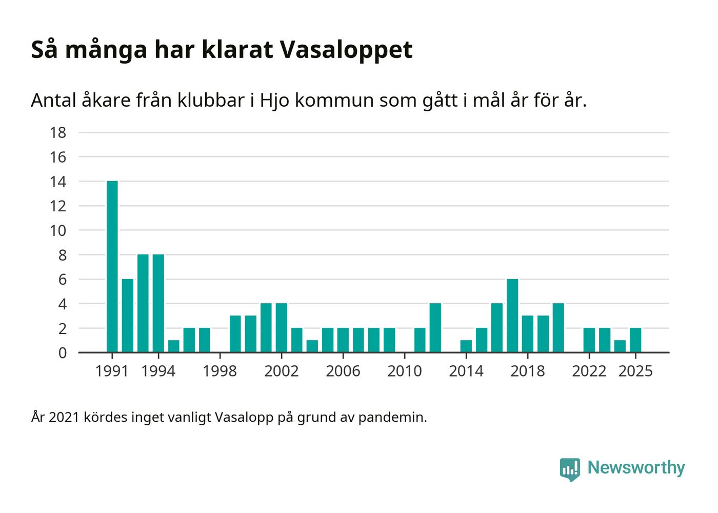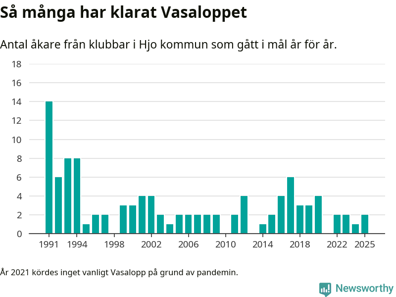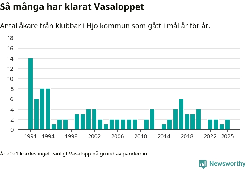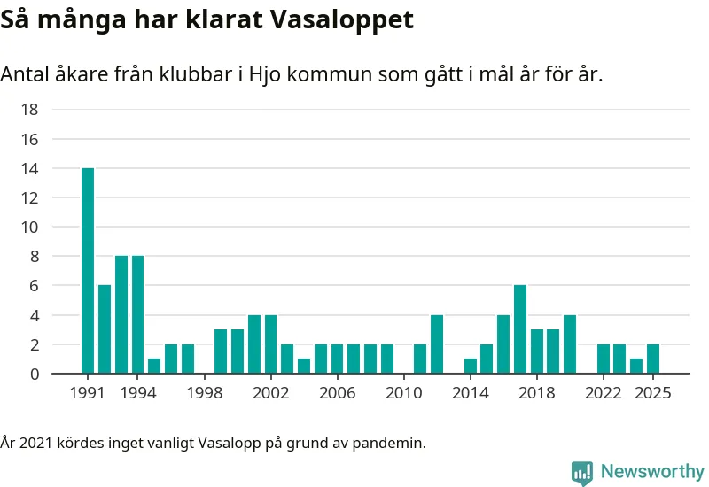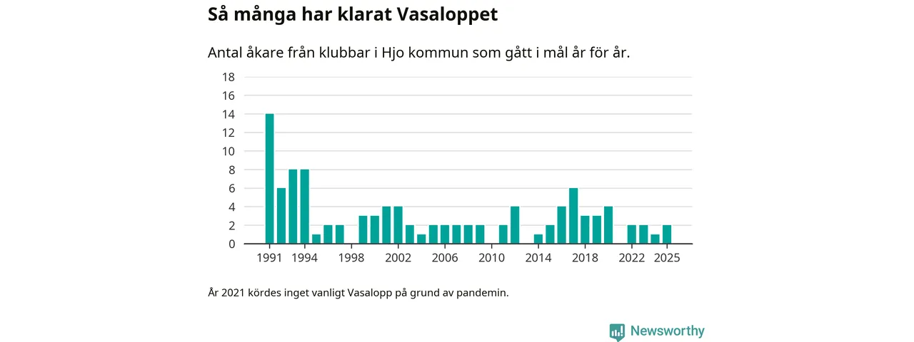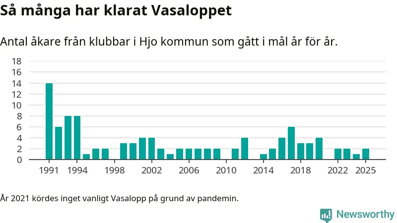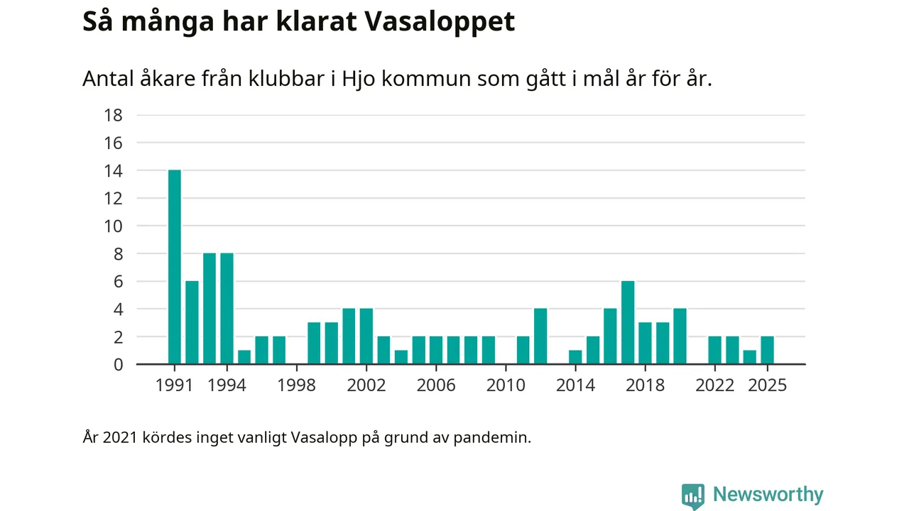På söndag går starten för det 102:a Vasaloppet. Newsworthy har samlat in och sammanställt samtliga Vasaloppsresultat sedan 1991. Det ger en unik bild av hur skidåkare från klubbar i Hjo kommun har klarat sig genom åren.