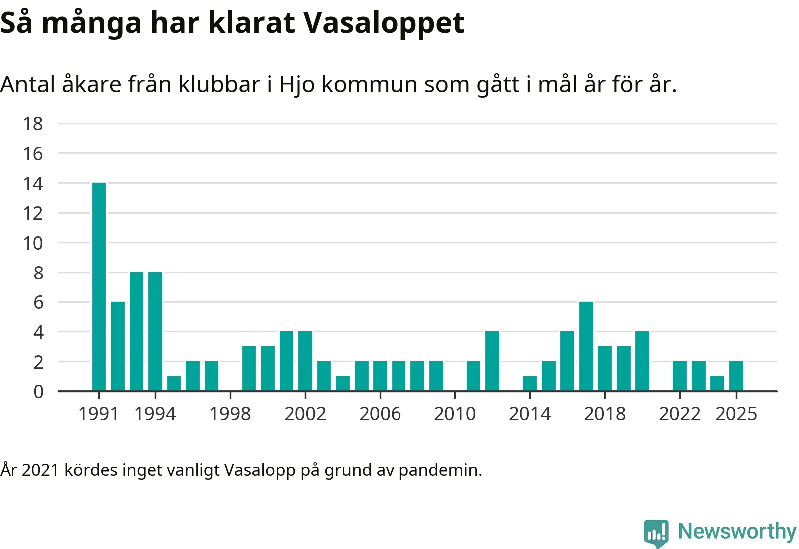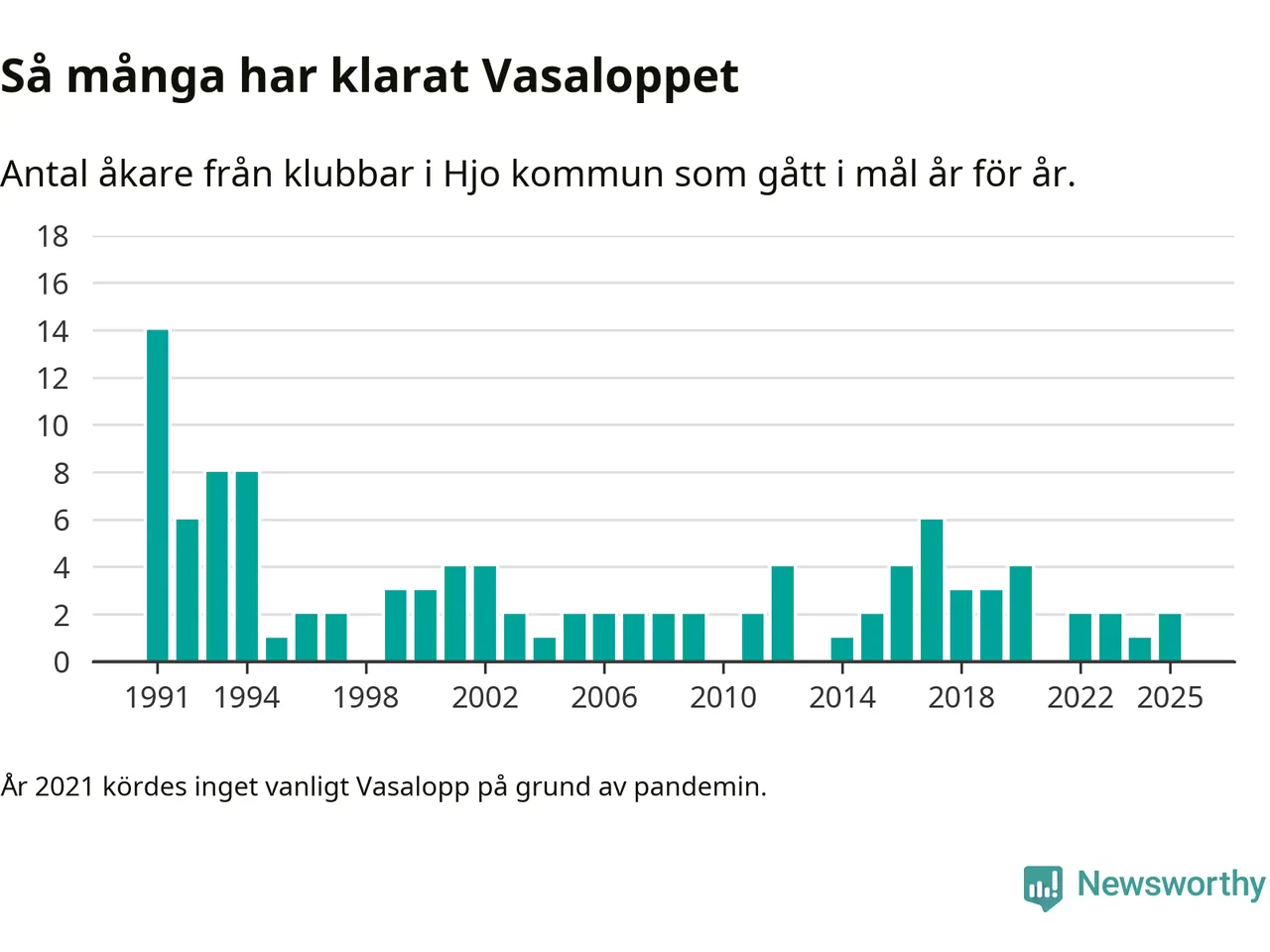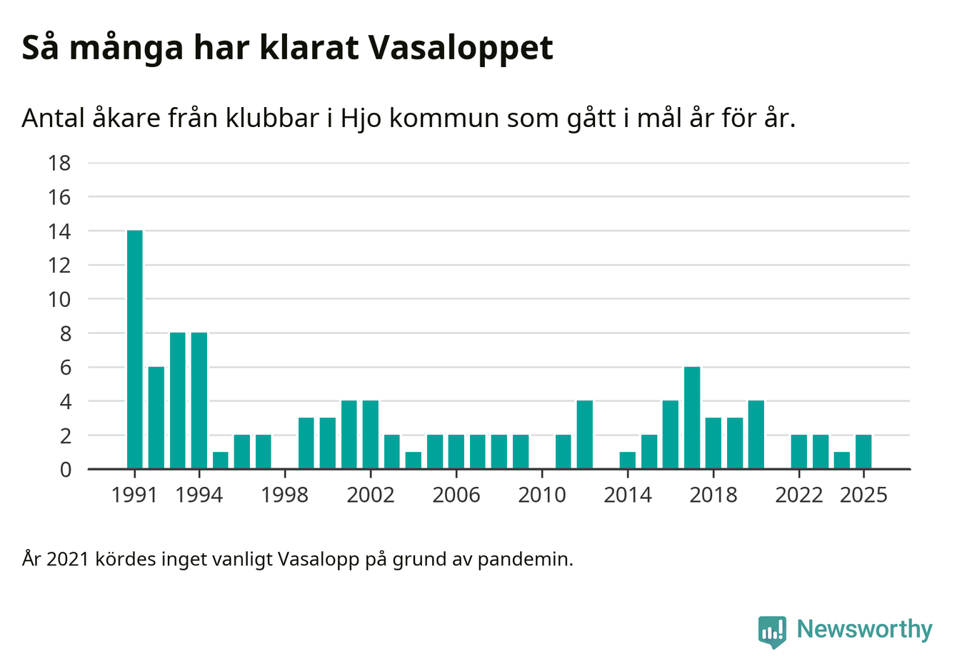På söndag går starten för det 102:a Vasaloppet. Newsworthy har samlat in och sammanställt samtliga Vasaloppsresultat sedan 1991. Det ger en unik bild av hur skidåkare från klubbar i Hjo kommun har klarat sig genom åren.