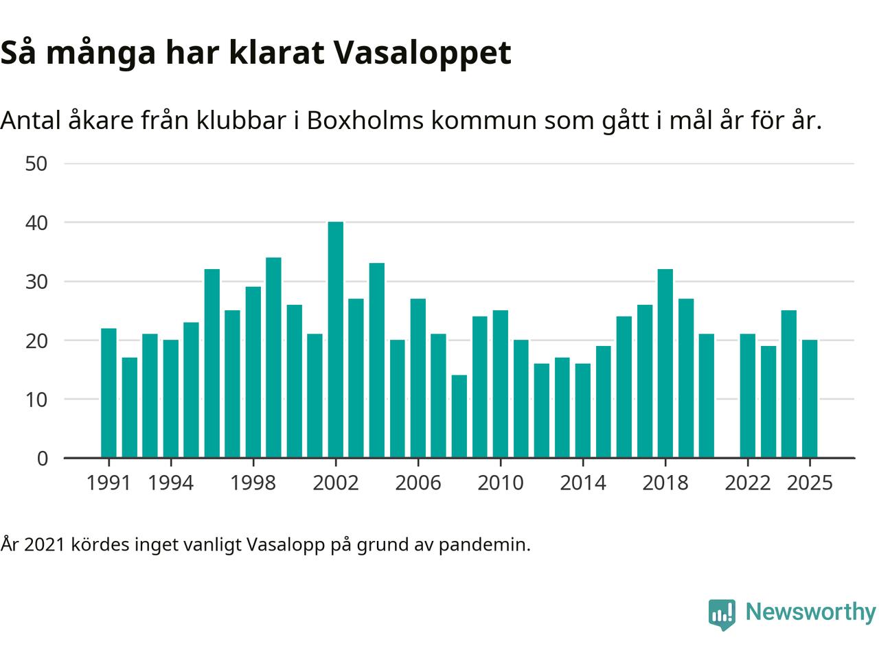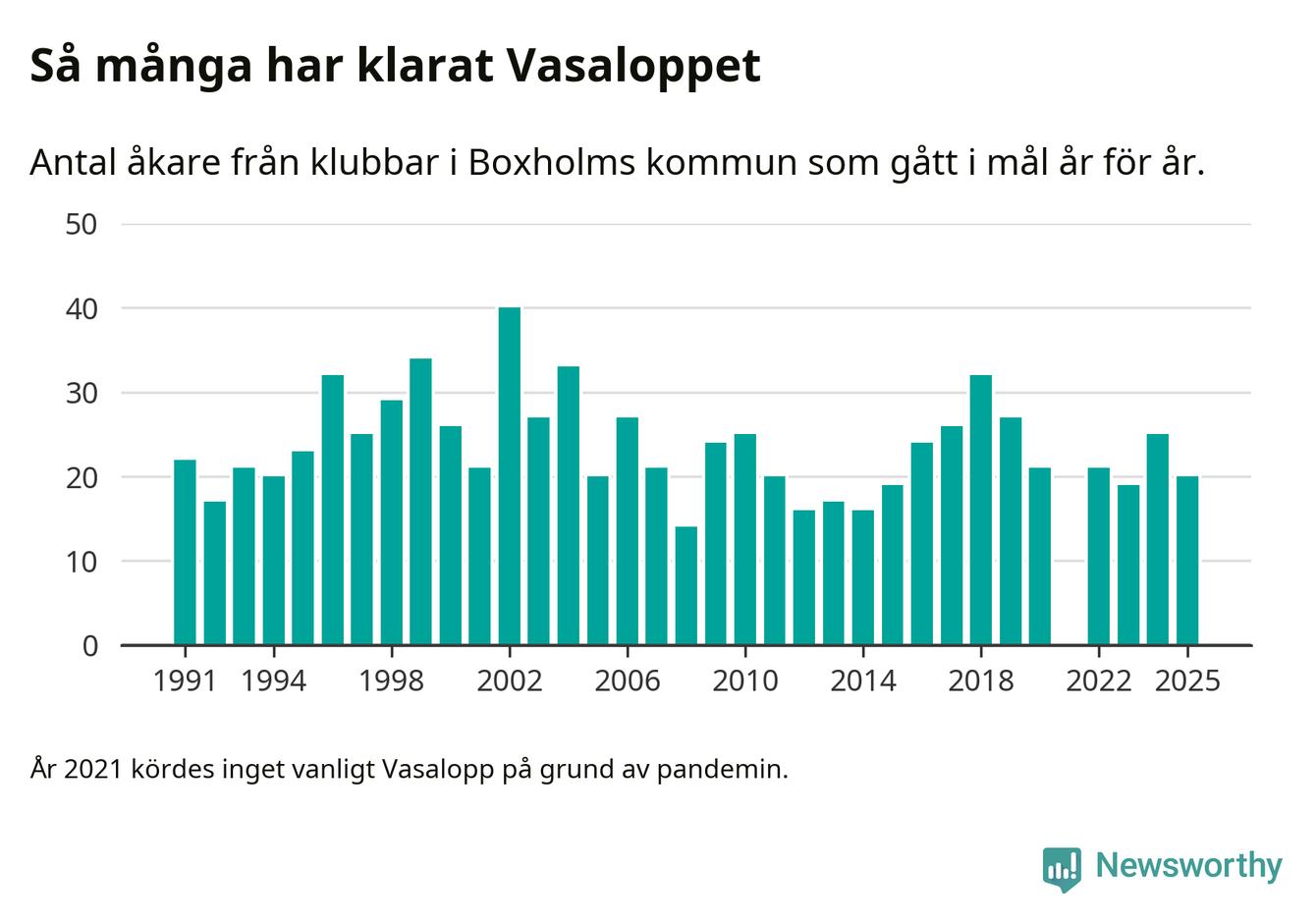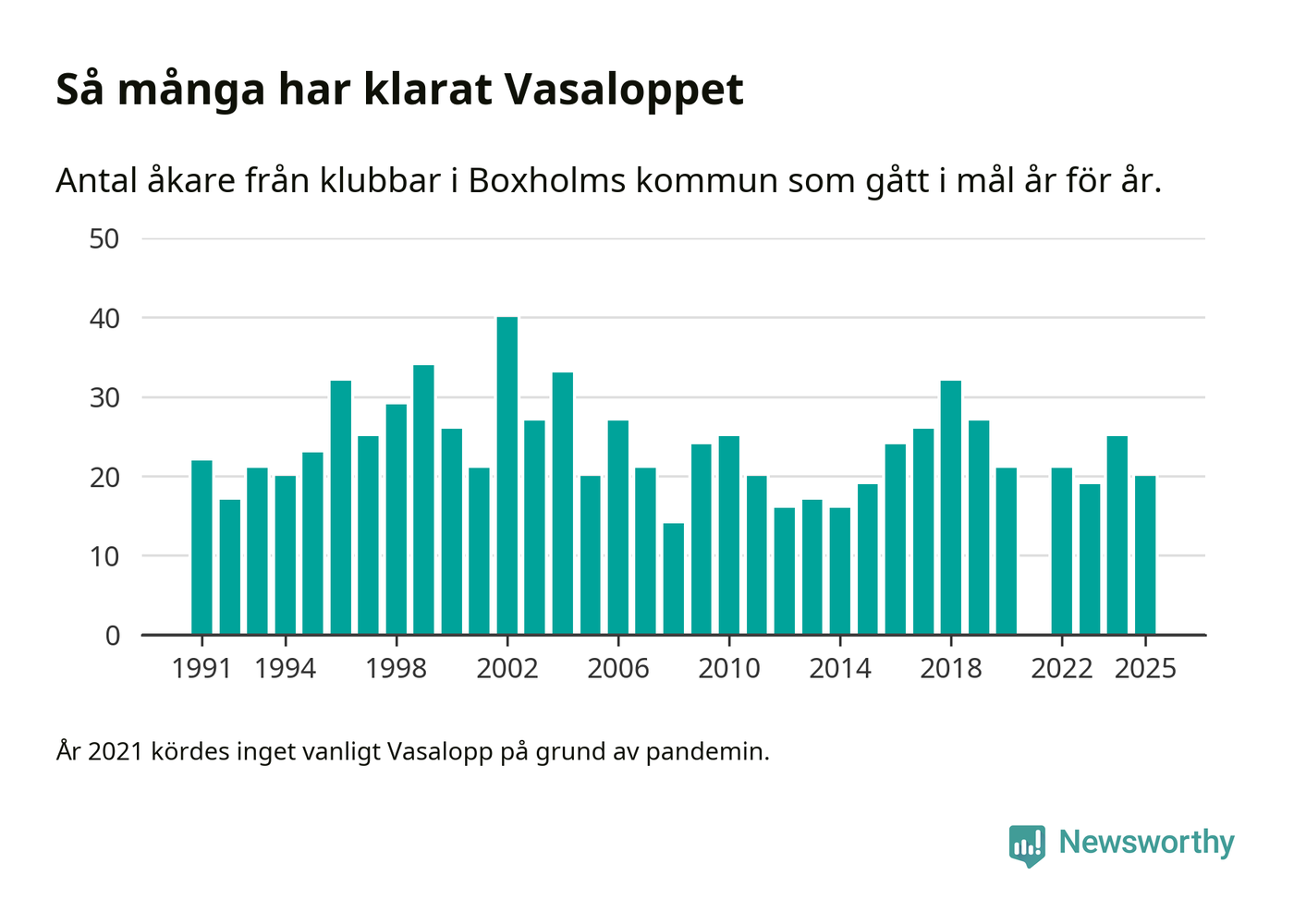 På söndag går starten för det 102:a Vasaloppet. Newsworthy har samlat in och sammanställt samtliga Vasaloppsresultat sedan 1991. Det ger en unik bild av hur skidåkare från klubbar i Boxholms kommun har klarat sig genom åren.
