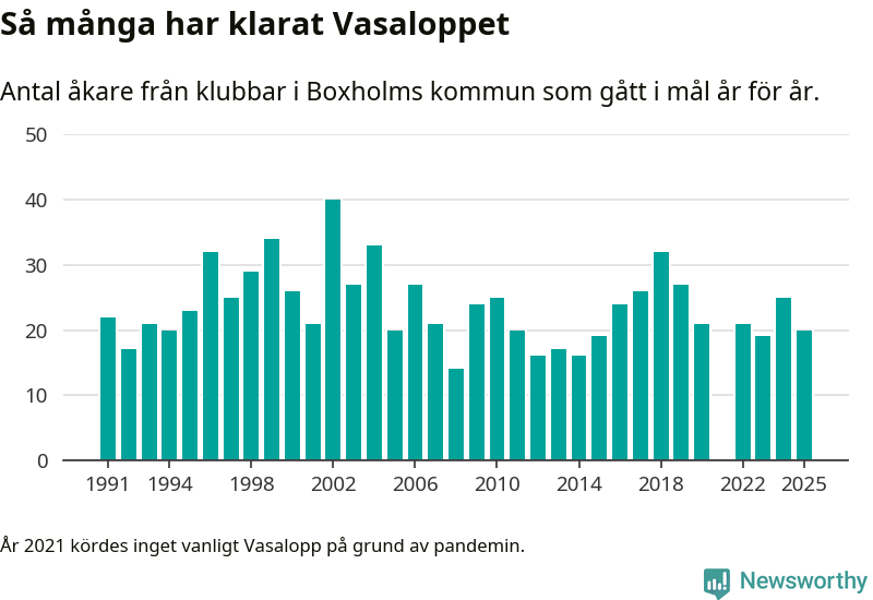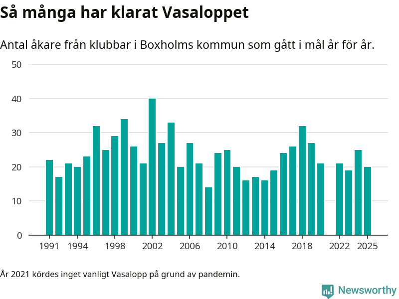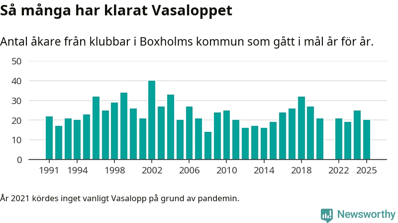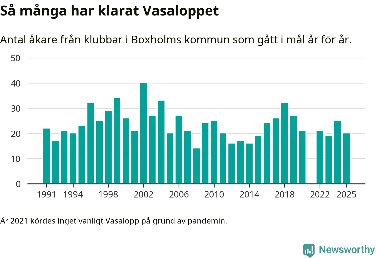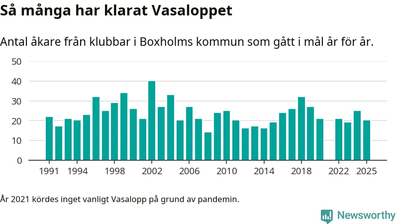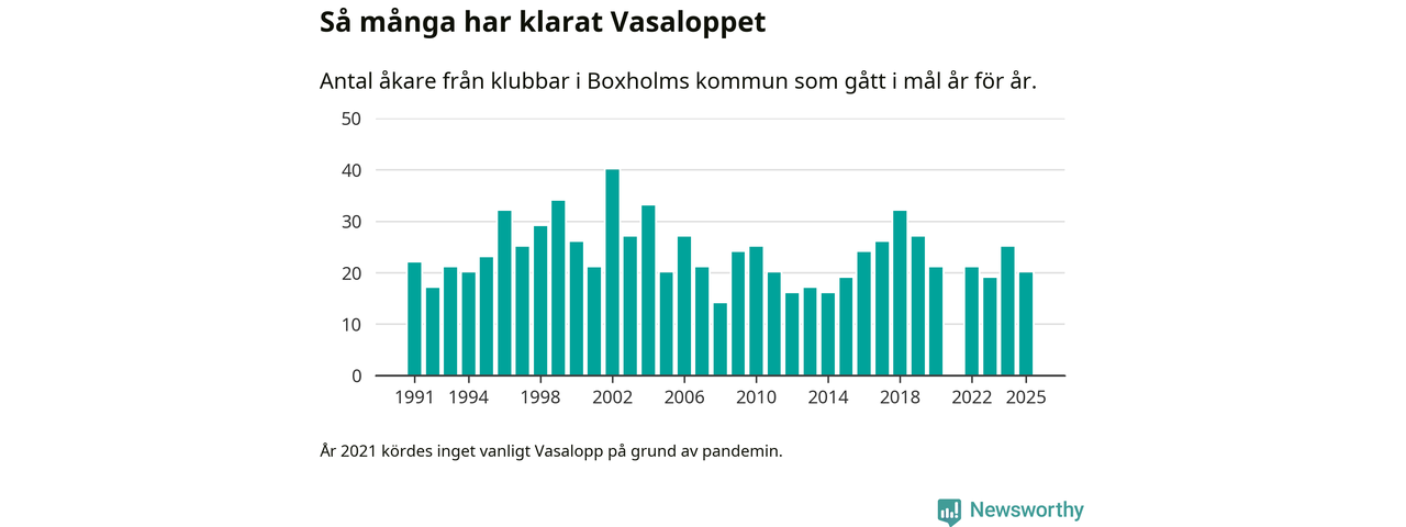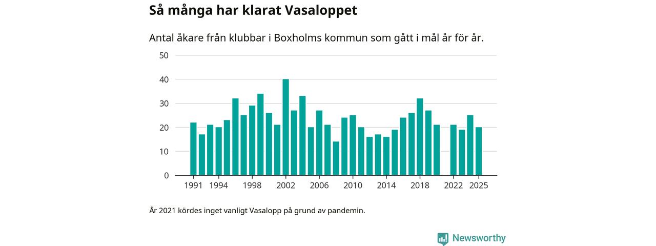 På söndag går starten för det 102:a Vasaloppet. Newsworthy har samlat in och sammanställt samtliga Vasaloppsresultat sedan 1991. Det ger en unik bild av hur skidåkare från klubbar i Boxholms kommun har klarat sig genom åren.