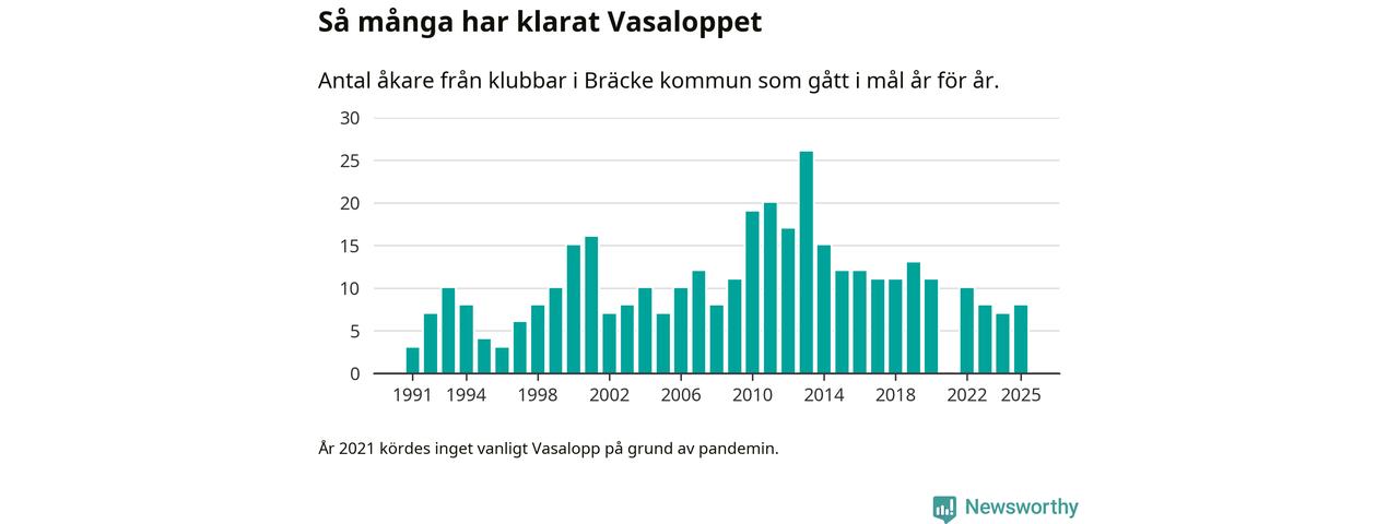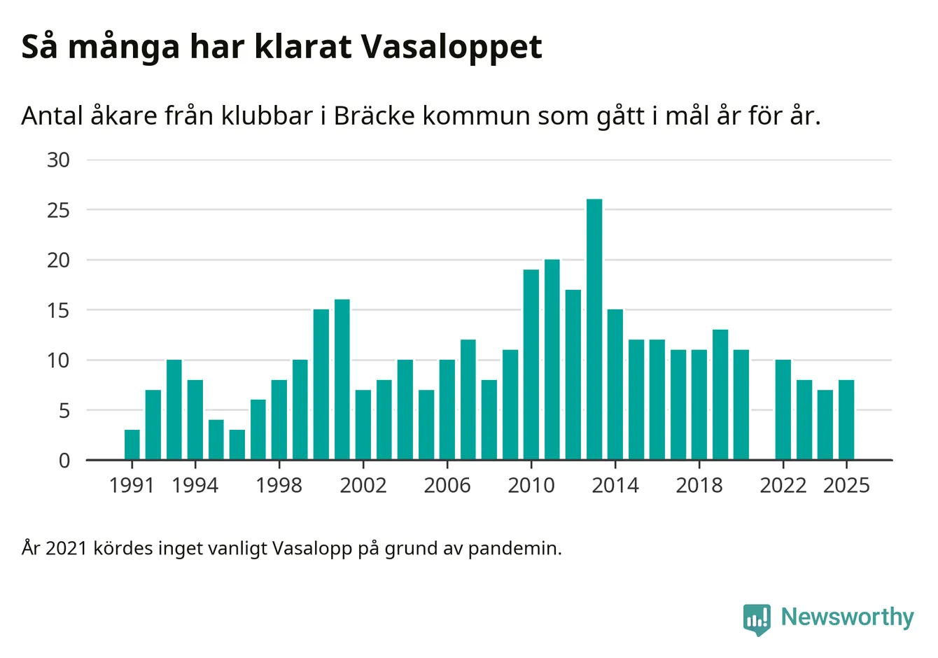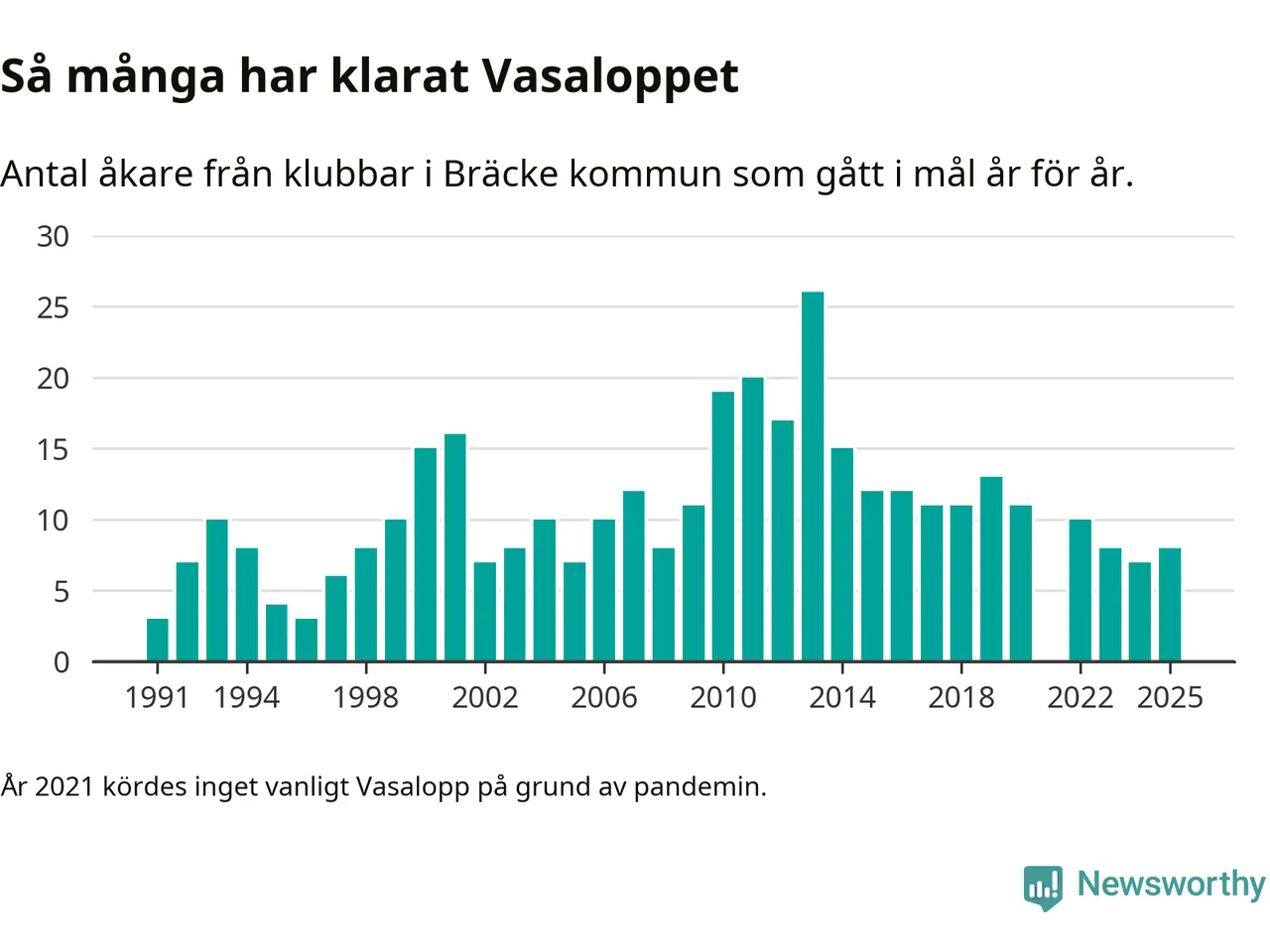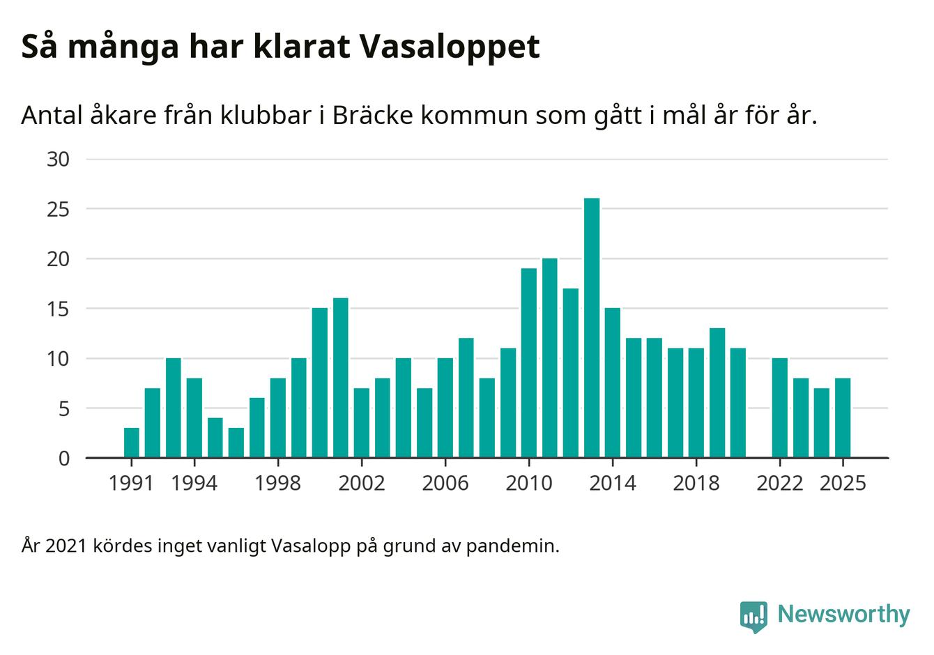 På söndag går starten för det 102:a Vasaloppet. Newsworthy har samlat in och sammanställt samtliga Vasaloppsresultat sedan 1991. Det ger en unik bild av hur skidåkare från klubbar i Bräcke kommun har klarat sig genom åren.