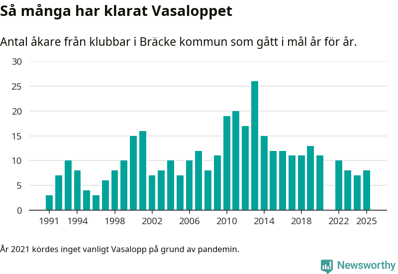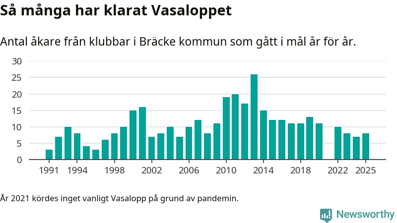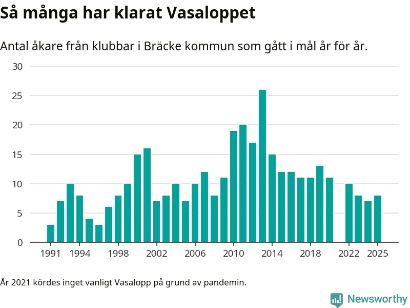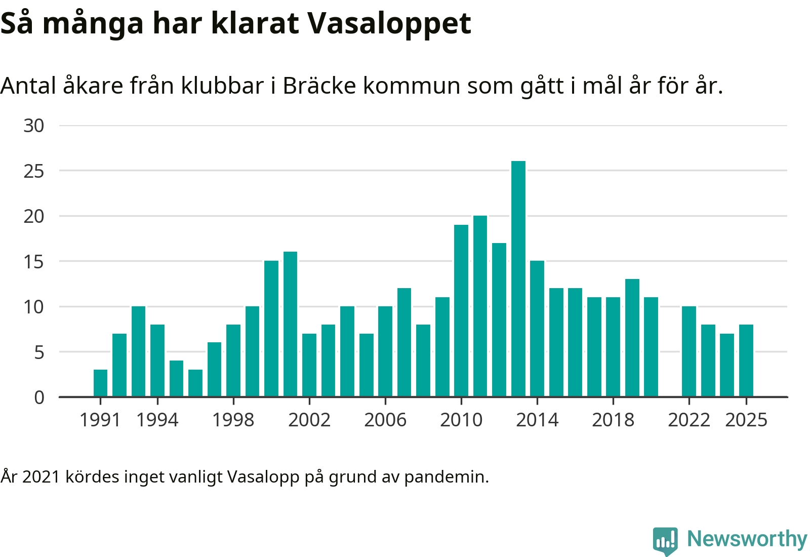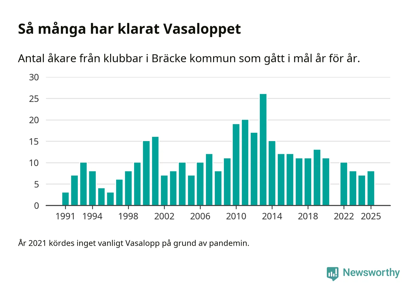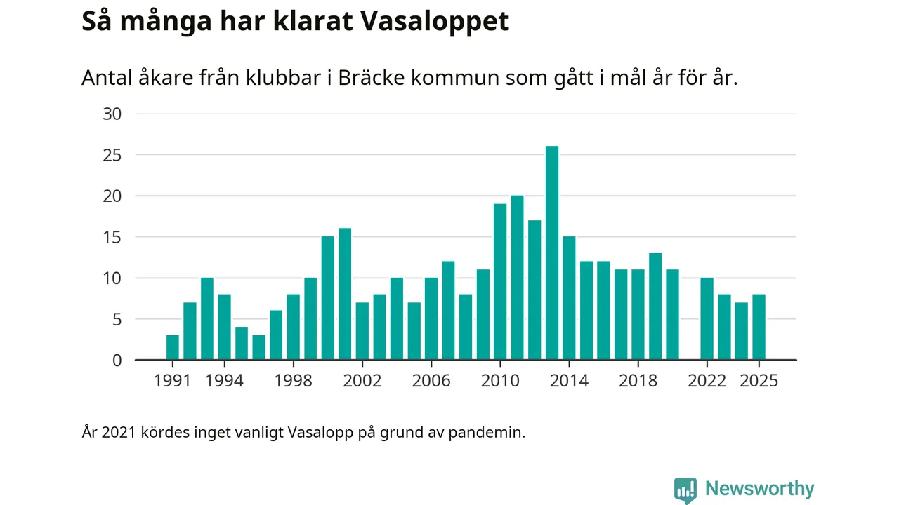 På söndag går starten för det 102:a Vasaloppet. Newsworthy har samlat in och sammanställt samtliga Vasaloppsresultat sedan 1991. Det ger en unik bild av hur skidåkare från klubbar i Bräcke kommun har klarat sig genom åren.