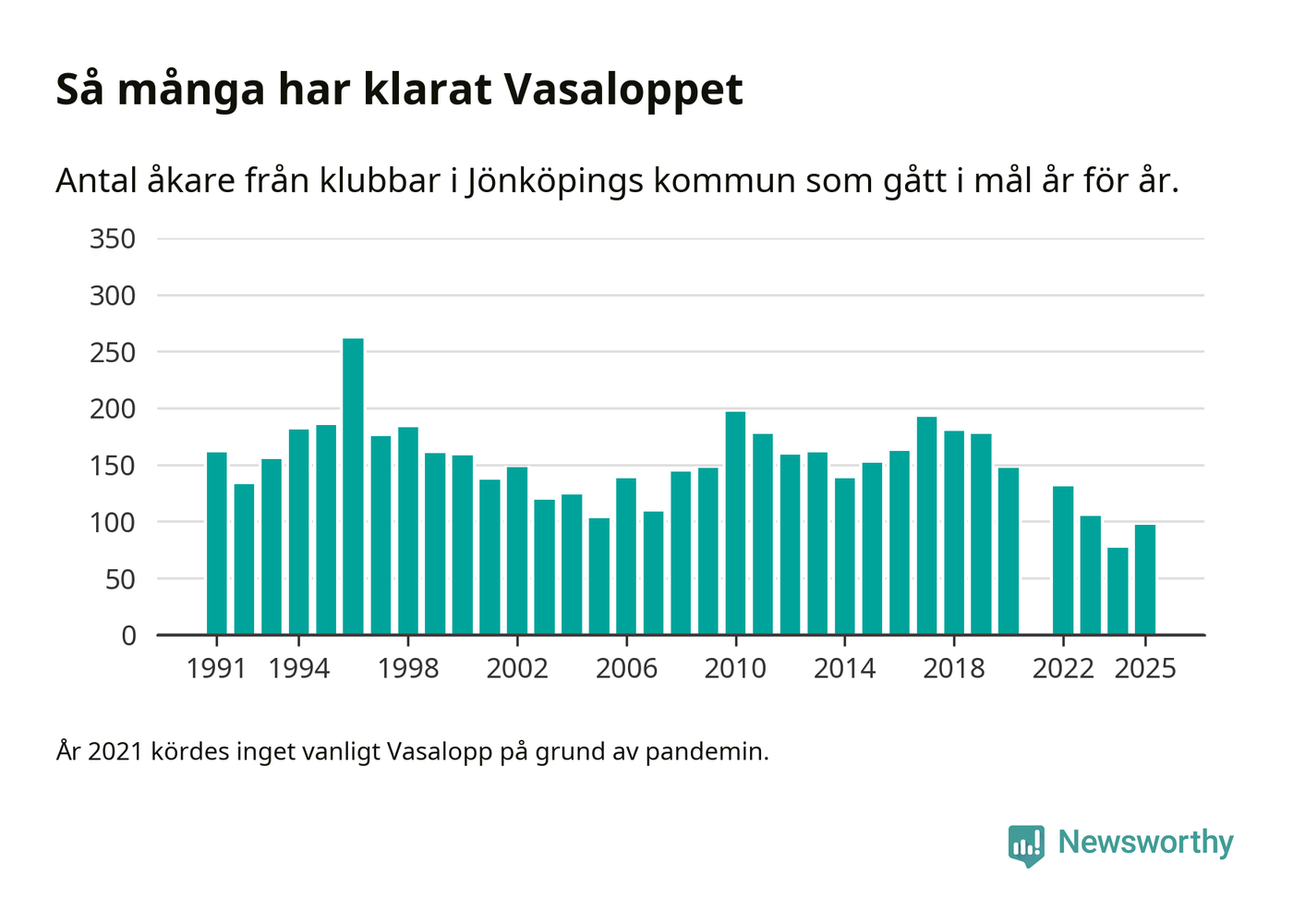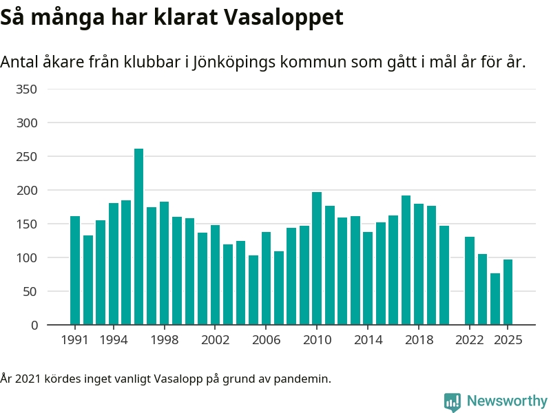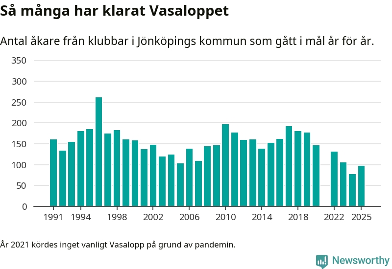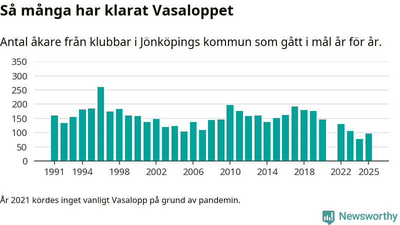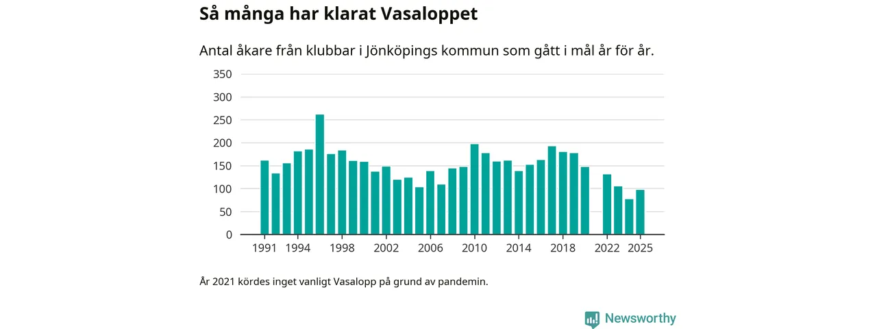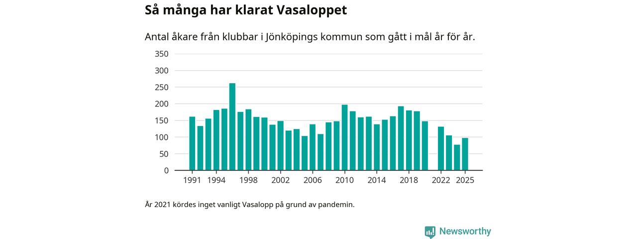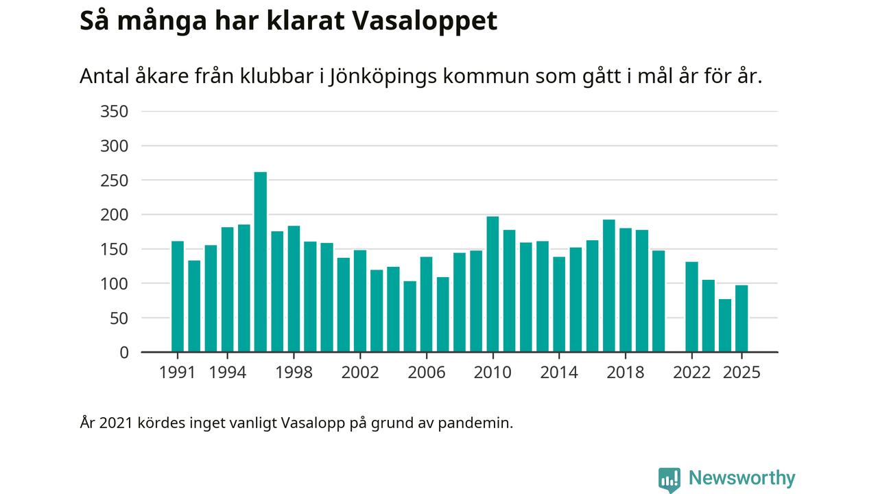 På söndag går starten för det 102:a Vasaloppet. Newsworthy har samlat in och sammanställt samtliga Vasaloppsresultat sedan 1991. Det ger en unik bild av hur skidåkare från klubbar i Jönköpings kommun har klarat sig genom åren.