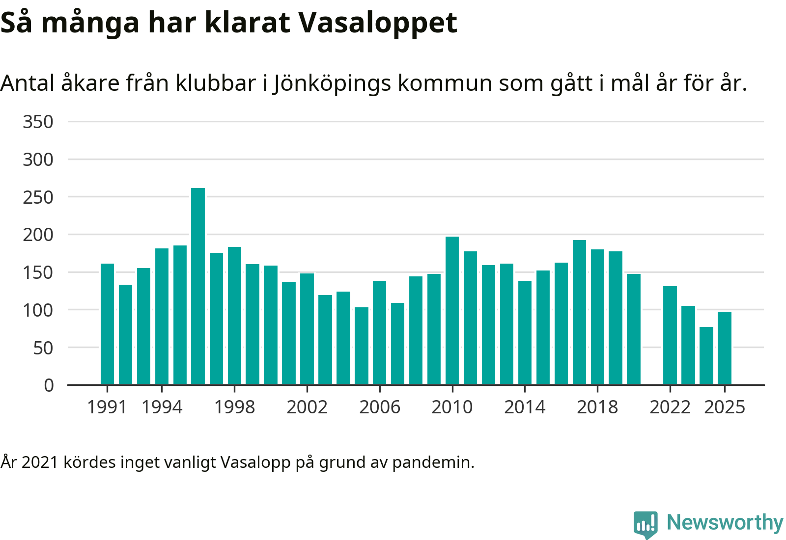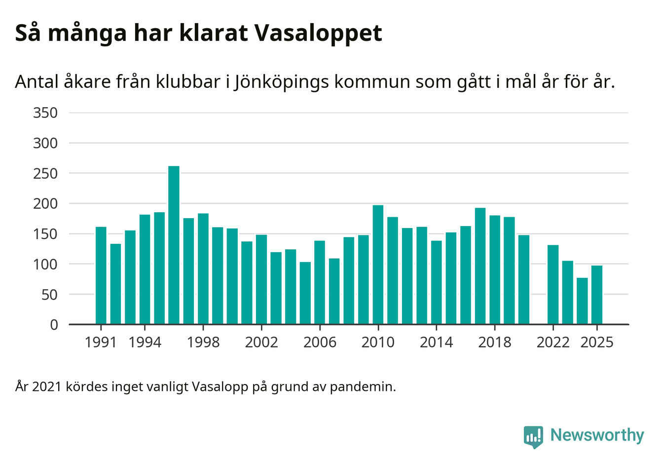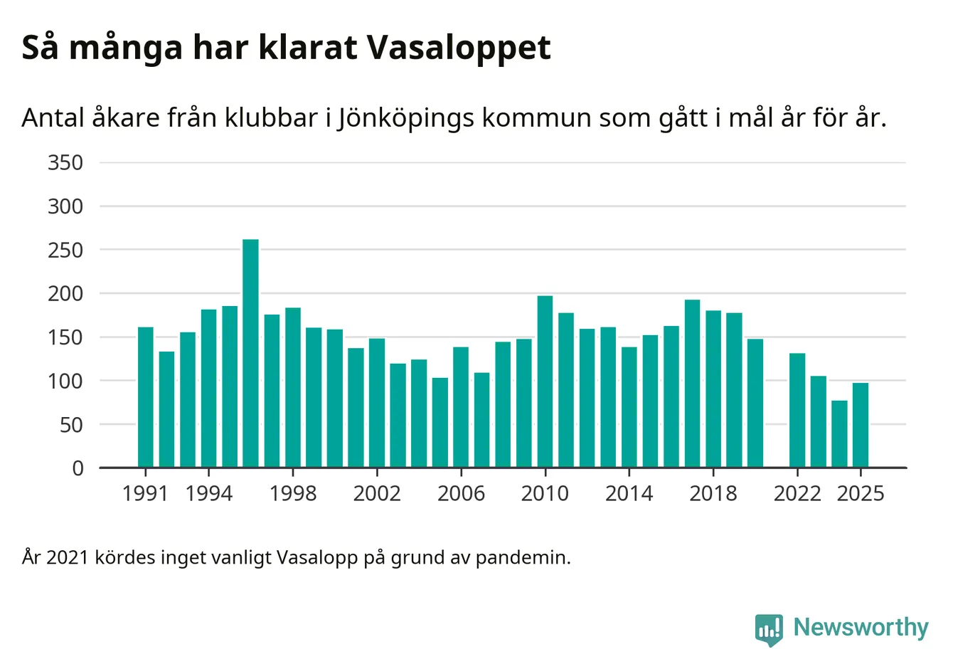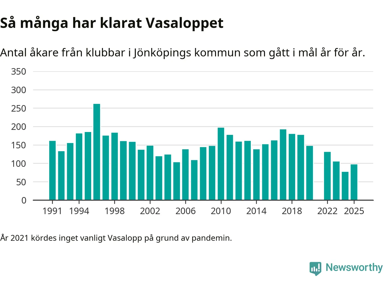 På söndag går starten för det 102:a Vasaloppet. Newsworthy har samlat in och sammanställt samtliga Vasaloppsresultat sedan 1991. Det ger en unik bild av hur skidåkare från klubbar i Jönköpings kommun har klarat sig genom åren.