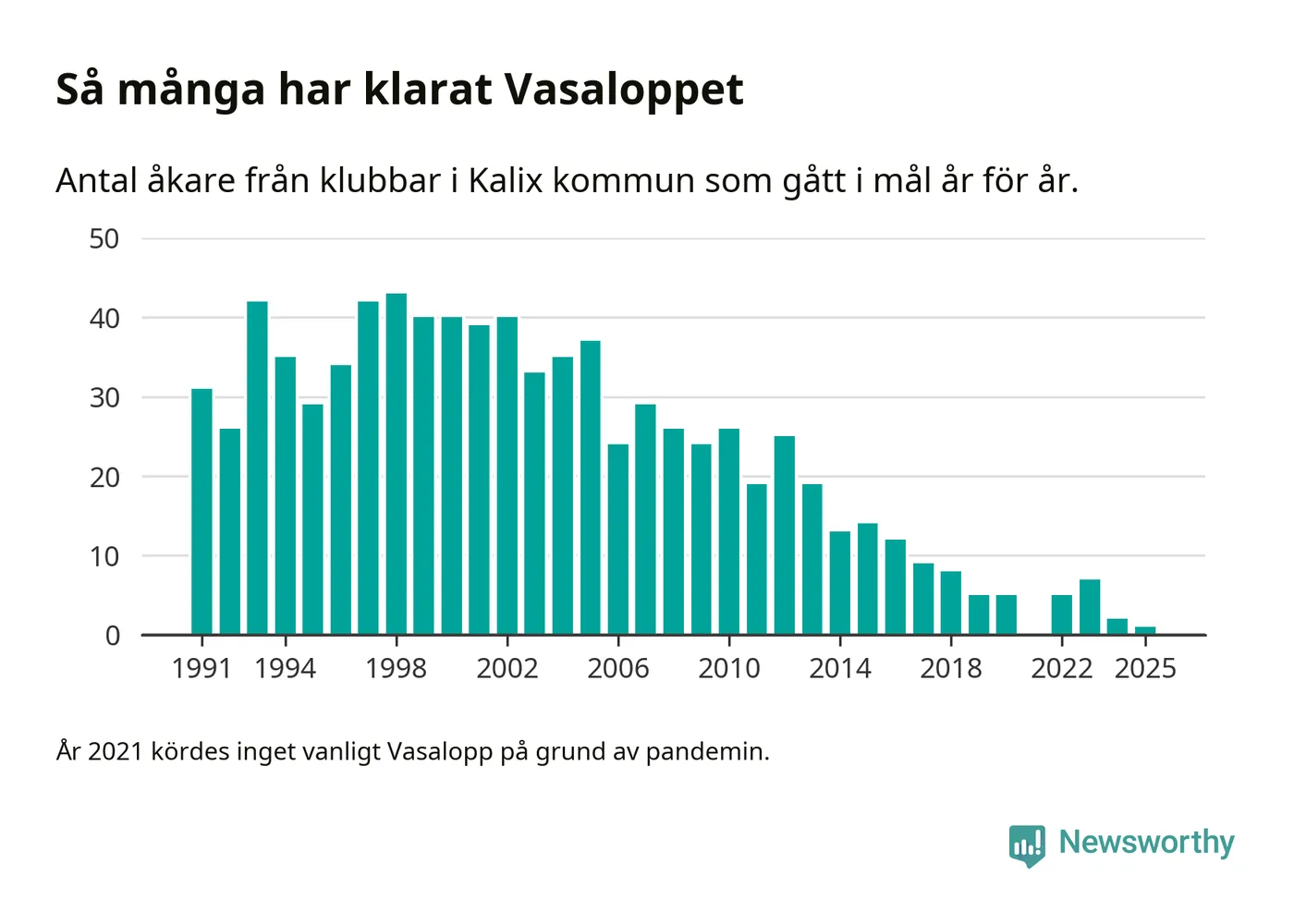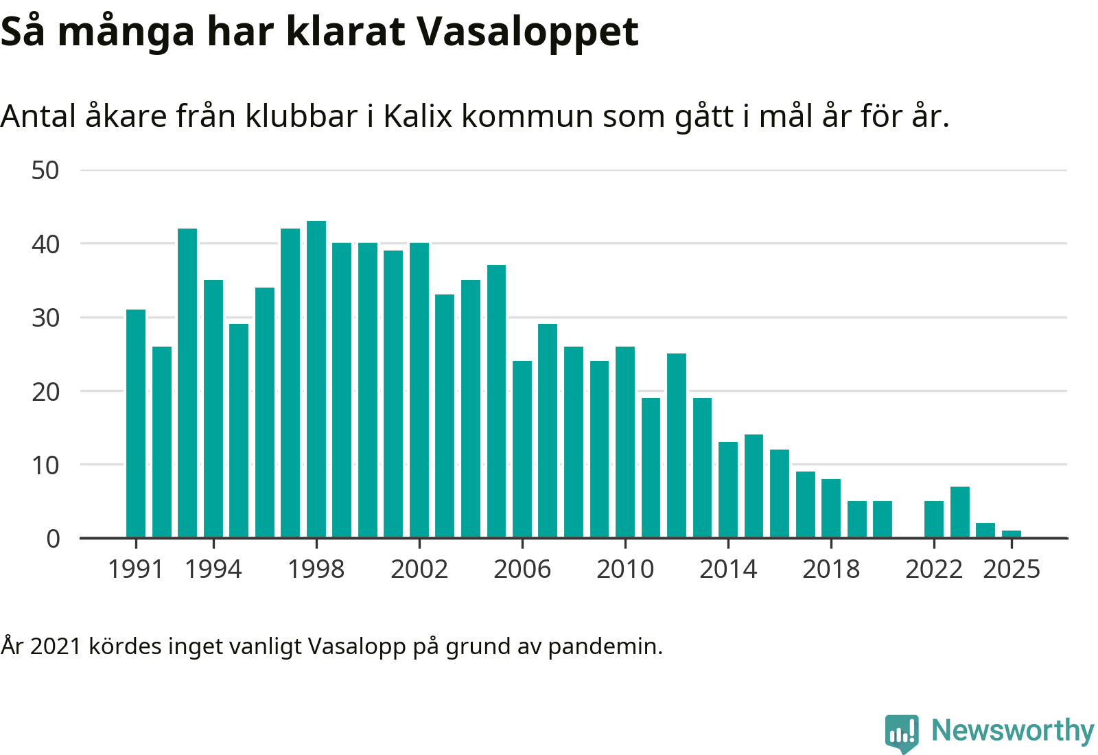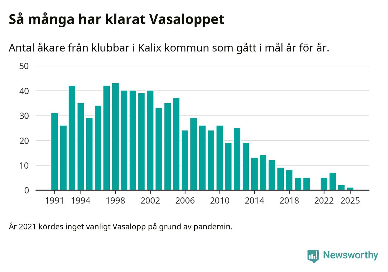 På söndag går starten för det 102:a Vasaloppet. Newsworthy har samlat in och sammanställt samtliga Vasaloppsresultat sedan 1991. Det ger en unik bild av hur skidåkare från klubbar i Kalix kommun har klarat sig genom åren.