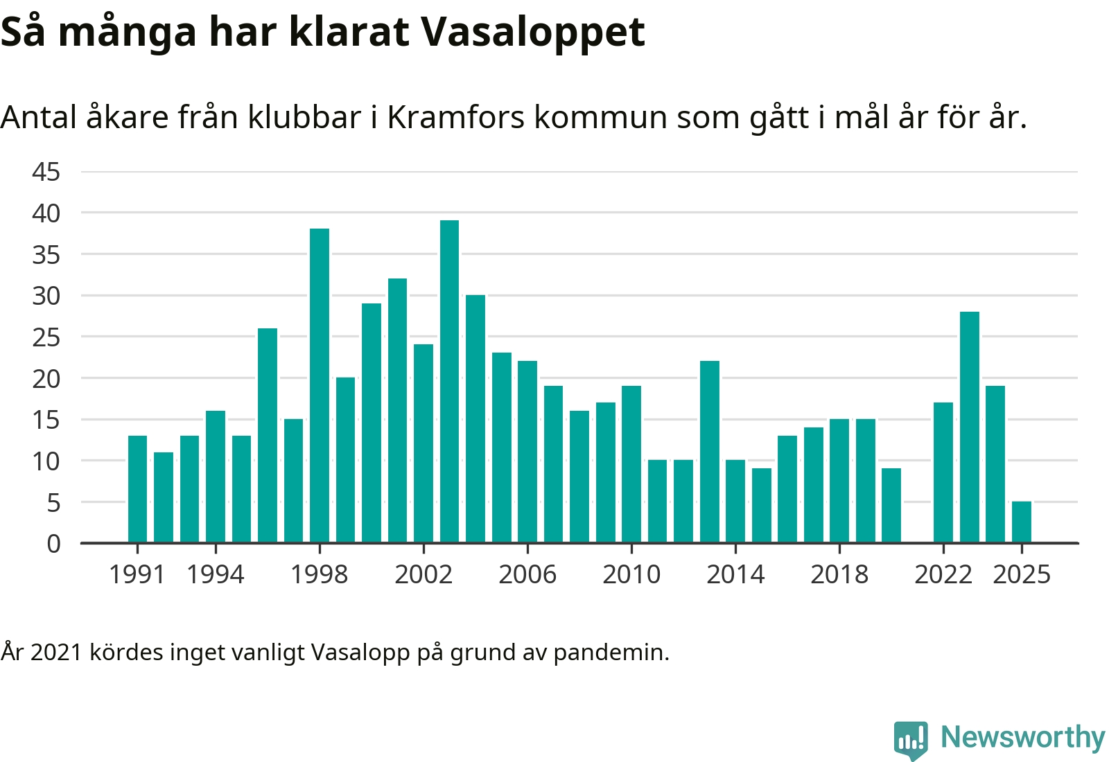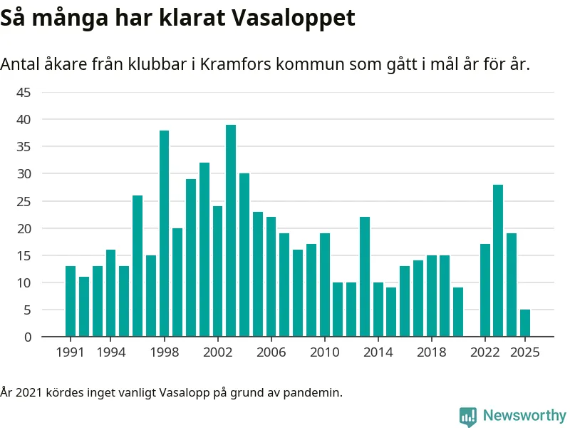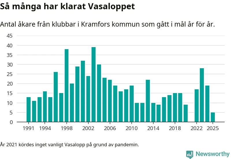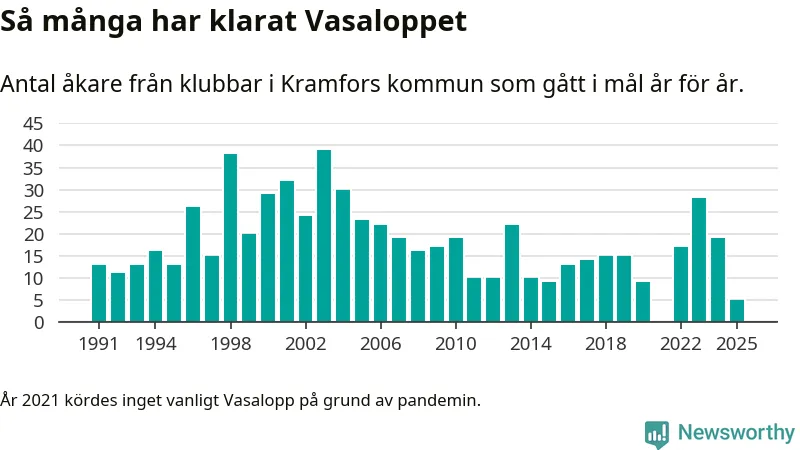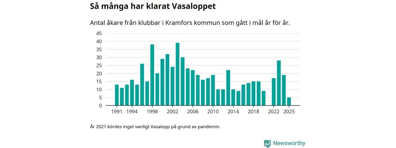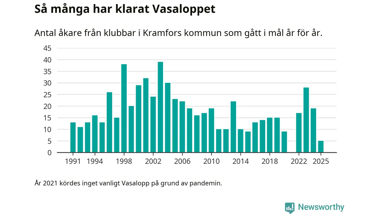 På söndag går starten för det 102:a Vasaloppet. Newsworthy har samlat in och sammanställt samtliga Vasaloppsresultat sedan 1991. Det ger en unik bild av hur skidåkare från klubbar i Kramfors kommun har klarat sig genom åren.