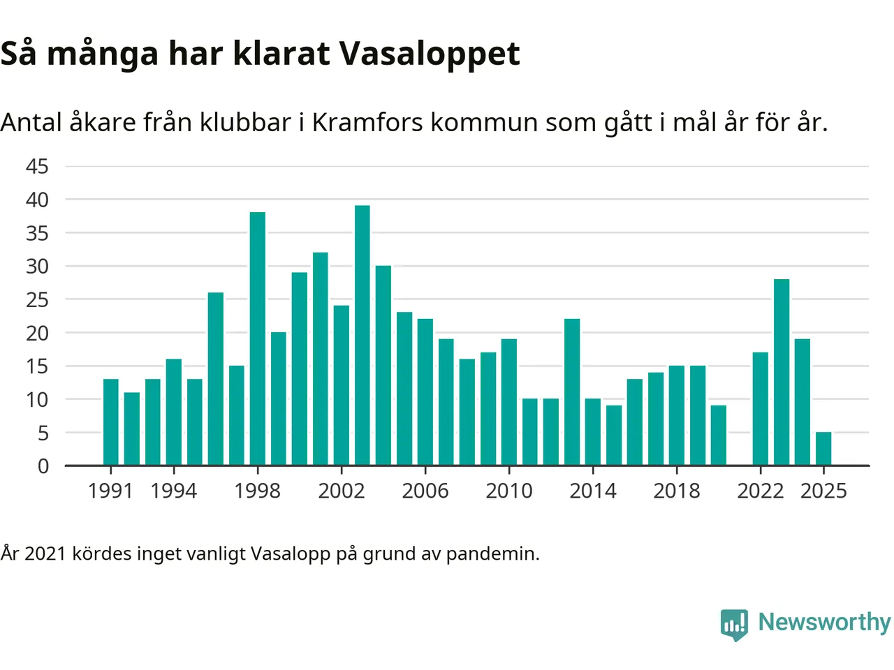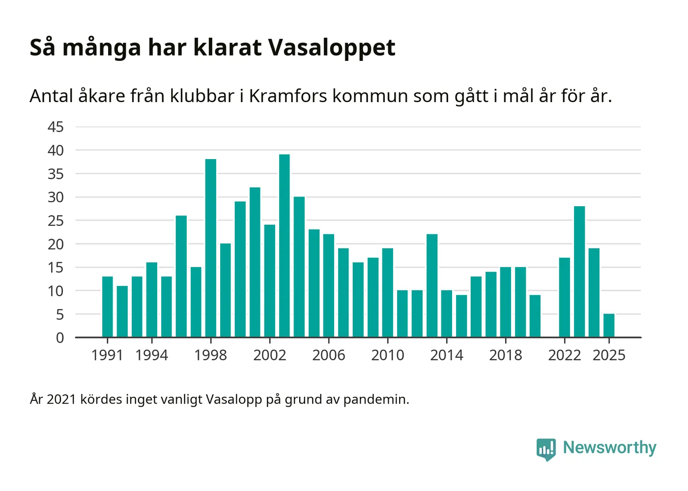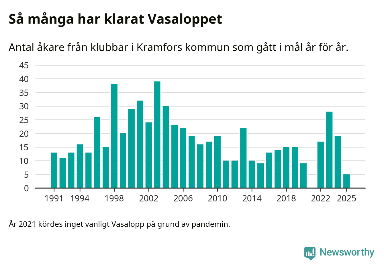 På söndag går starten för det 102:a Vasaloppet. Newsworthy har samlat in och sammanställt samtliga Vasaloppsresultat sedan 1991. Det ger en unik bild av hur skidåkare från klubbar i Kramfors kommun har klarat sig genom åren.