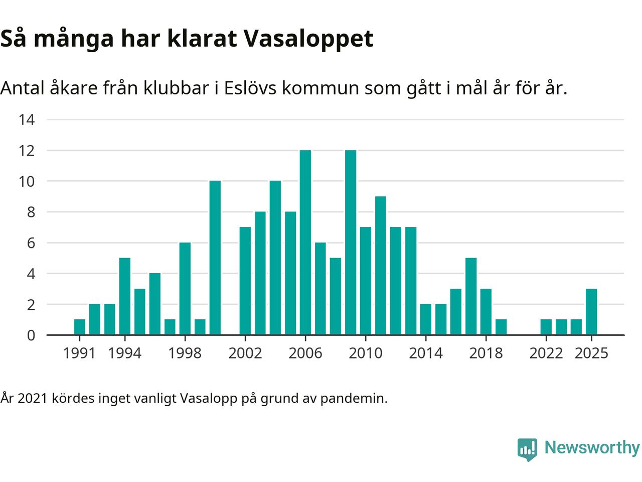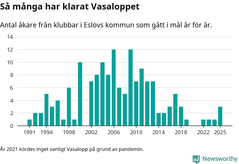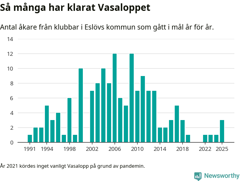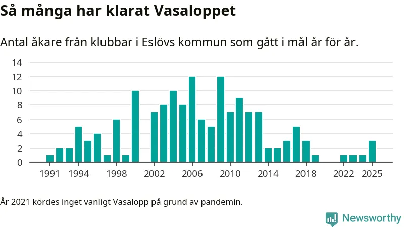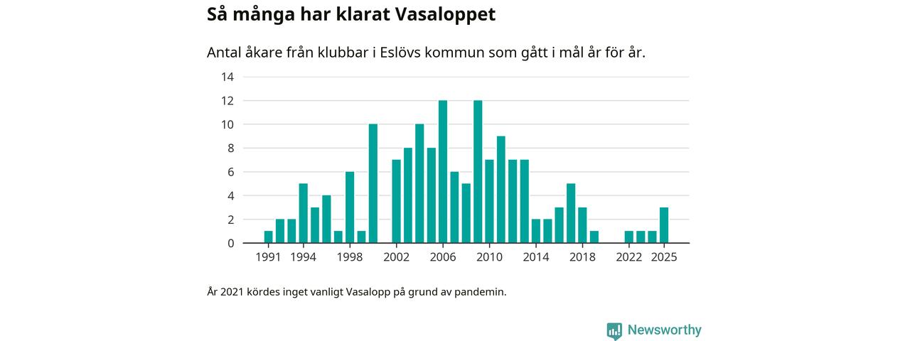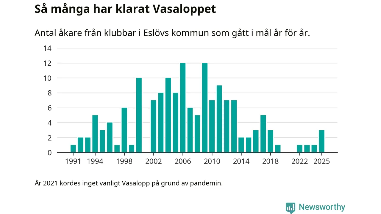 På söndag går starten för det 102:a Vasaloppet. Newsworthy har samlat in och sammanställt samtliga Vasaloppsresultat sedan 1991. Det ger en unik bild av hur skidåkare från klubbar i Eslövs kommun har klarat sig genom åren.
