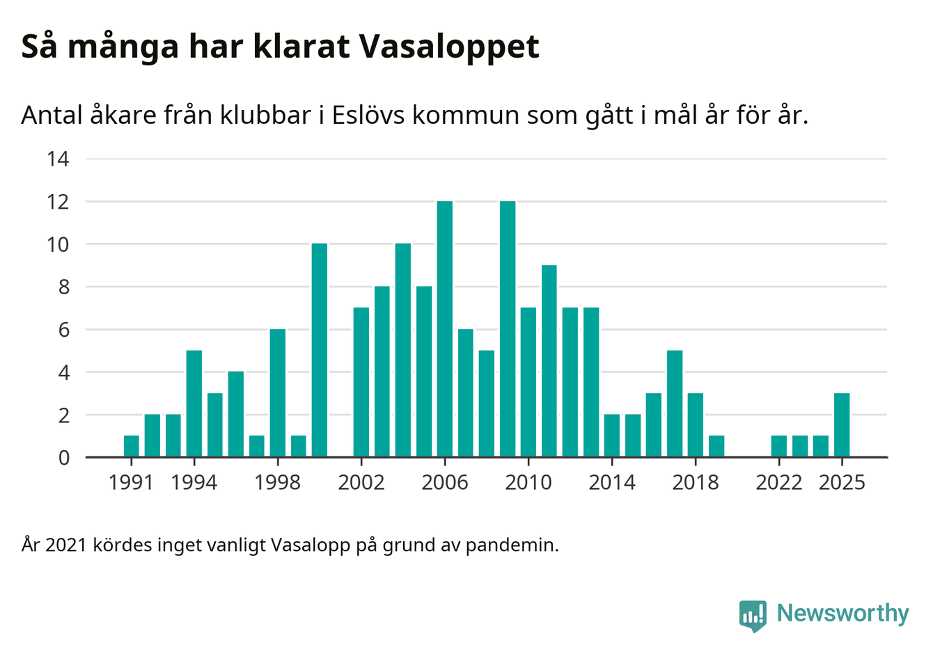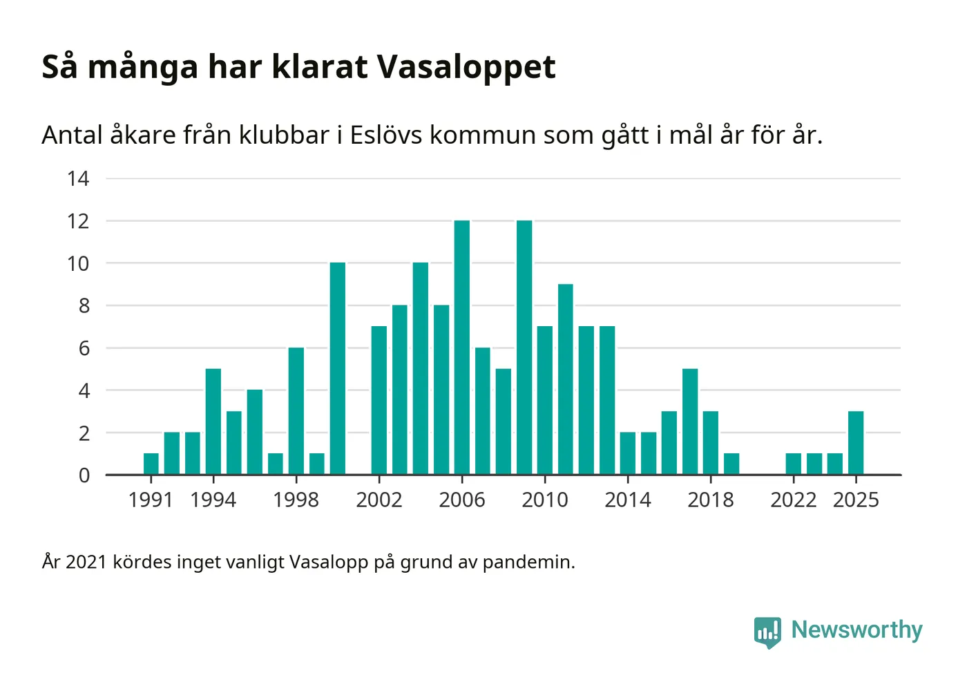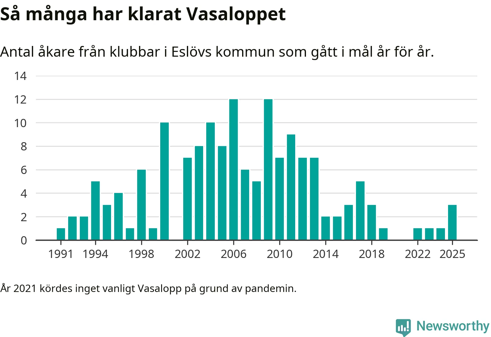 På söndag går starten för det 102:a Vasaloppet. Newsworthy har samlat in och sammanställt samtliga Vasaloppsresultat sedan 1991. Det ger en unik bild av hur skidåkare från klubbar i Eslövs kommun har klarat sig genom åren.