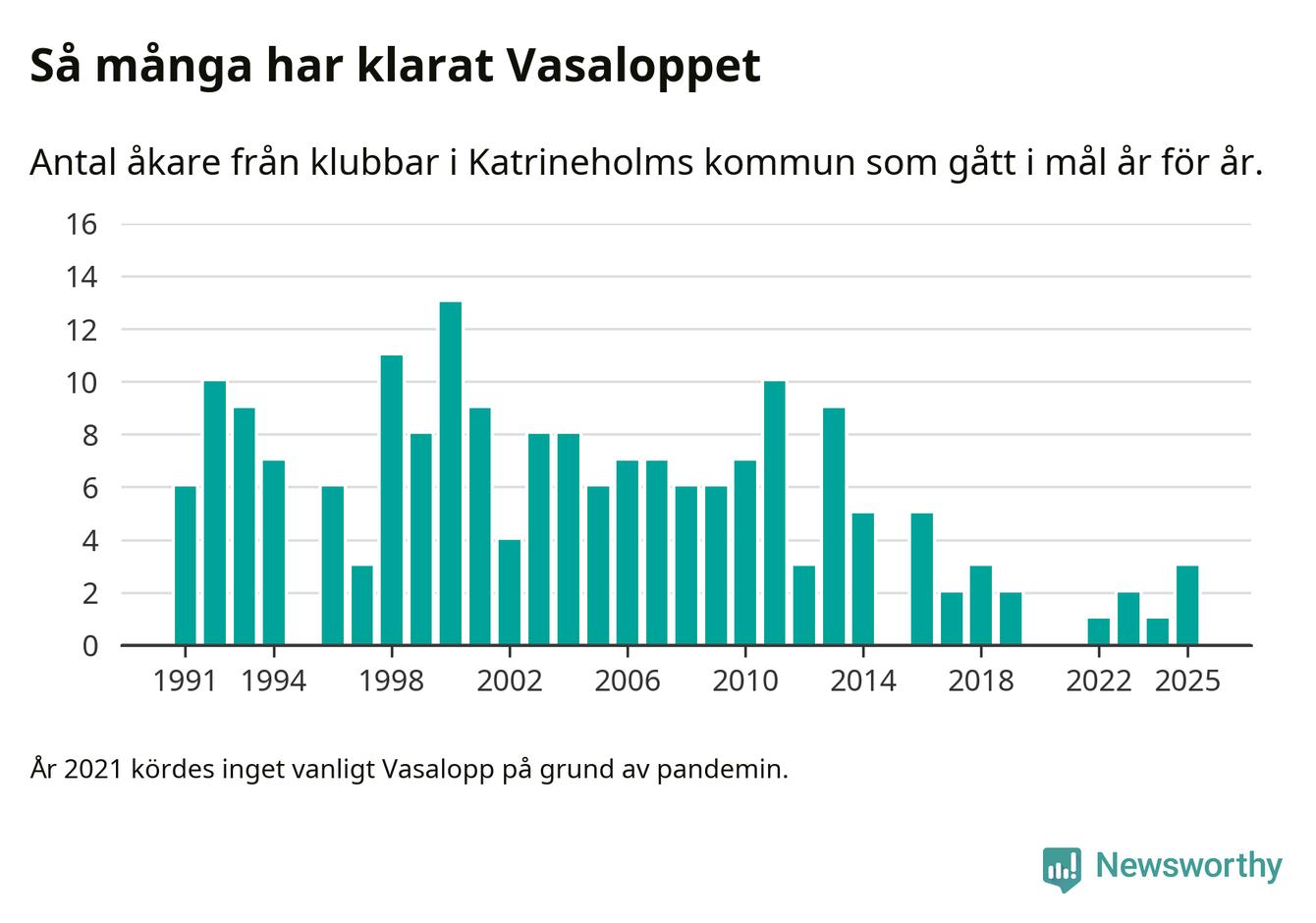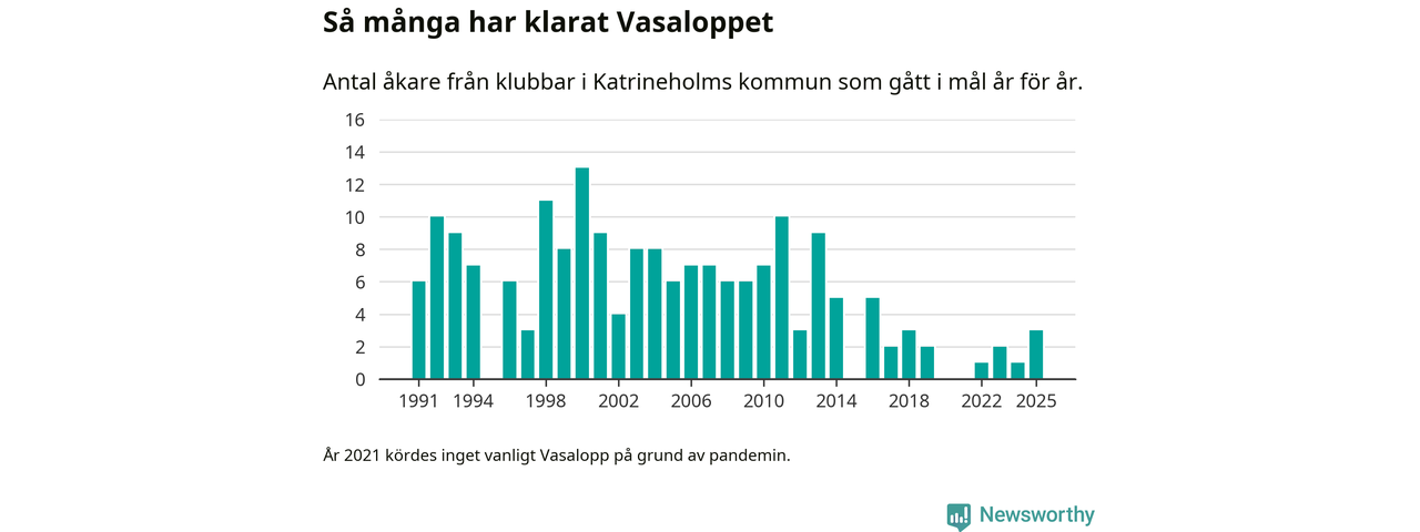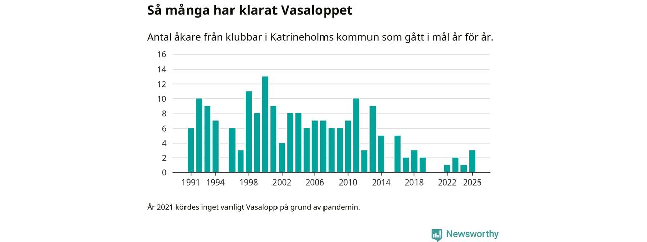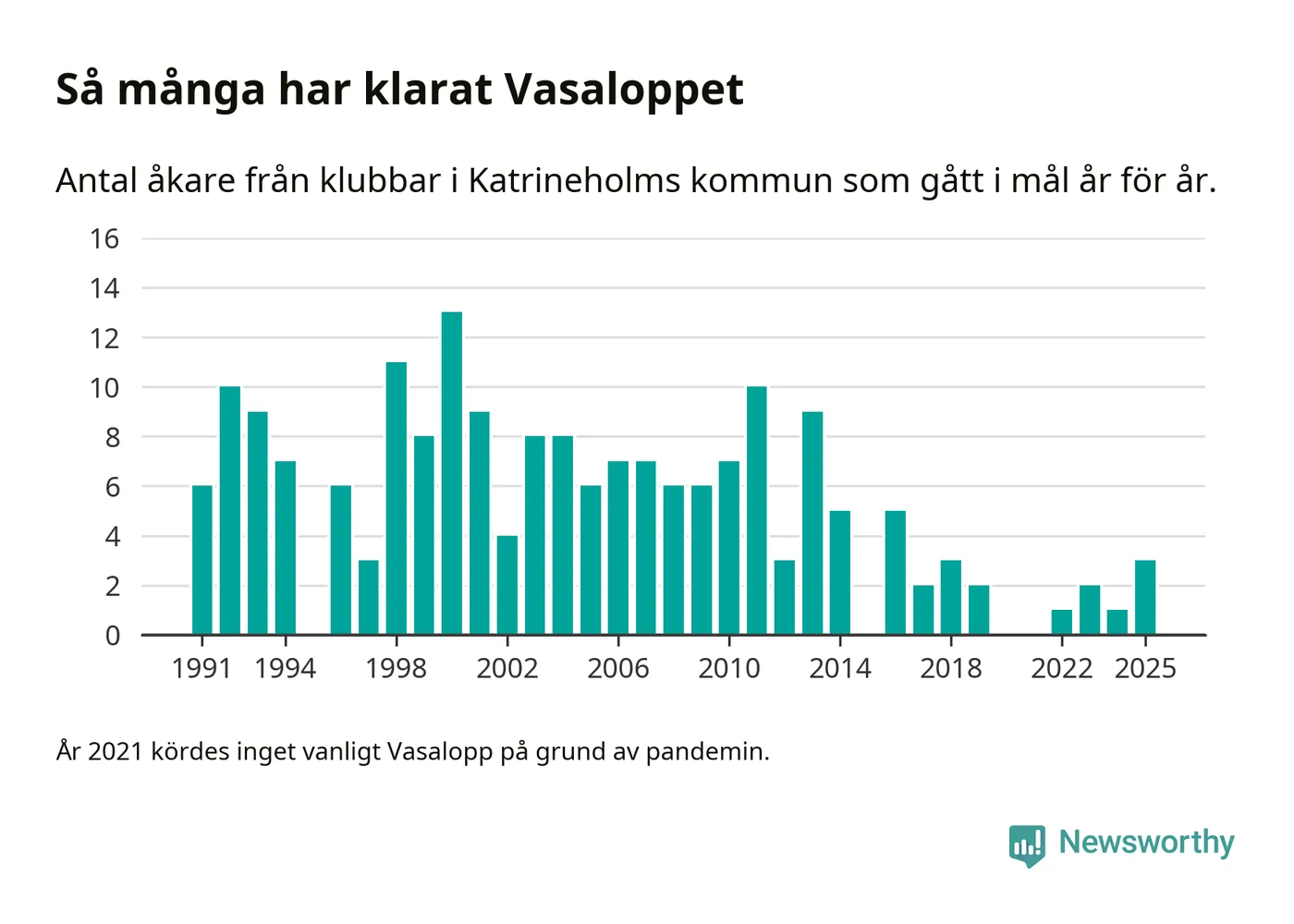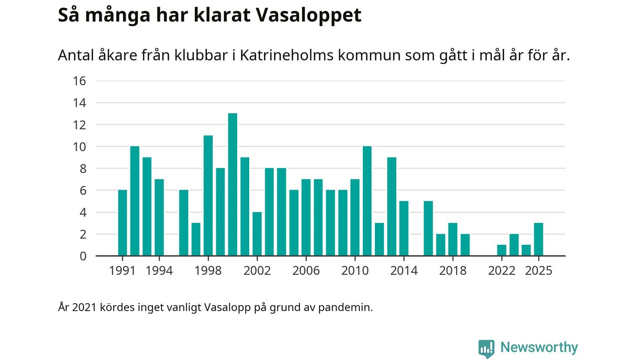 På söndag går starten för det 102:a Vasaloppet. Newsworthy har samlat in och sammanställt samtliga Vasaloppsresultat sedan 1991. Det ger en unik bild av hur skidåkare från klubbar i Katrineholms kommun har klarat sig genom åren.