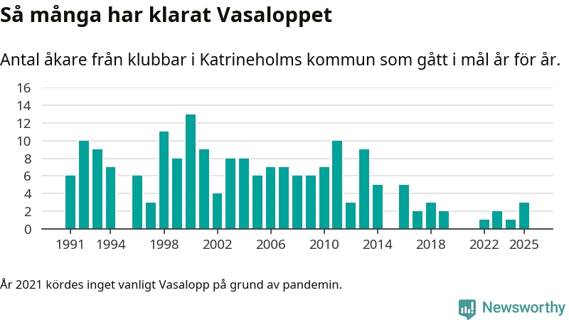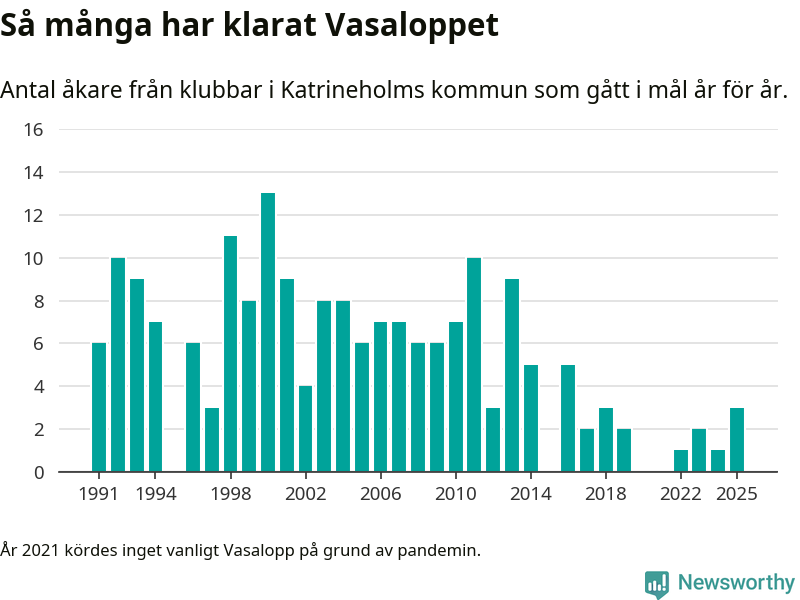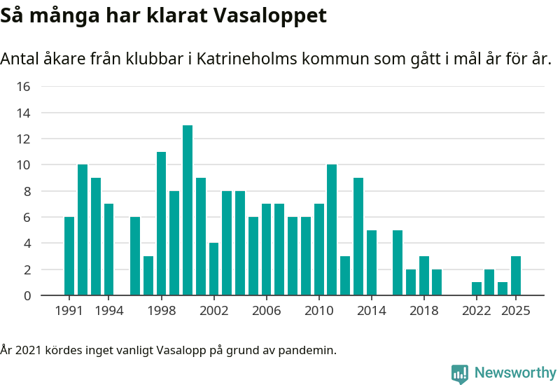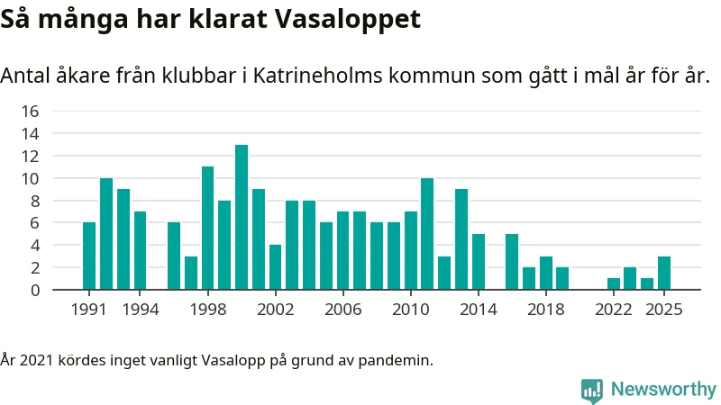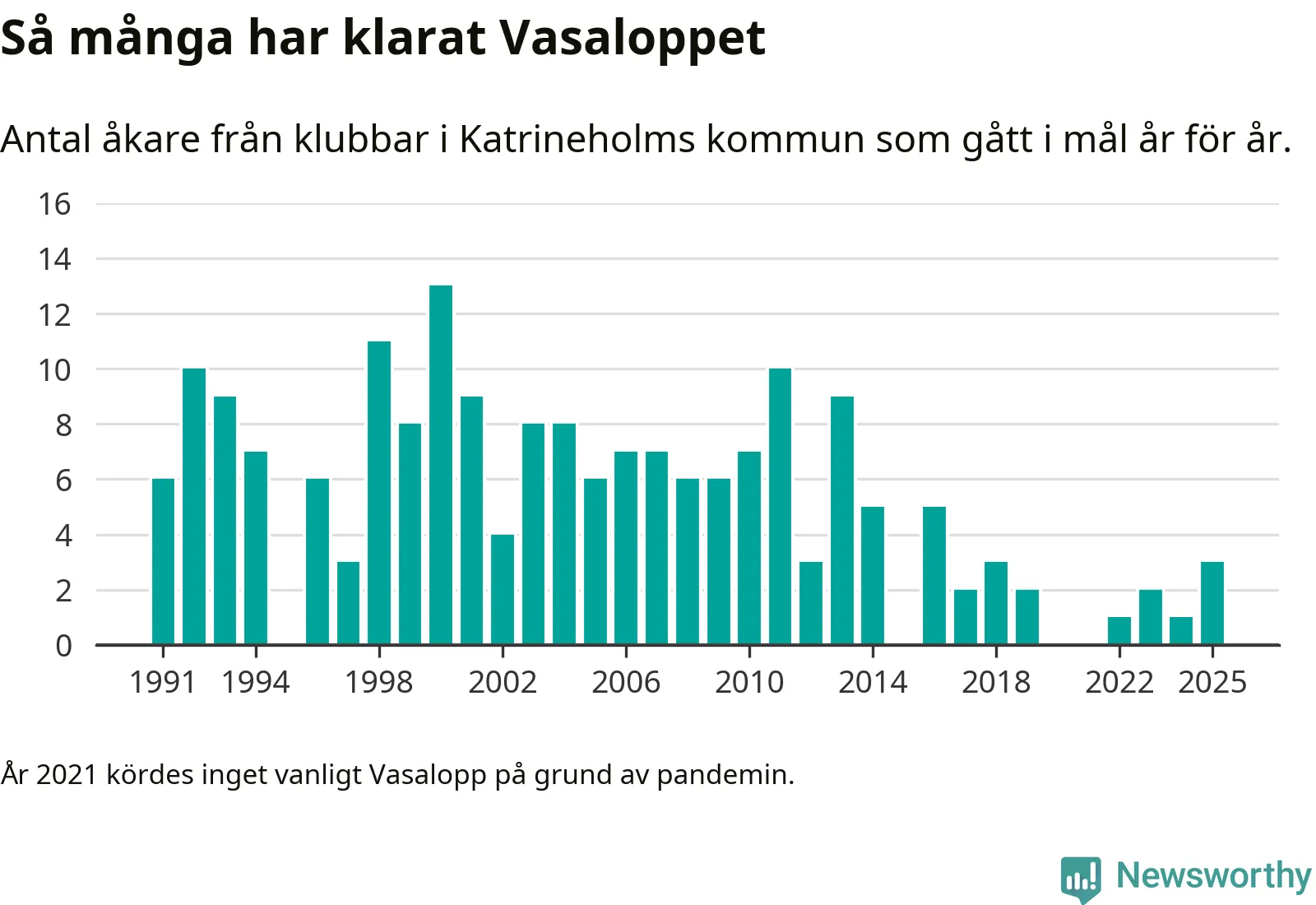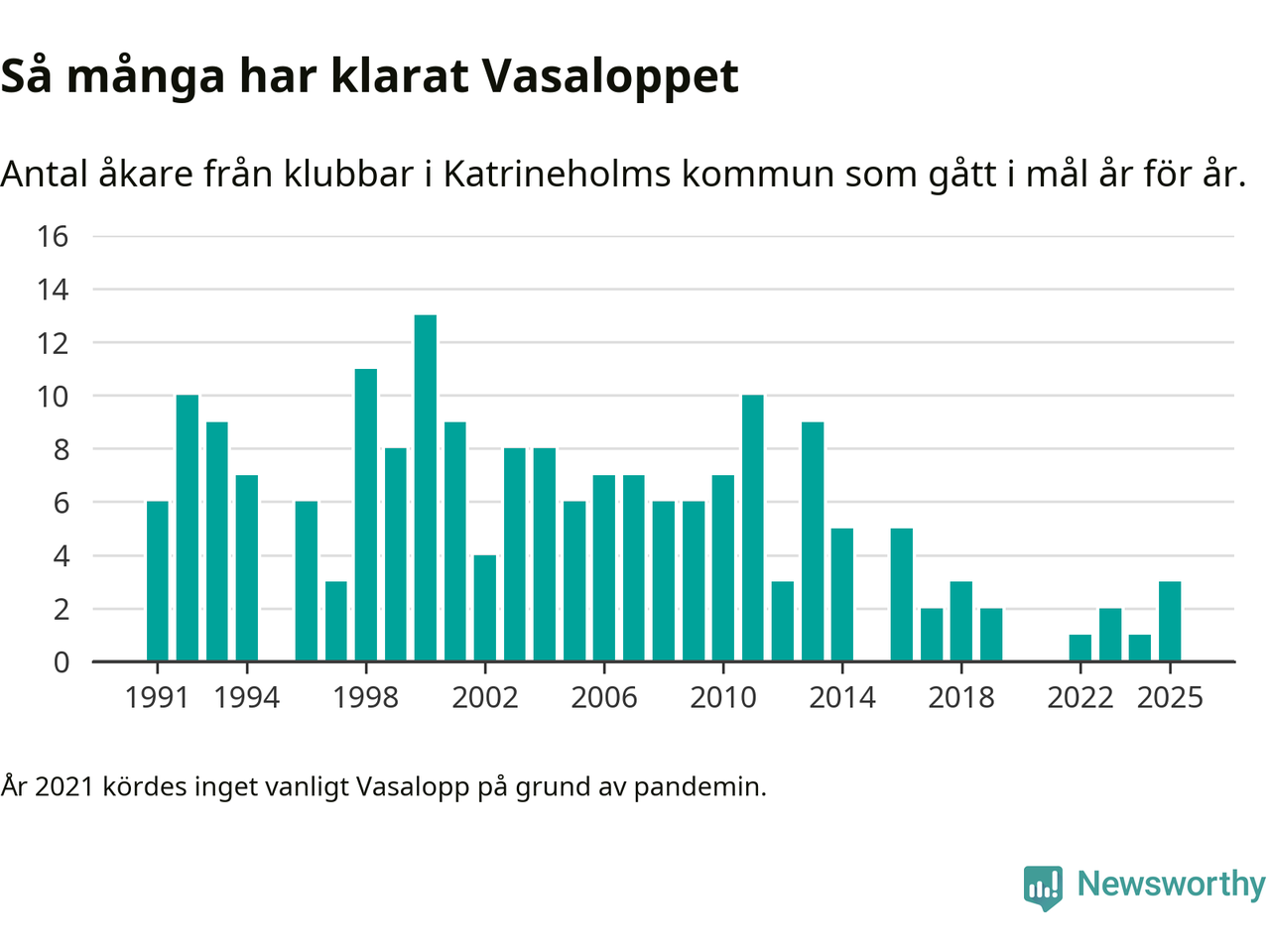 På söndag går starten för det 102:a Vasaloppet. Newsworthy har samlat in och sammanställt samtliga Vasaloppsresultat sedan 1991. Det ger en unik bild av hur skidåkare från klubbar i Katrineholms kommun har klarat sig genom åren.