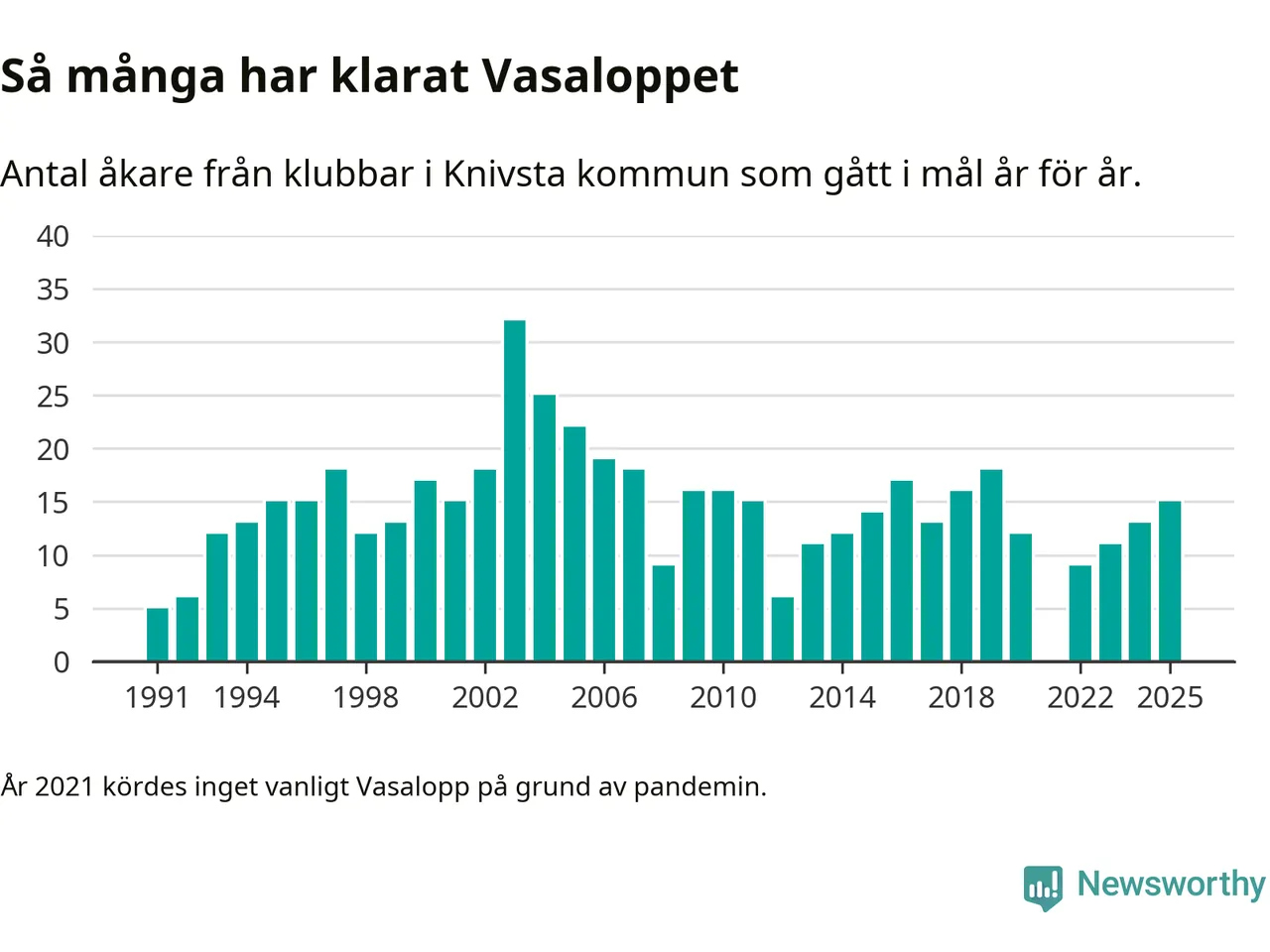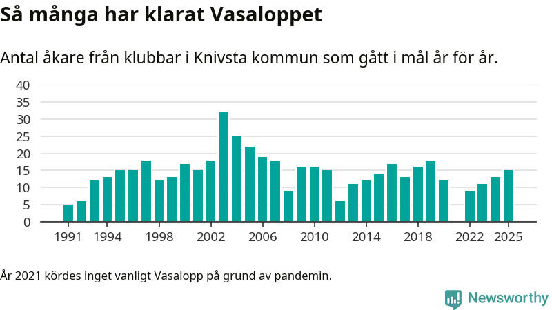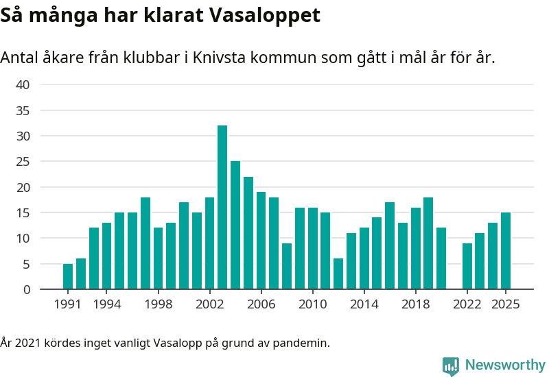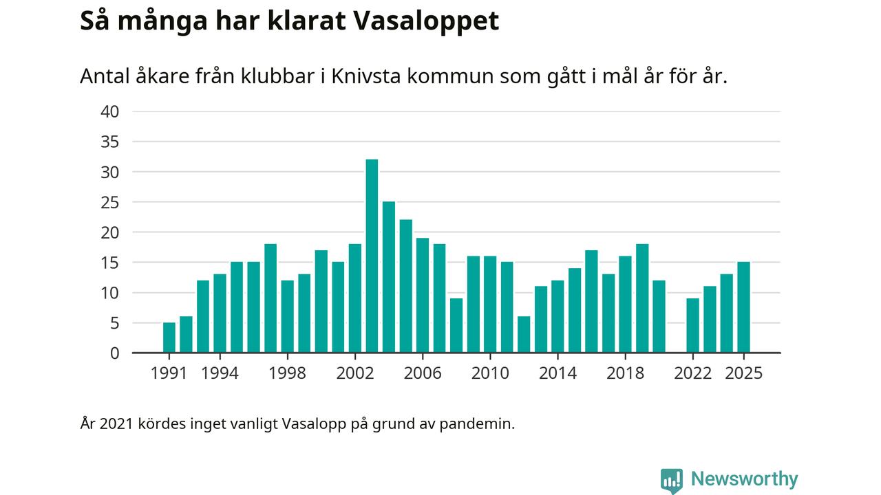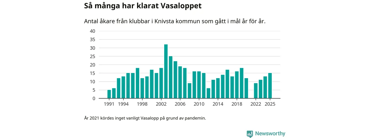 På söndag går starten för det 102:a Vasaloppet. Newsworthy har samlat in och sammanställt samtliga Vasaloppsresultat sedan 1991. Det ger en unik bild av hur skidåkare från klubbar i Knivsta kommun har klarat sig genom åren.