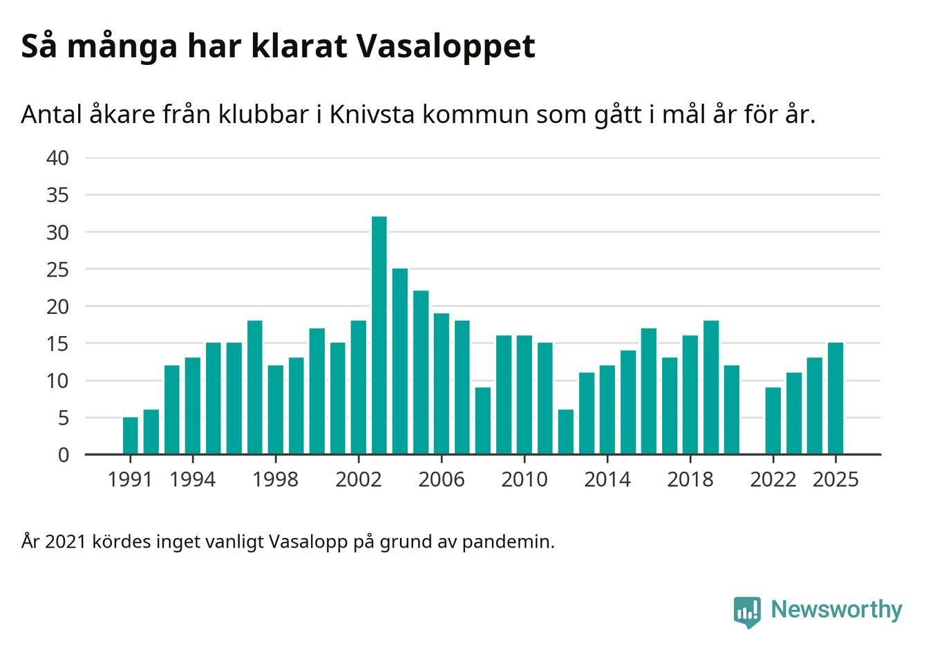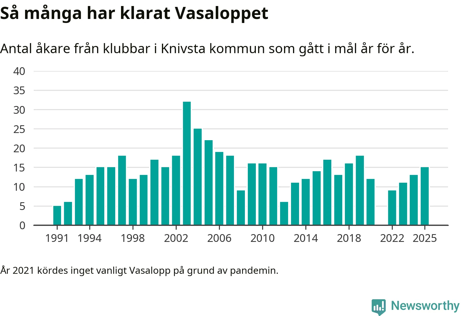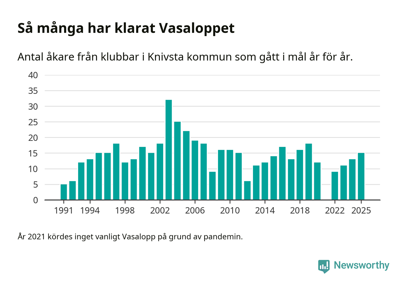 På söndag går starten för det 102:a Vasaloppet. Newsworthy har samlat in och sammanställt samtliga Vasaloppsresultat sedan 1991. Det ger en unik bild av hur skidåkare från klubbar i Knivsta kommun har klarat sig genom åren.