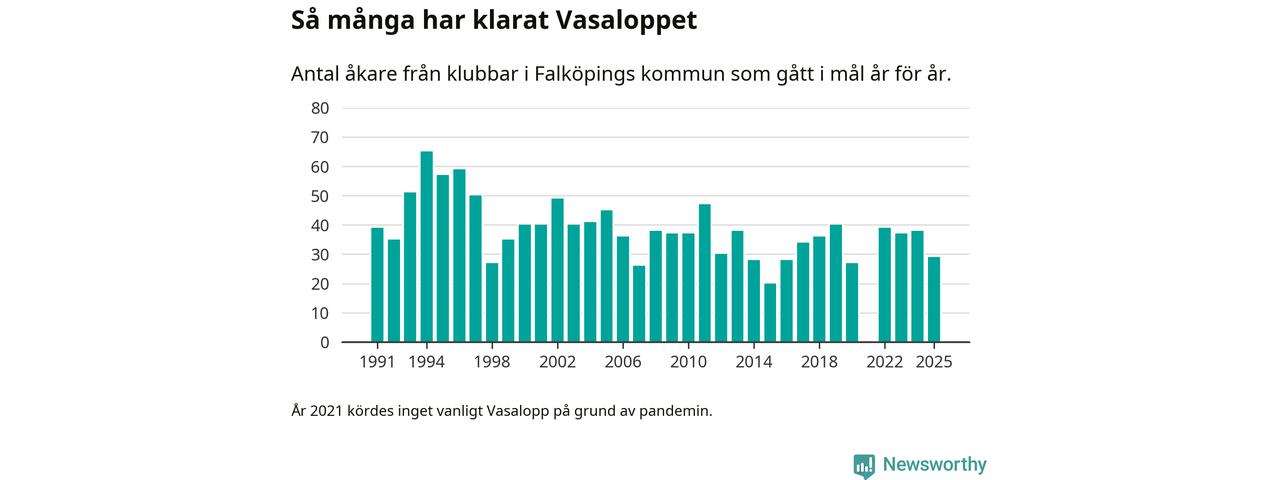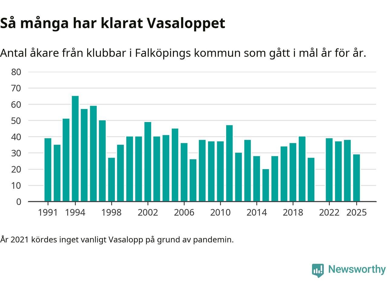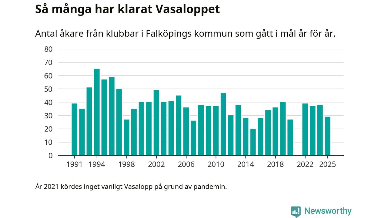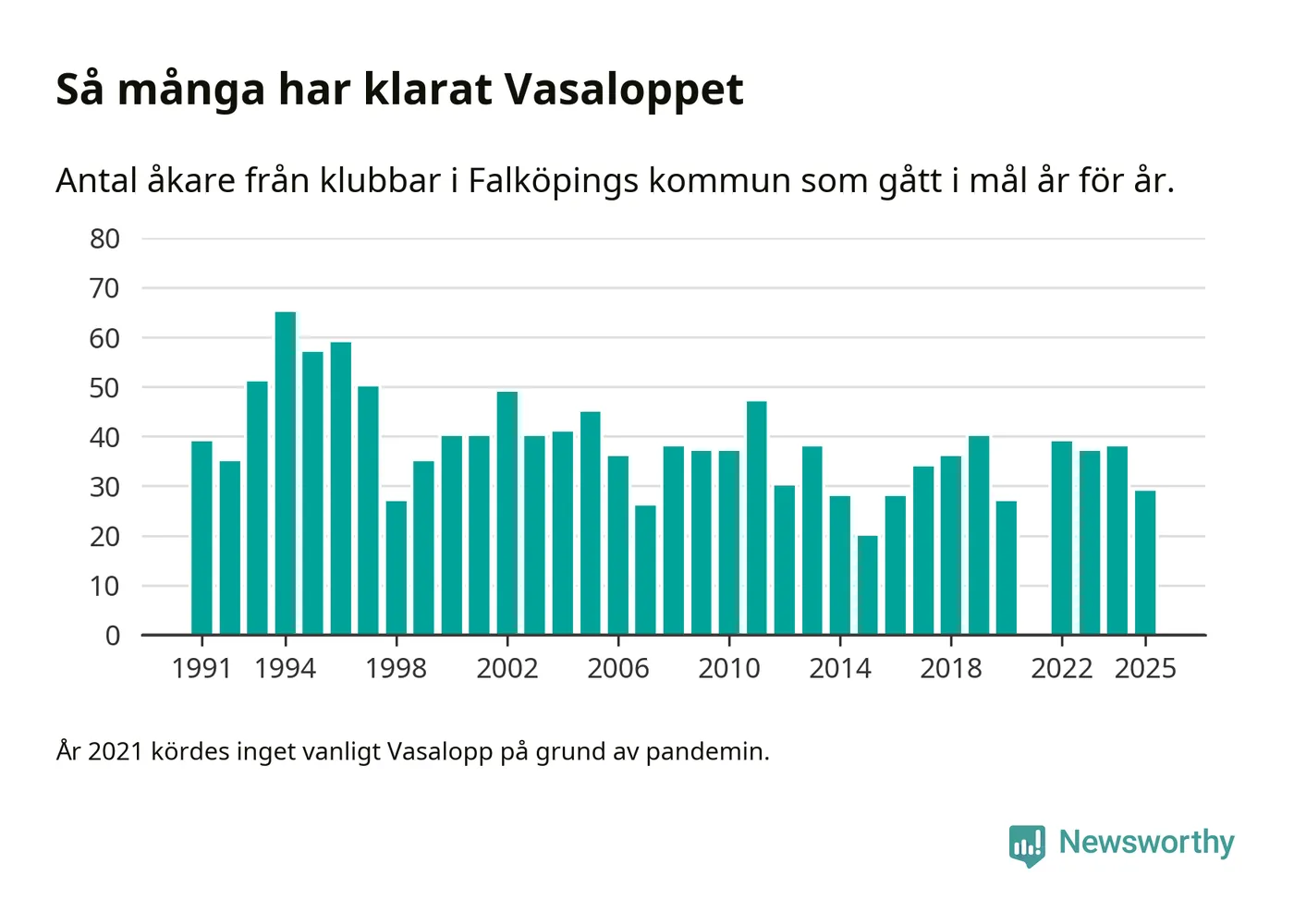 På söndag går starten för det 102:a Vasaloppet. Newsworthy har samlat in och sammanställt samtliga Vasaloppsresultat sedan 1991. Det ger en unik bild av hur skidåkare från klubbar i Falköpings kommun har klarat sig genom åren.
