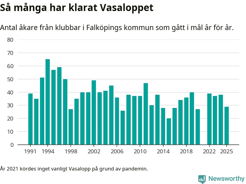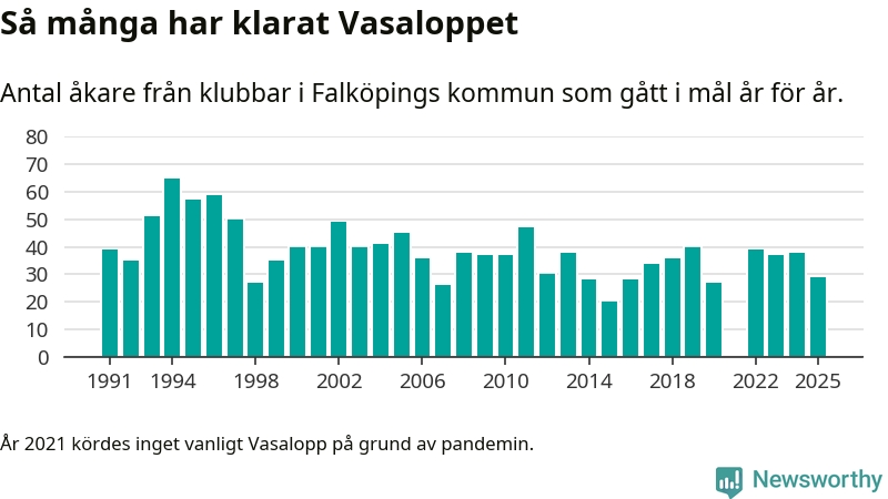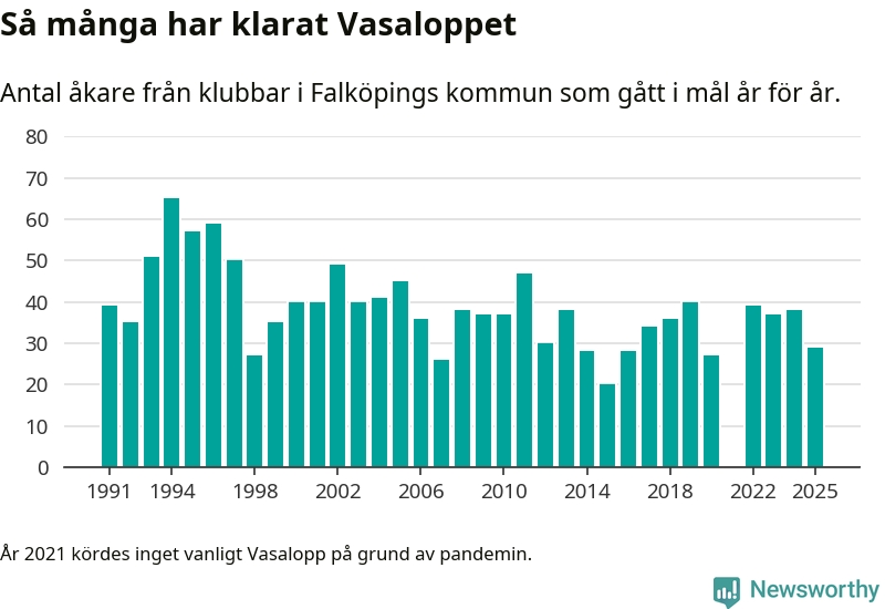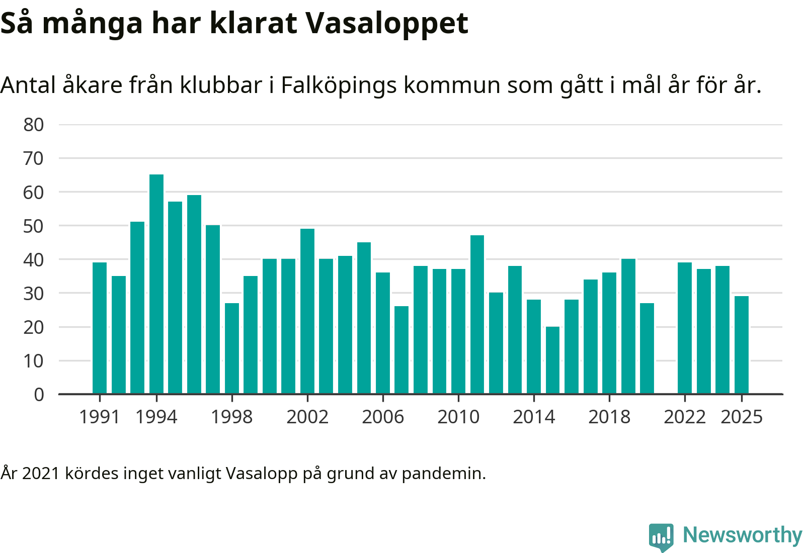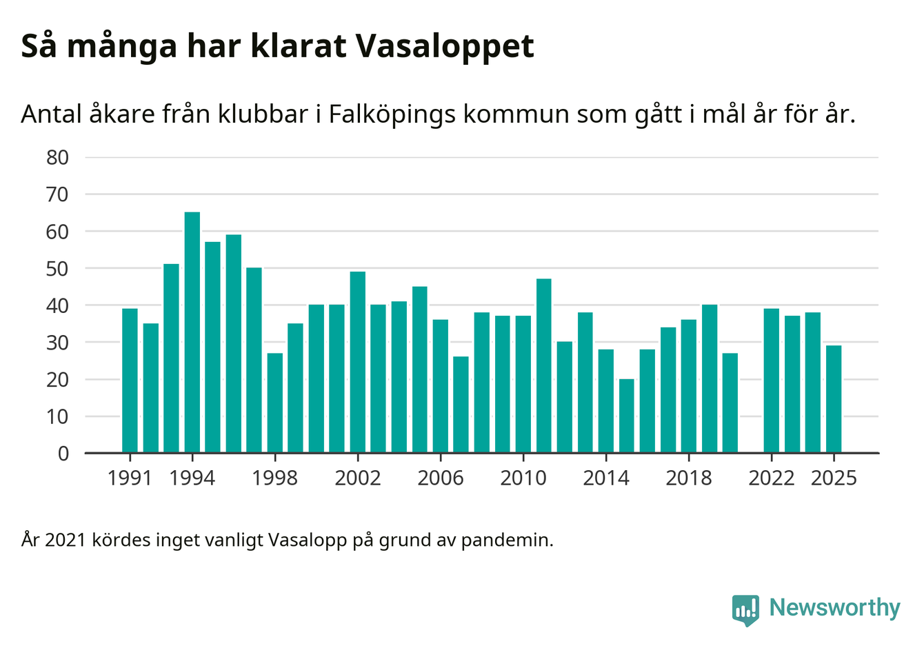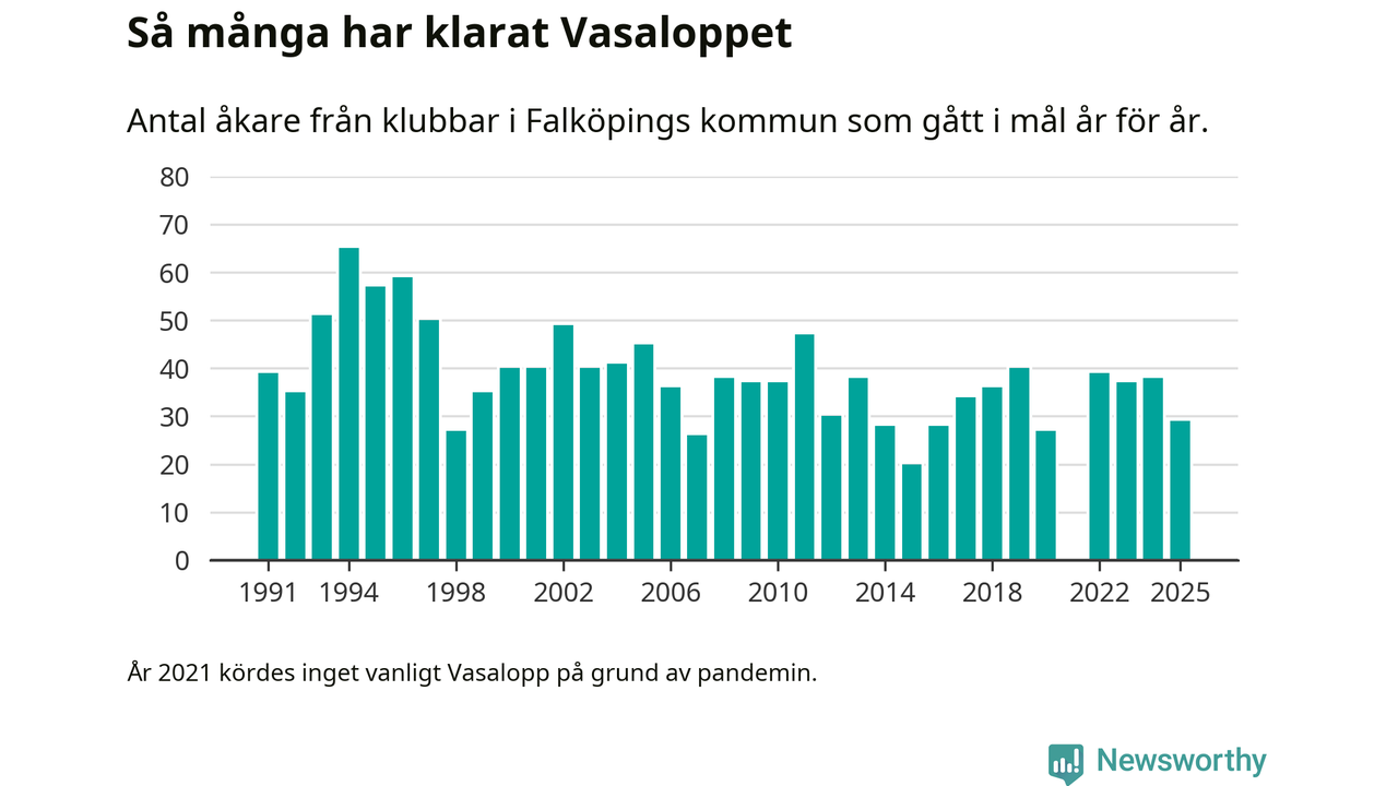 På söndag går starten för det 102:a Vasaloppet. Newsworthy har samlat in och sammanställt samtliga Vasaloppsresultat sedan 1991. Det ger en unik bild av hur skidåkare från klubbar i Falköpings kommun har klarat sig genom åren.