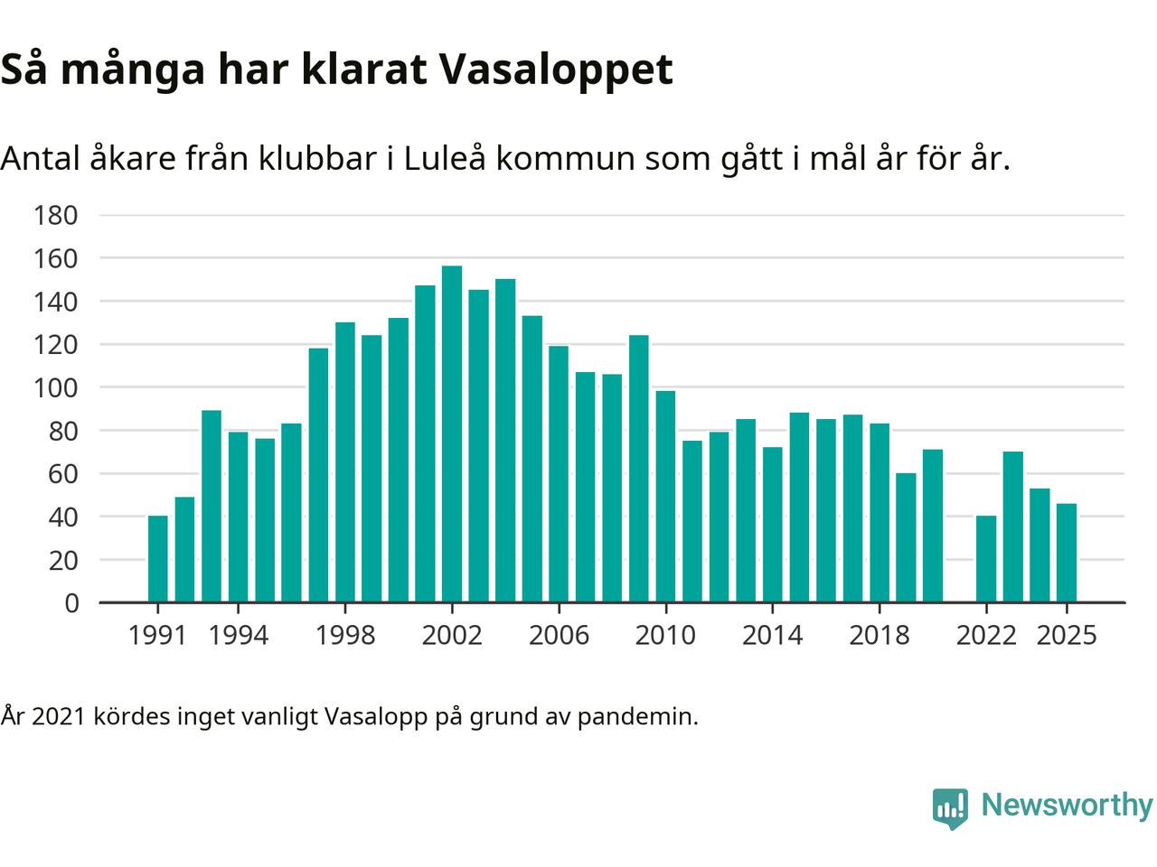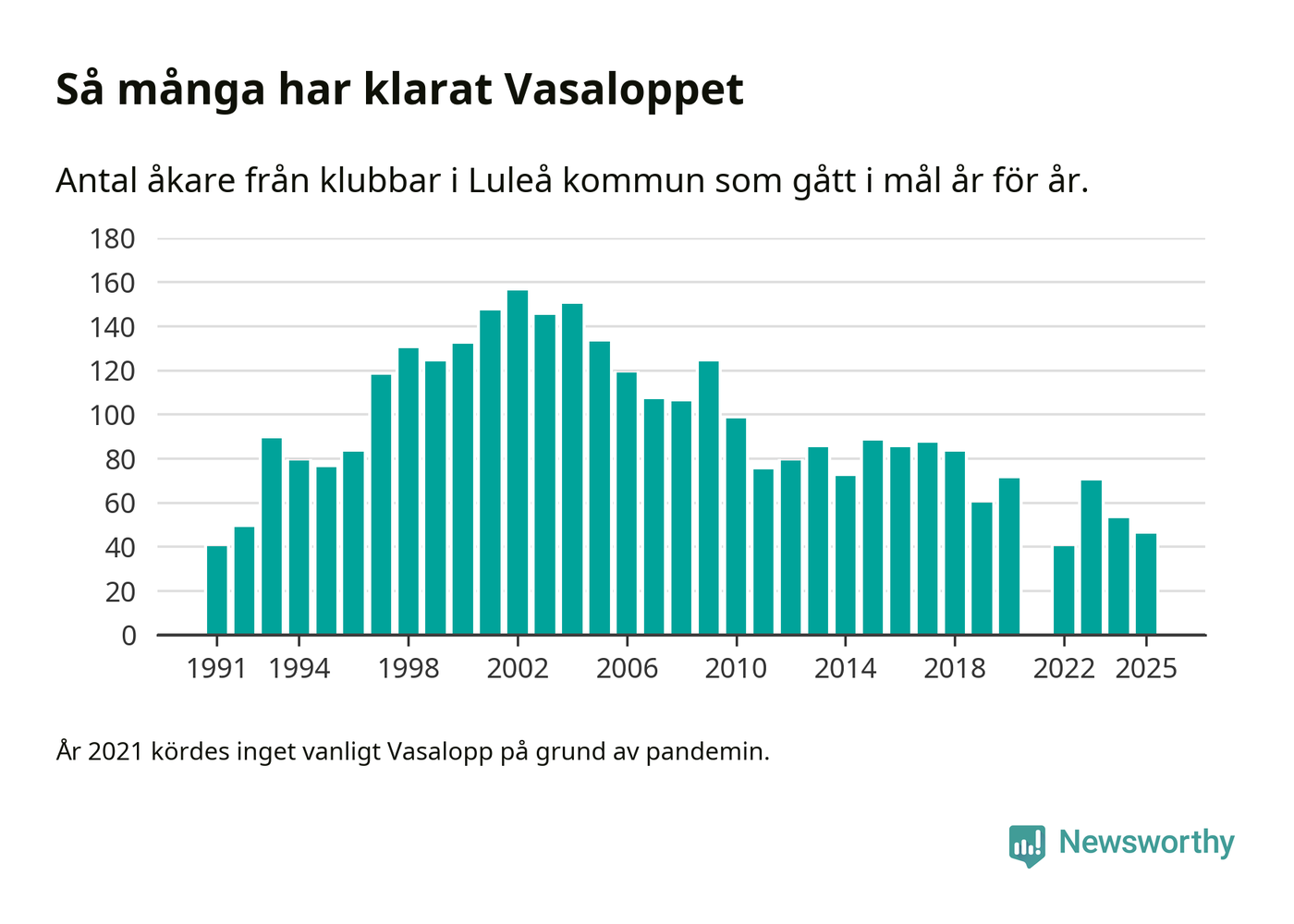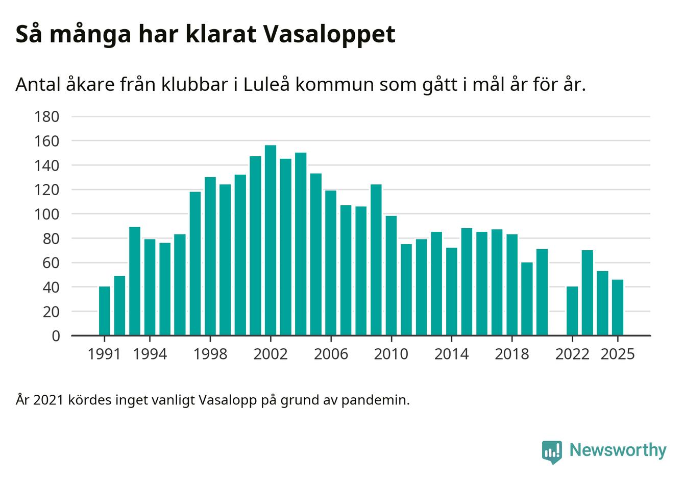 På söndag går starten för det 102:a Vasaloppet. Newsworthy har samlat in och sammanställt samtliga Vasaloppsresultat sedan 1991. Det ger en unik bild av hur skidåkare från klubbar i Luleå kommun har klarat sig genom åren.