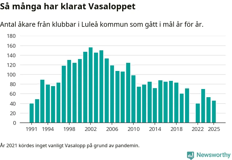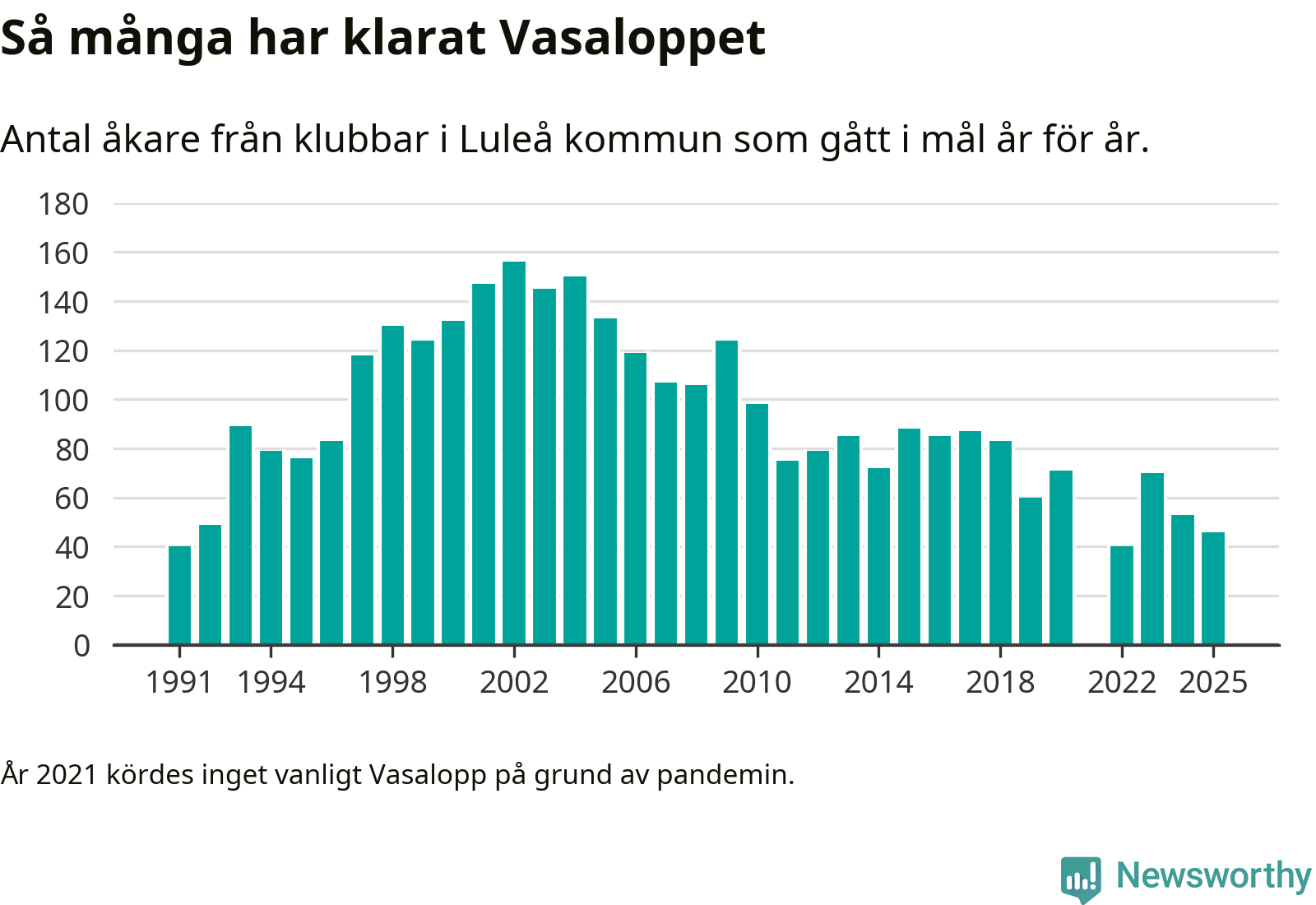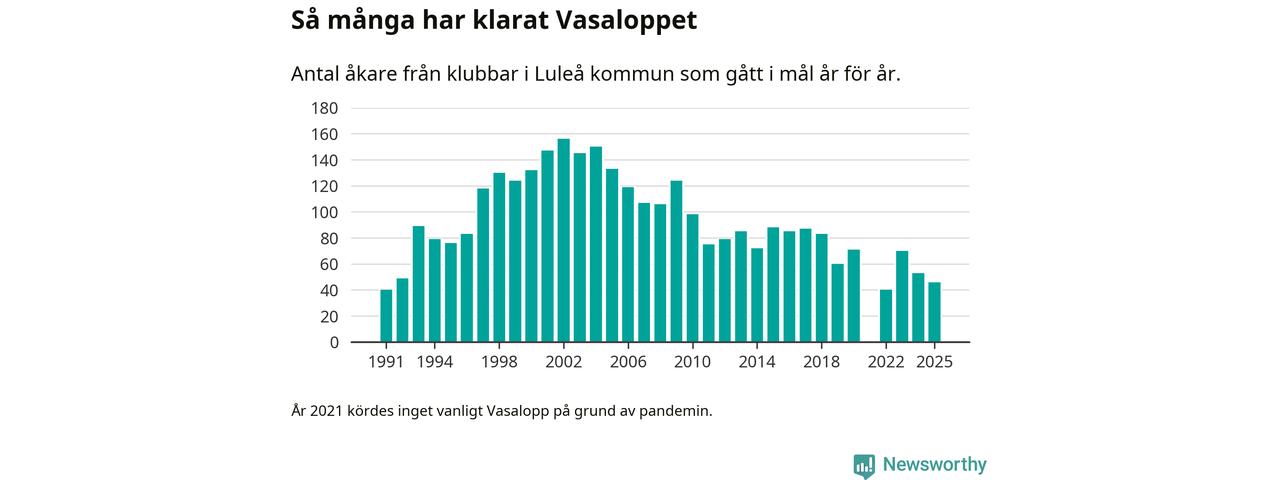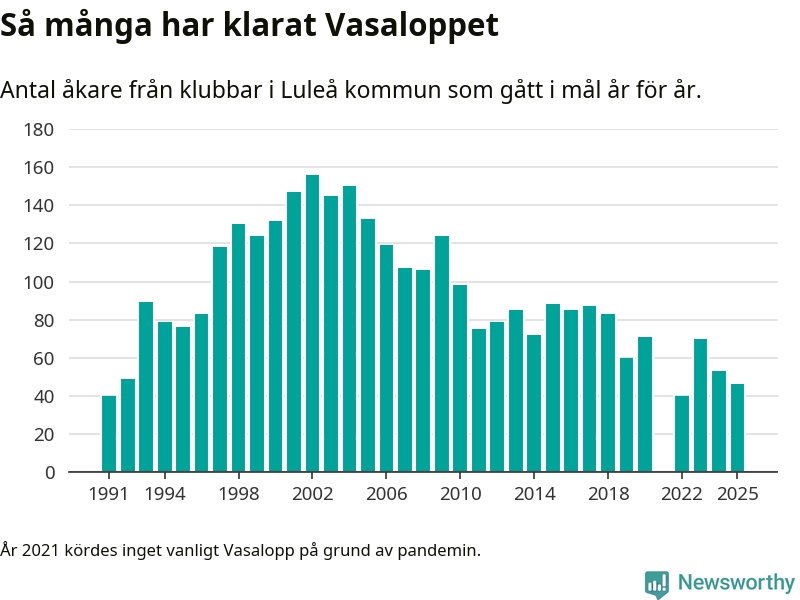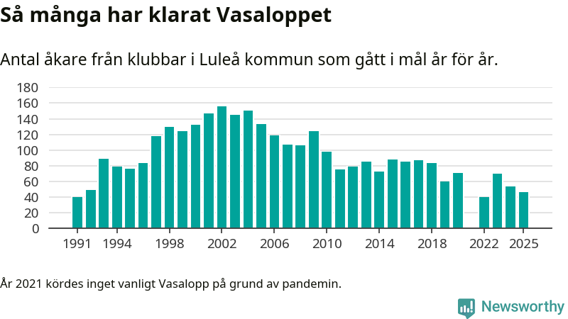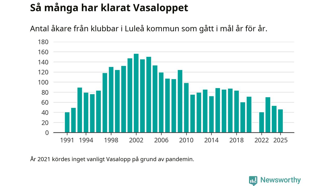 På söndag går starten för det 102:a Vasaloppet. Newsworthy har samlat in och sammanställt samtliga Vasaloppsresultat sedan 1991. Det ger en unik bild av hur skidåkare från klubbar i Luleå kommun har klarat sig genom åren.