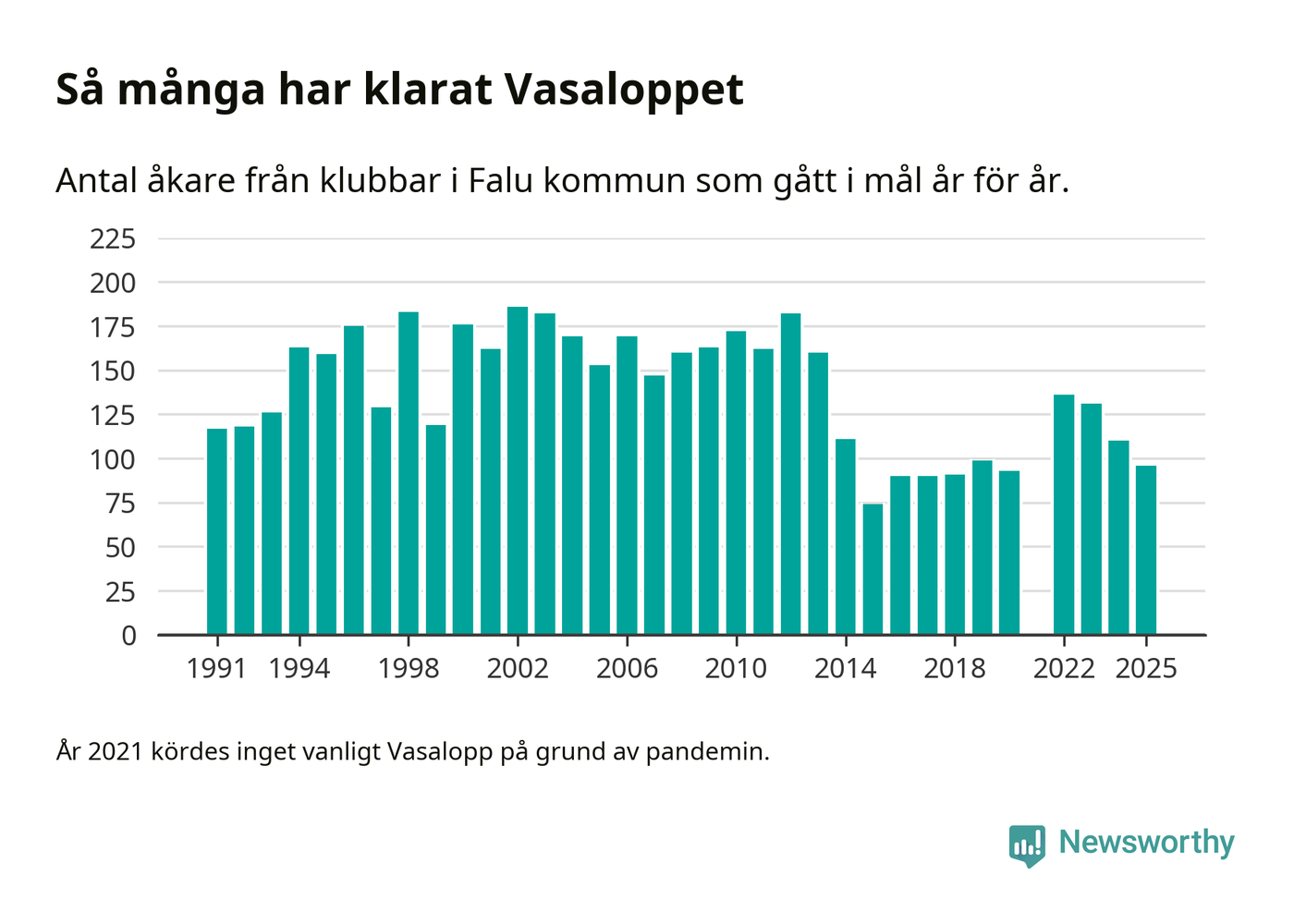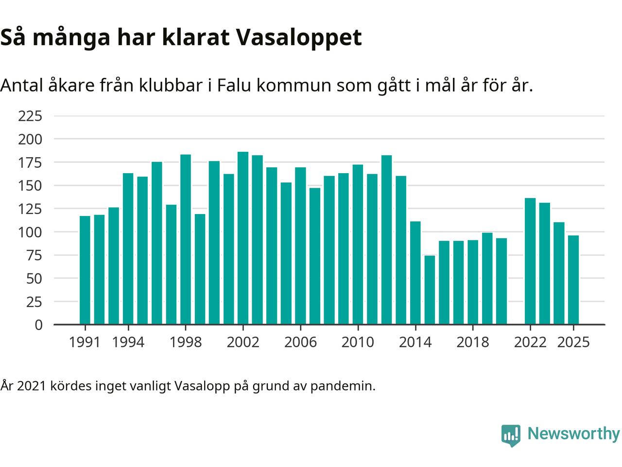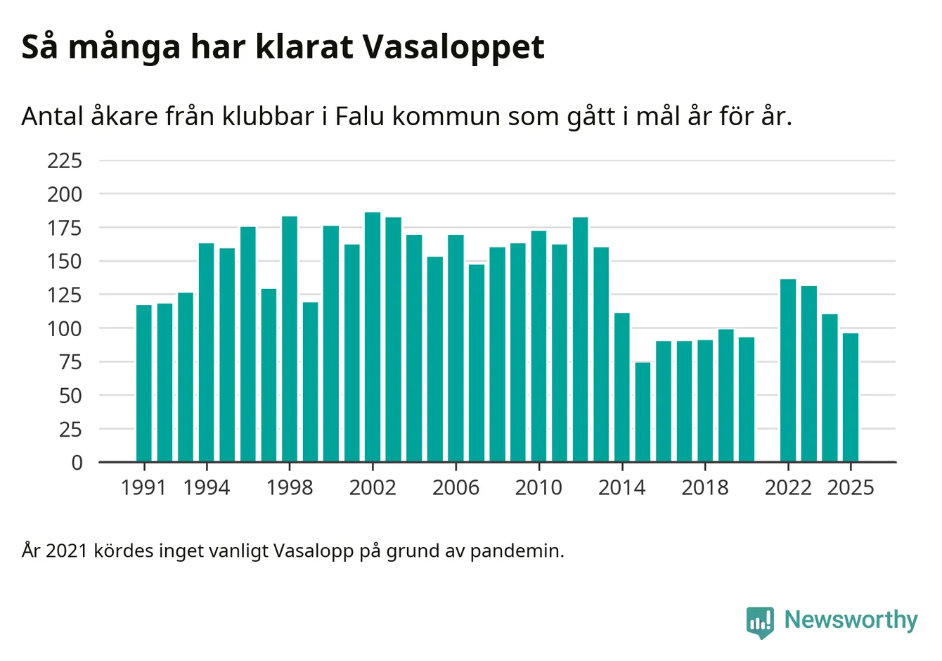 På söndag går starten för det 102:a Vasaloppet. Newsworthy har samlat in och sammanställt samtliga Vasaloppsresultat sedan 1991. Det ger en unik bild av hur skidåkare från klubbar i Falu kommun har klarat sig genom åren.