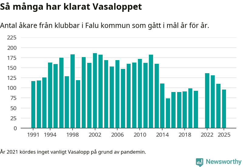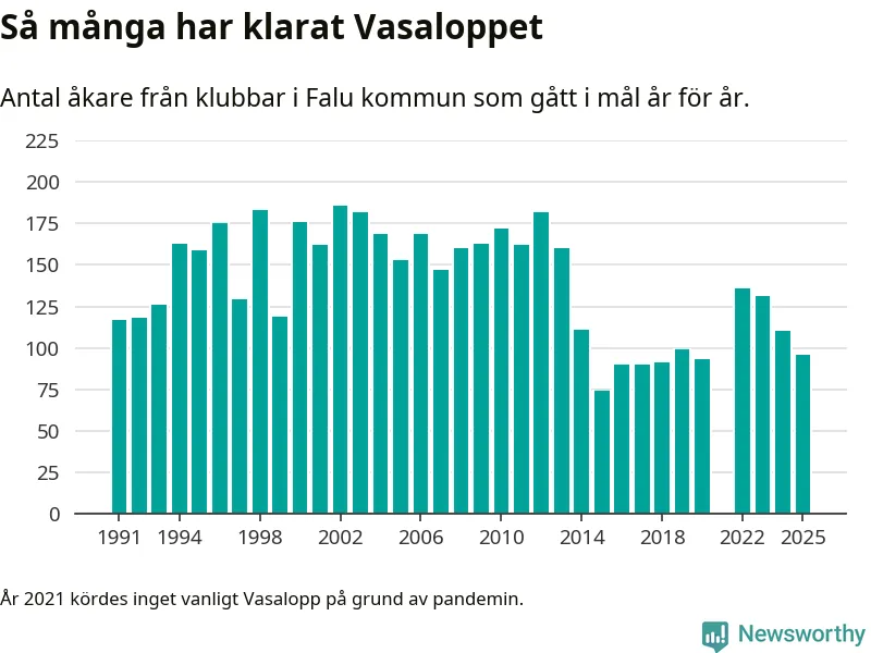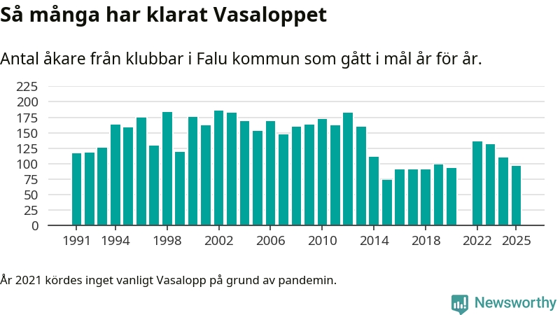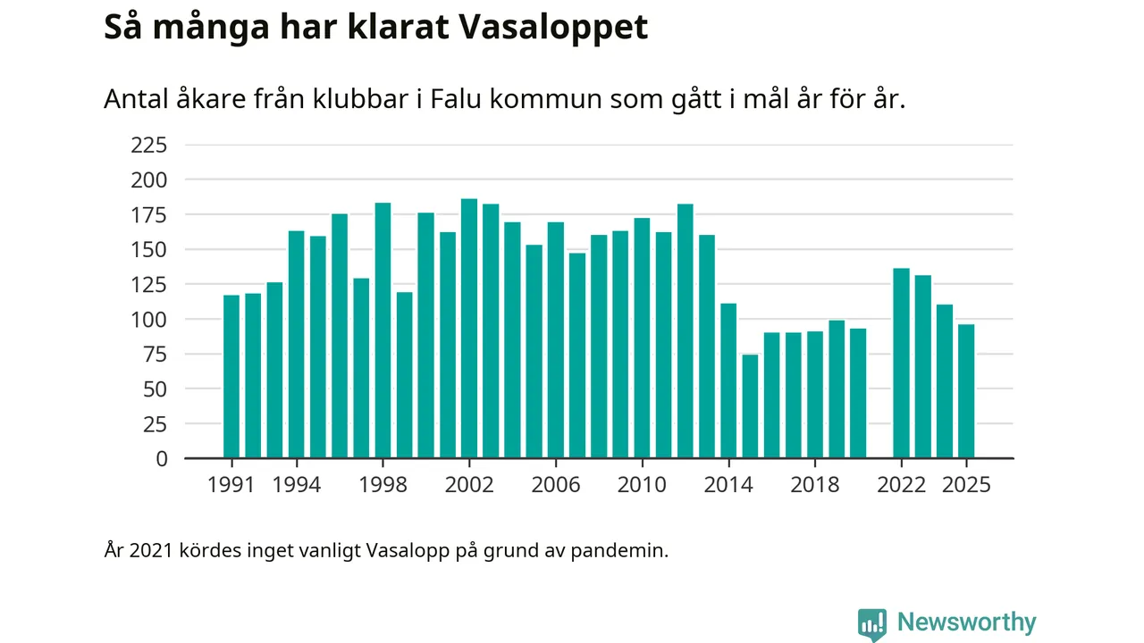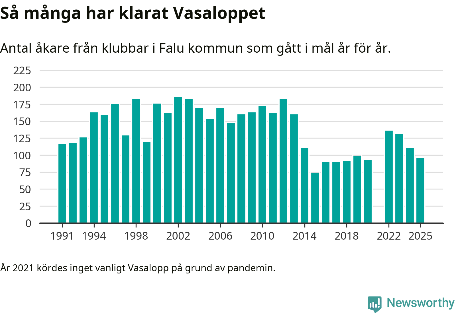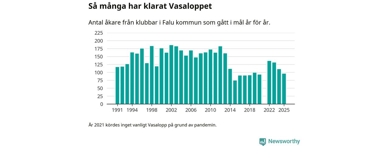 På söndag går starten för det 102:a Vasaloppet. Newsworthy har samlat in och sammanställt samtliga Vasaloppsresultat sedan 1991. Det ger en unik bild av hur skidåkare från klubbar i Falu kommun har klarat sig genom åren.
