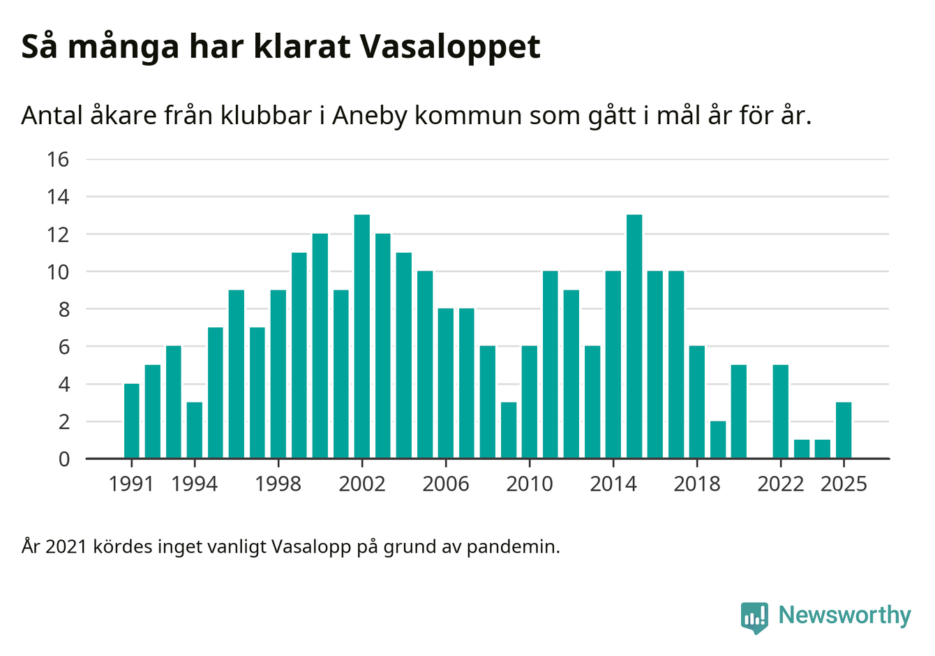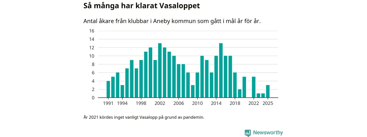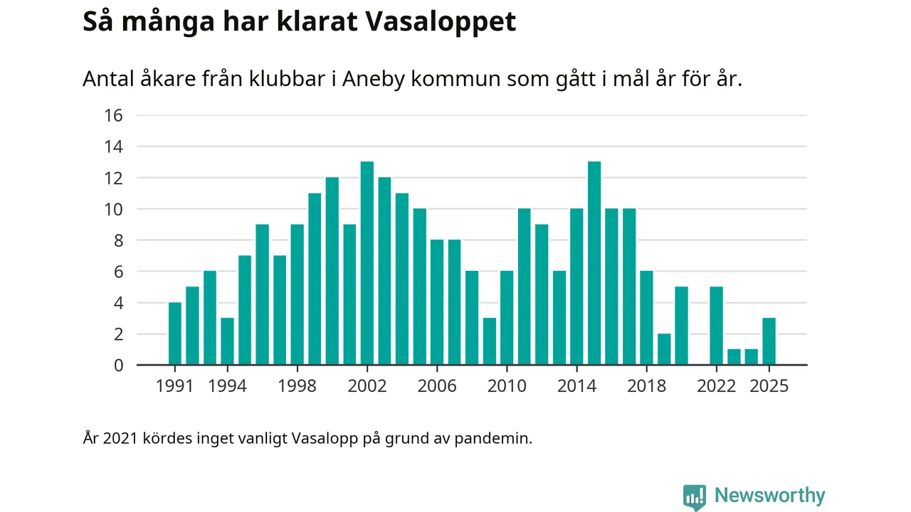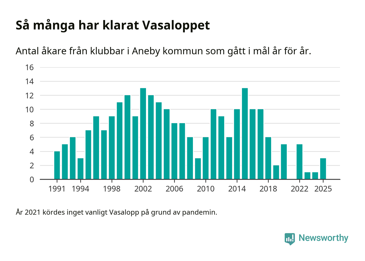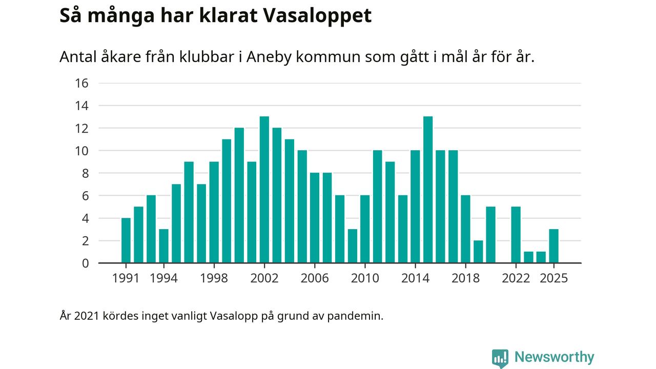 På söndag går starten för det 102:a Vasaloppet. Newsworthy har samlat in och sammanställt samtliga Vasaloppsresultat sedan 1991. Det ger en unik bild av hur skidåkare från klubbar i Aneby kommun har klarat sig genom åren.