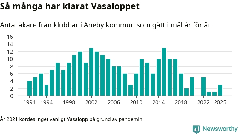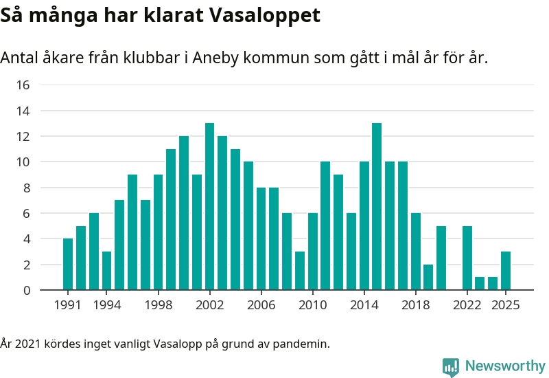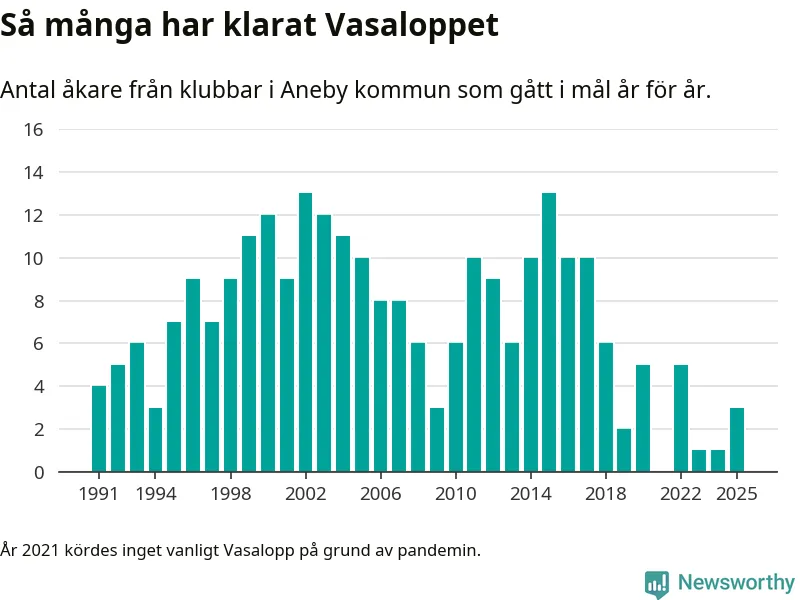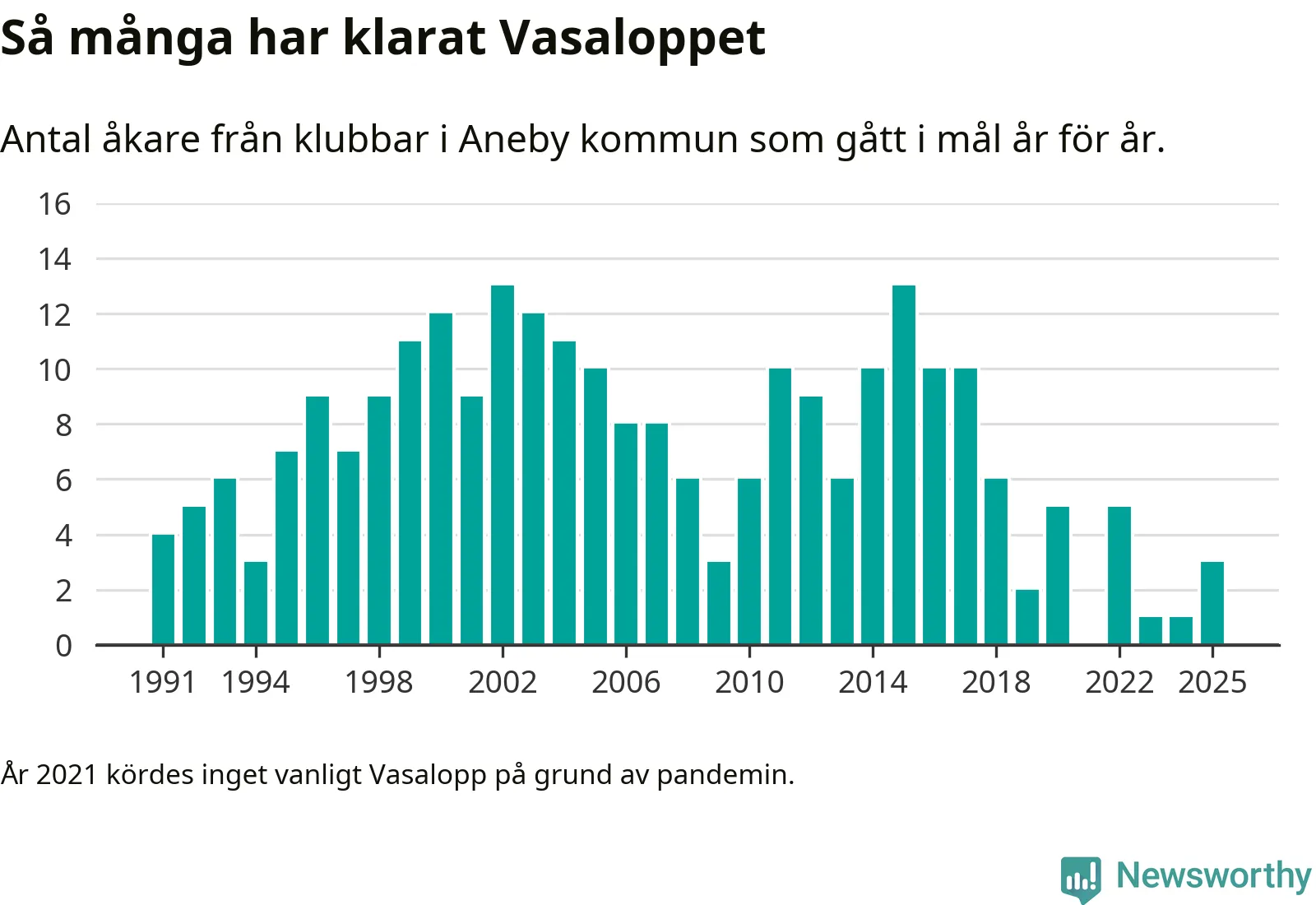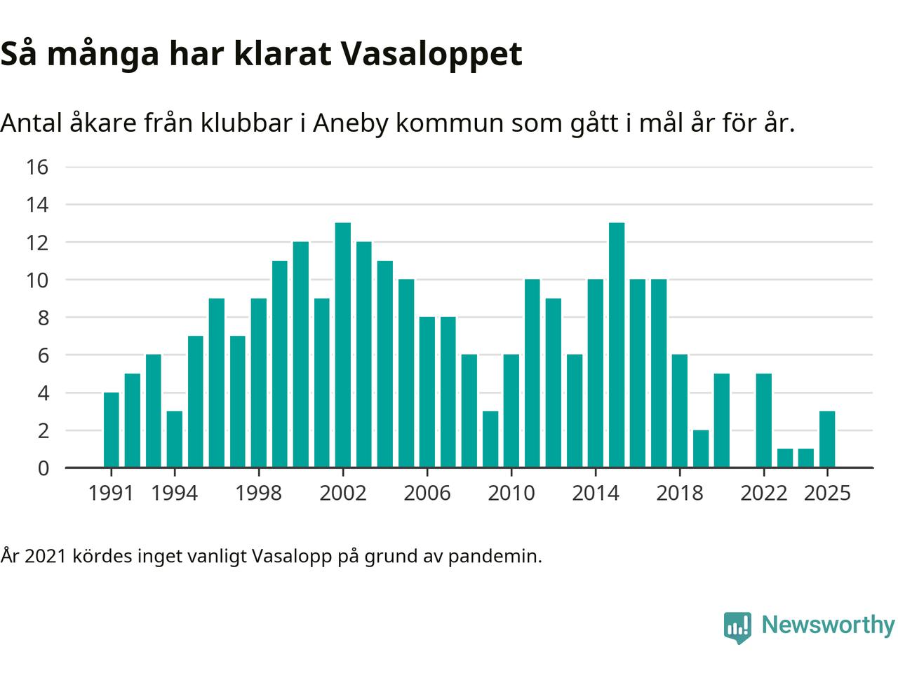 På söndag går starten för det 102:a Vasaloppet. Newsworthy har samlat in och sammanställt samtliga Vasaloppsresultat sedan 1991. Det ger en unik bild av hur skidåkare från klubbar i Aneby kommun har klarat sig genom åren.