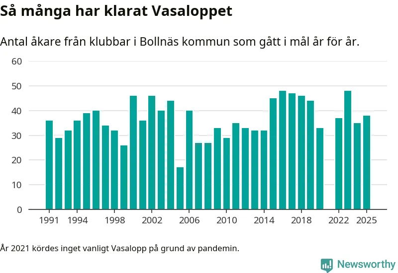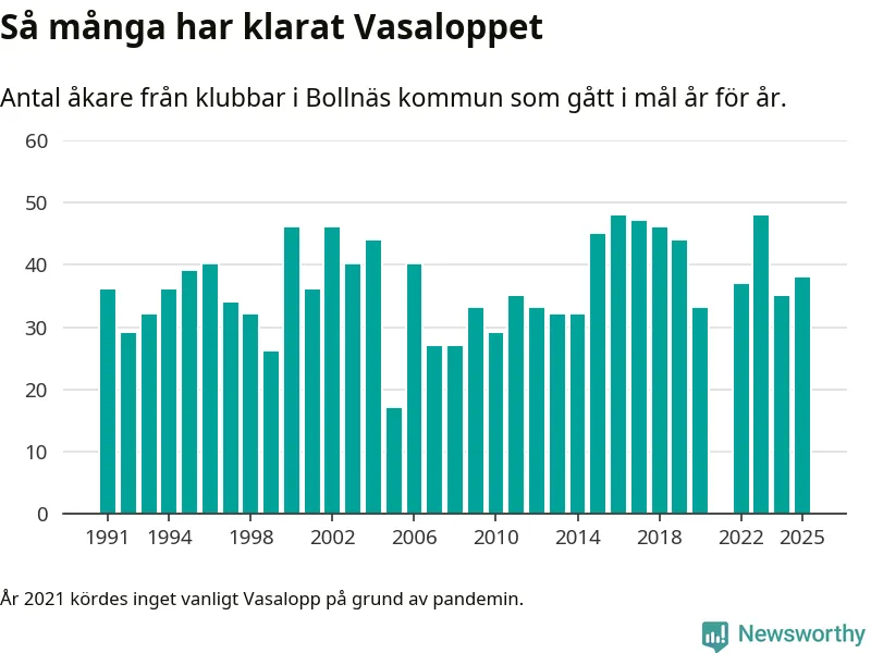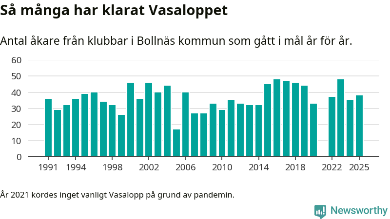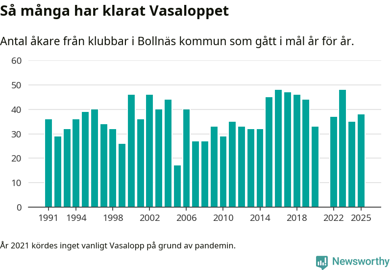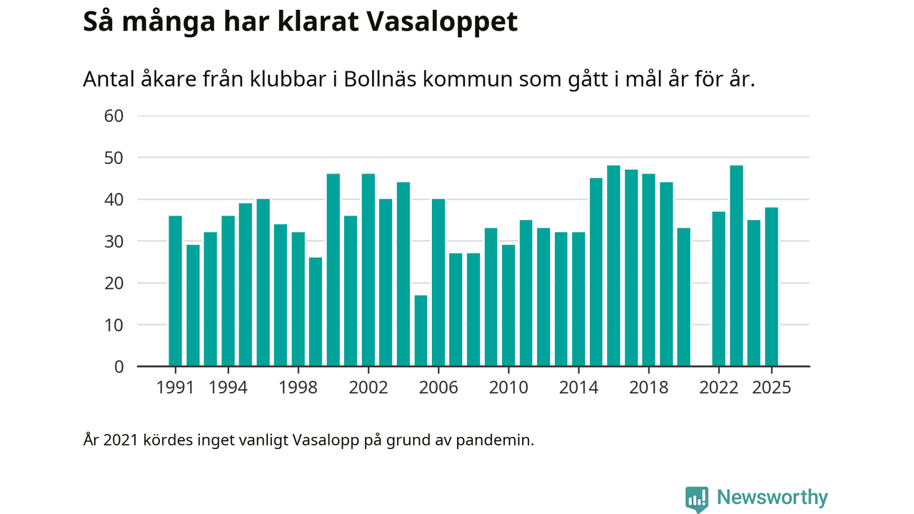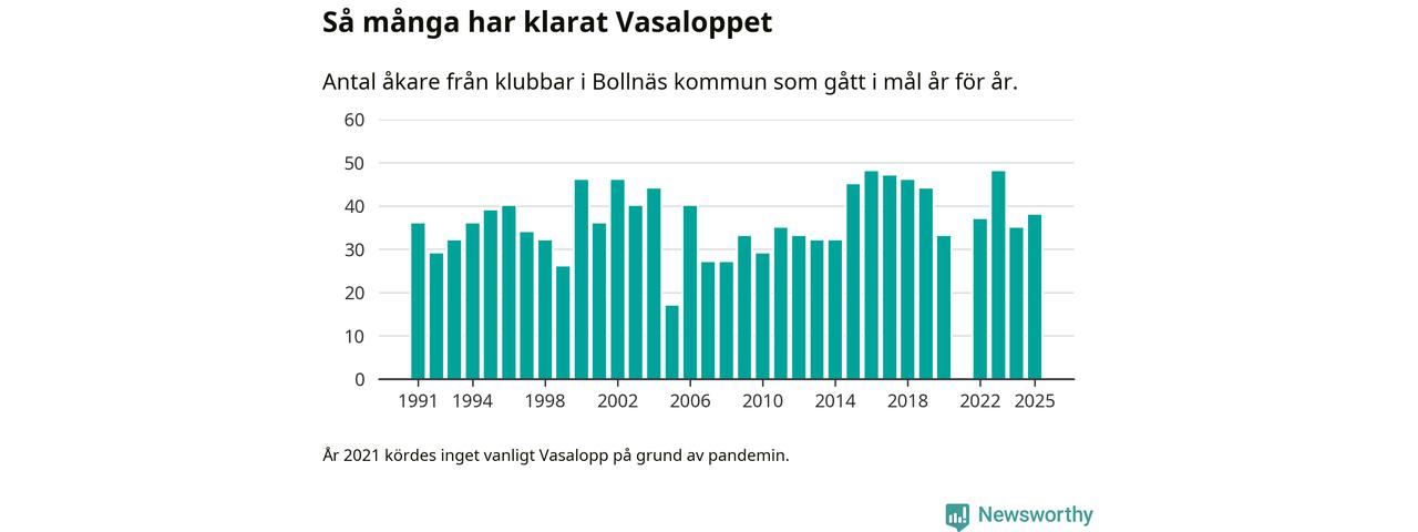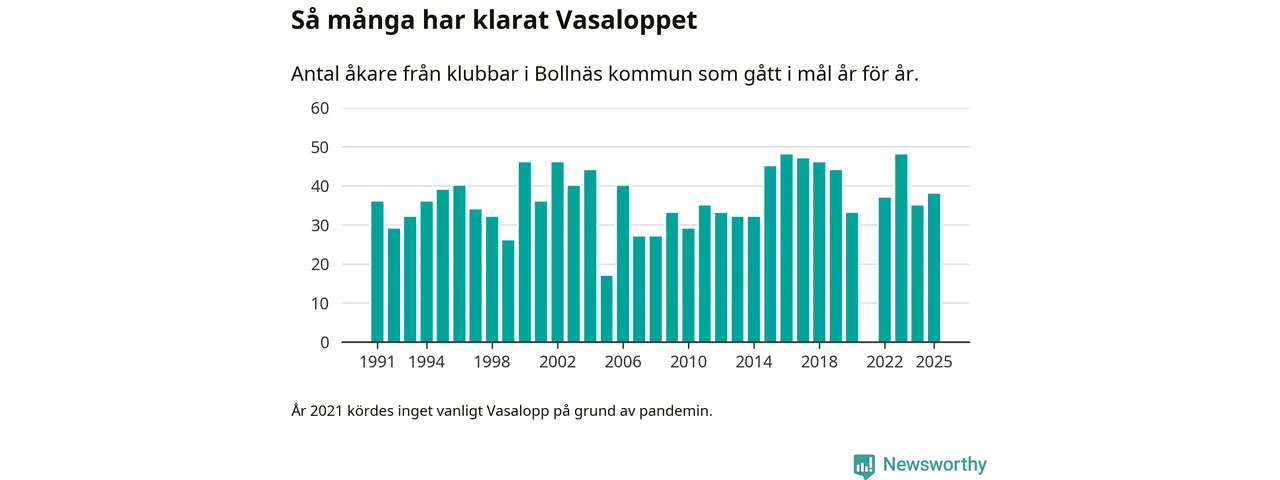 På söndag går starten för det 102:a Vasaloppet. Newsworthy har samlat in och sammanställt samtliga Vasaloppsresultat sedan 1991. Det ger en unik bild av hur skidåkare från klubbar i Bollnäs kommun har klarat sig genom åren.